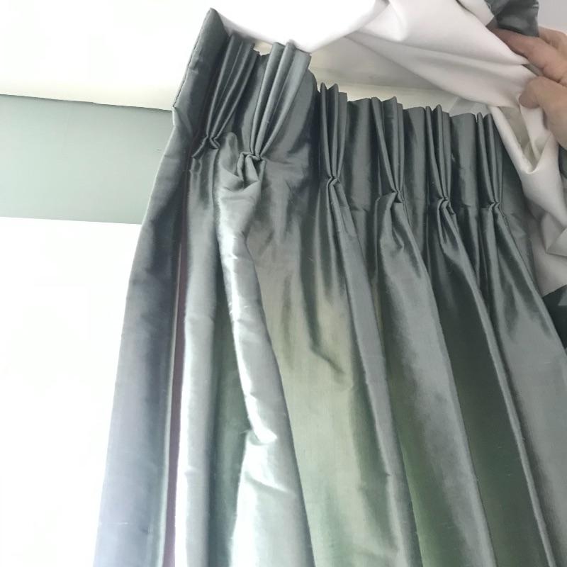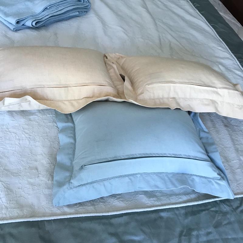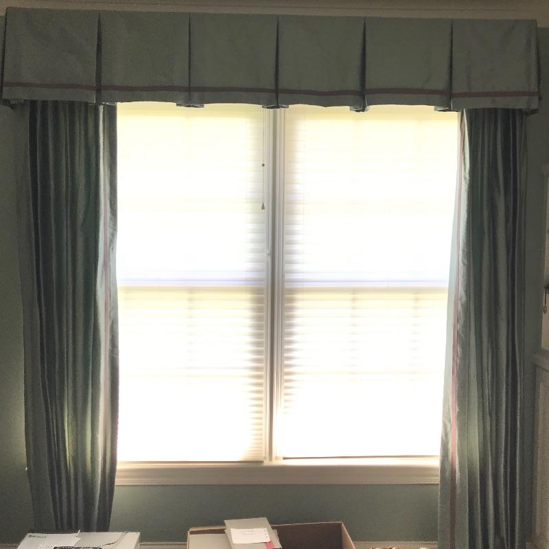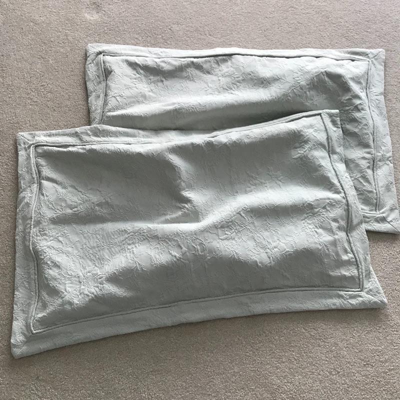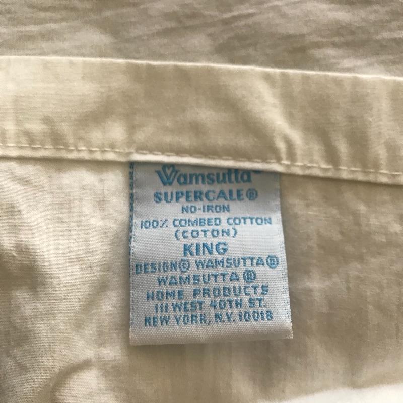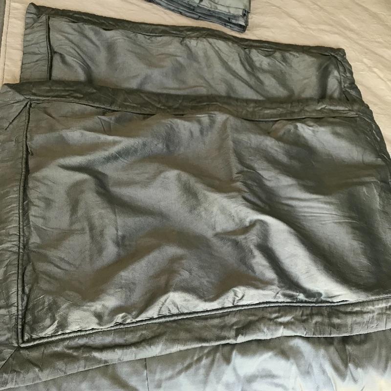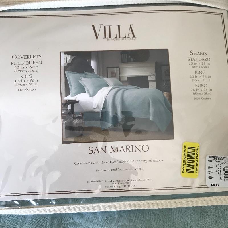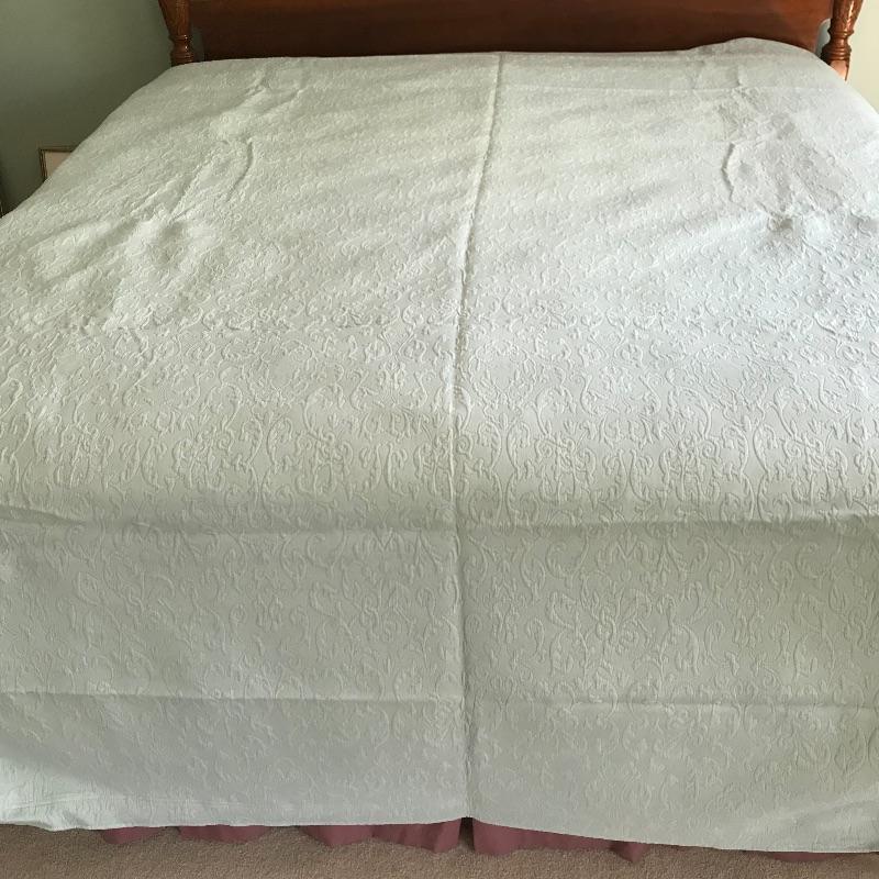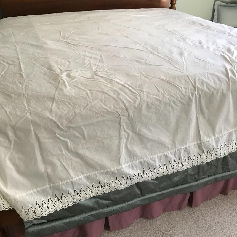 Lovely satin-esque bedroom linens and curtains. There are a couple different color themes in this lot with the same satin and cotton style. Mint green can be found on the bed cover, 400 count king sheets, king pillow shams and curtains. The bed cover has a tear noted in photos that was once repaired with a vinyl type material, but needs to be repaired, see images. There are also mint green bed-skirt curtains to be attached on dowels or curtain rods under the bed on a bed frame. Many Villa products found throughout this lot. The Villa king blanket is more of a baby blue with matching shams still in their package. Three small throw pillows and a Wasmuta decorative top sheet are included! The four post bed is not included but can be found in Lot-346. The four curtains are approximately 87” tall and have widths that measure between 47” and 49”. The wood valences and curtain rods are attached to the walls, please bring various screw drivers to remove. Valence frames are 80” long and valence curtains hang down approximately 14”.