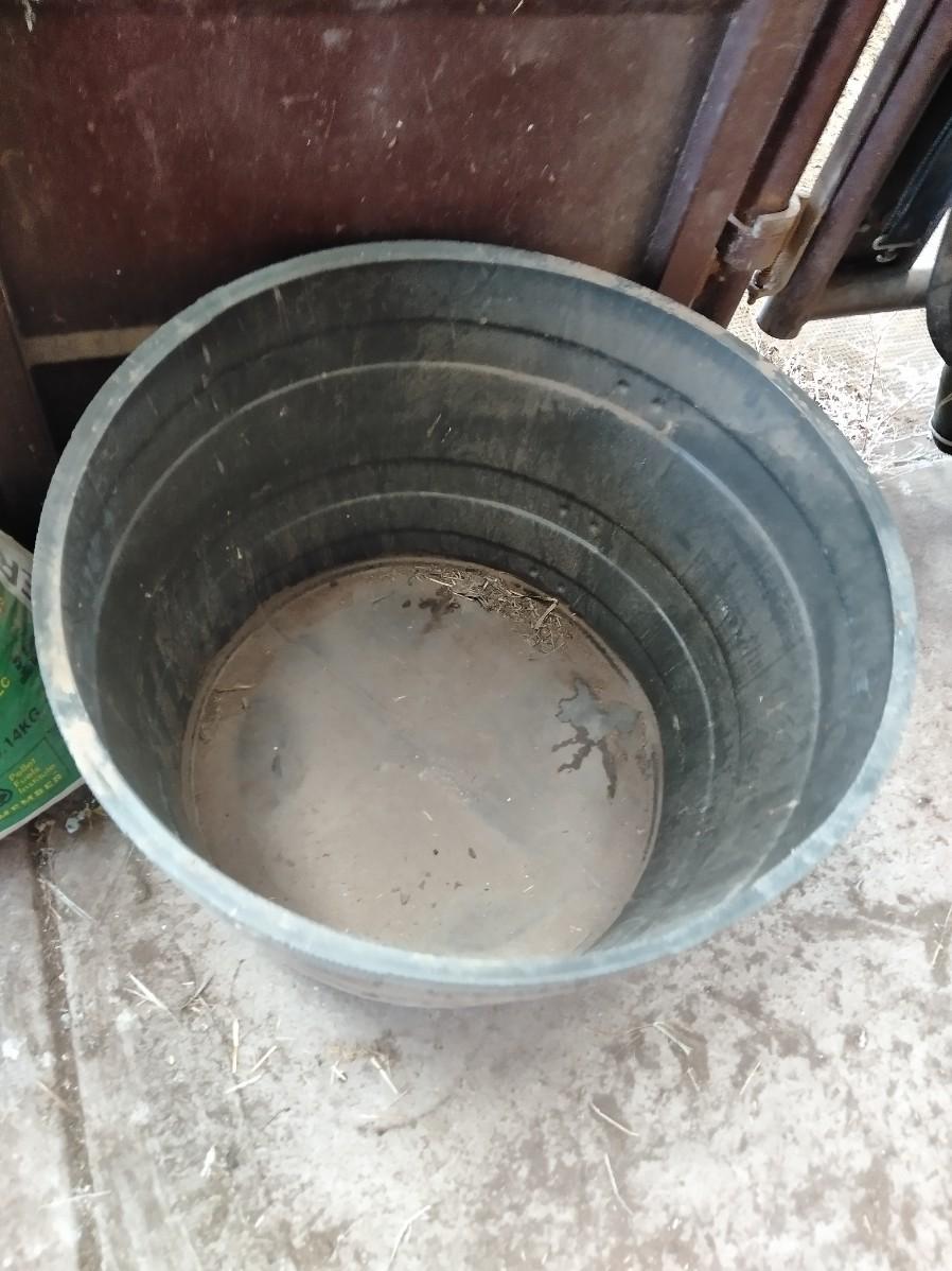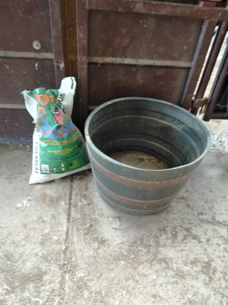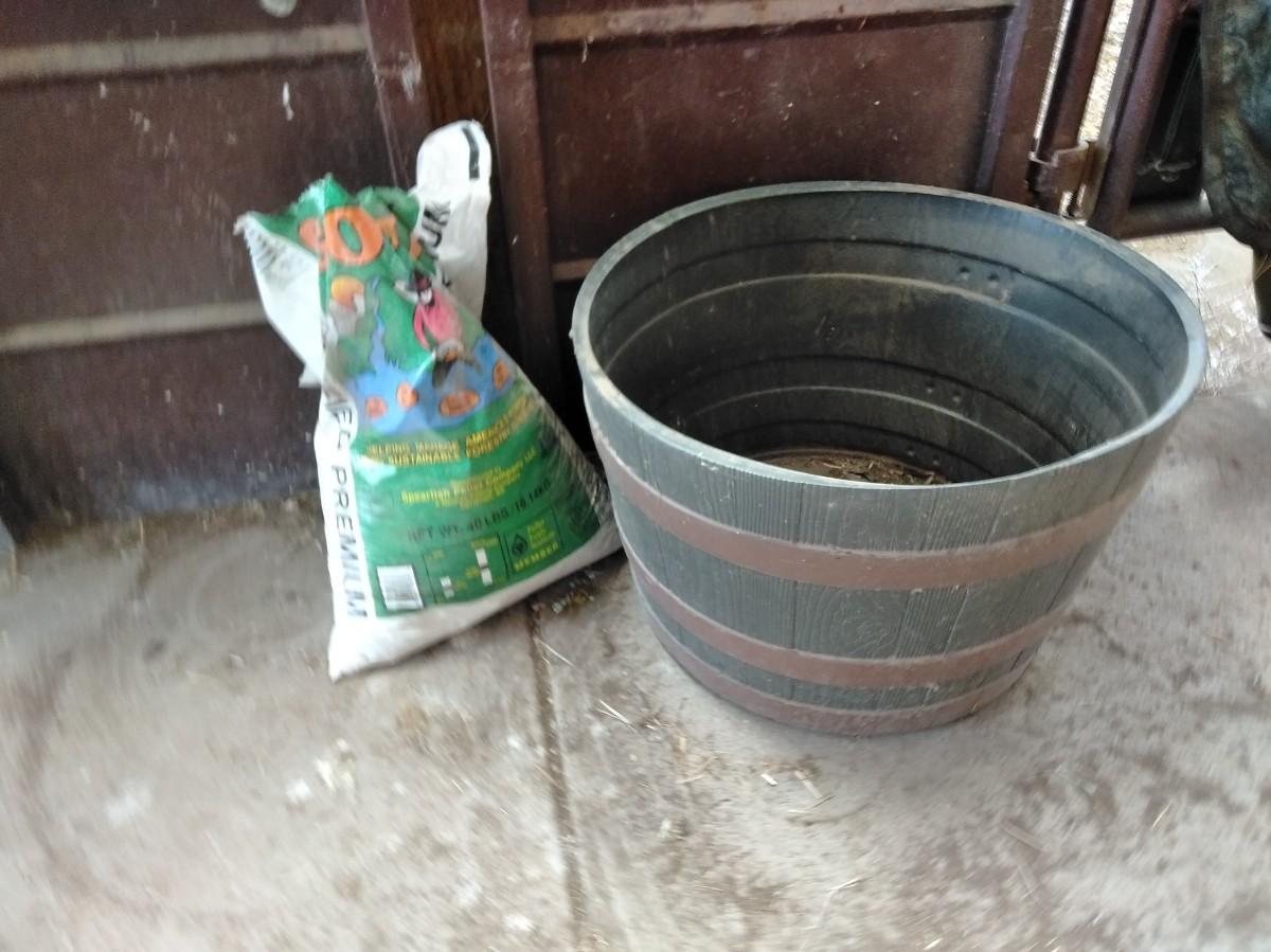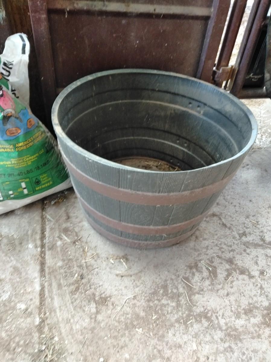 PLASTIC HALF BARREL PLANTER WITH PARTIAL BAG OF PELLET BEDDING 16" X 24"