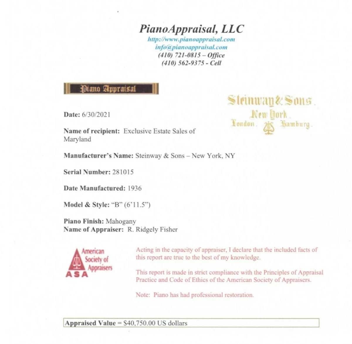 lot 349- Steinway and Sons piano model B serial #281015 appraised for $40,750.00 with stool