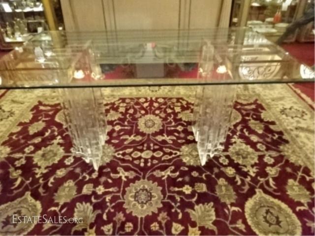 LOT 34A: MID CENTURY LUCITE DINING TABLE, DUAL PEDESTAL LUCITE BLOCK BASES WITH GLASS TOP, VERY GOOD CONDITION WITH NO YELLOWING, SOME EVIDENCE OF GLUE ATTACHING PARTS, 60"W X 36"D X 28.5"H, SKU355.02