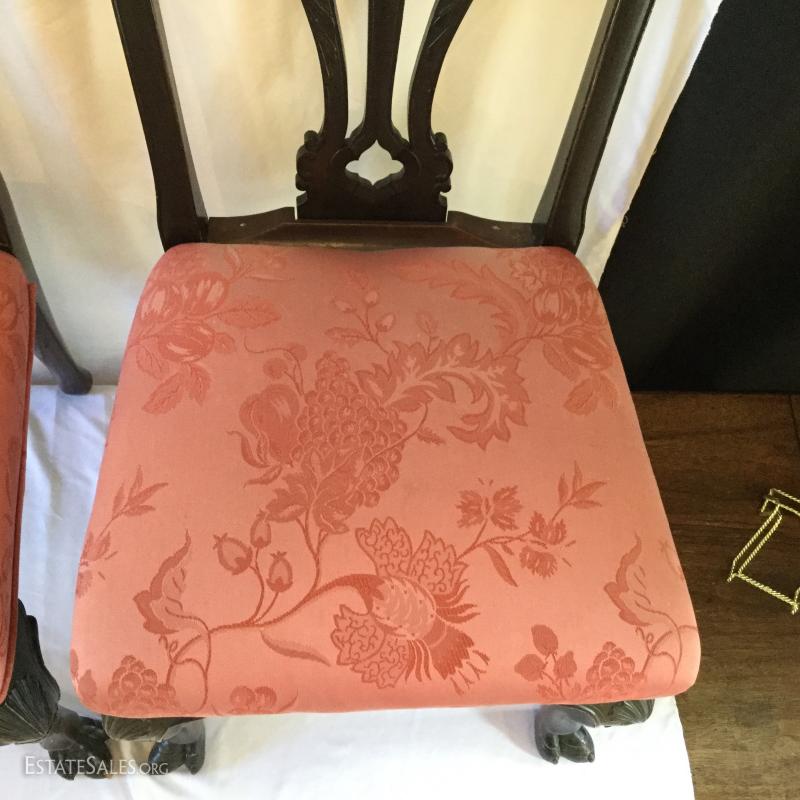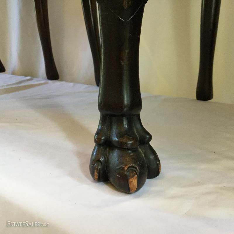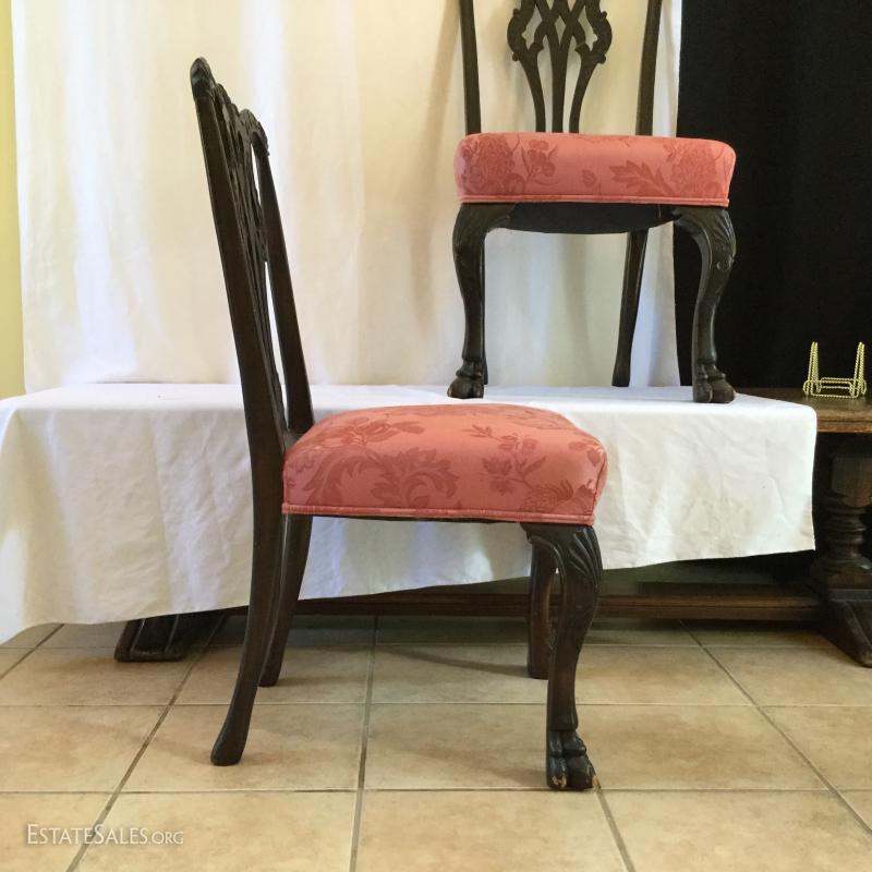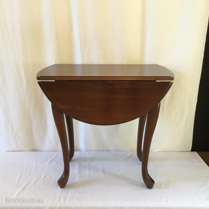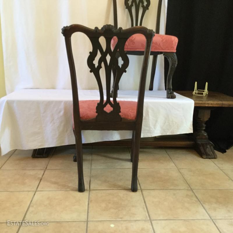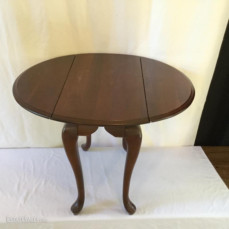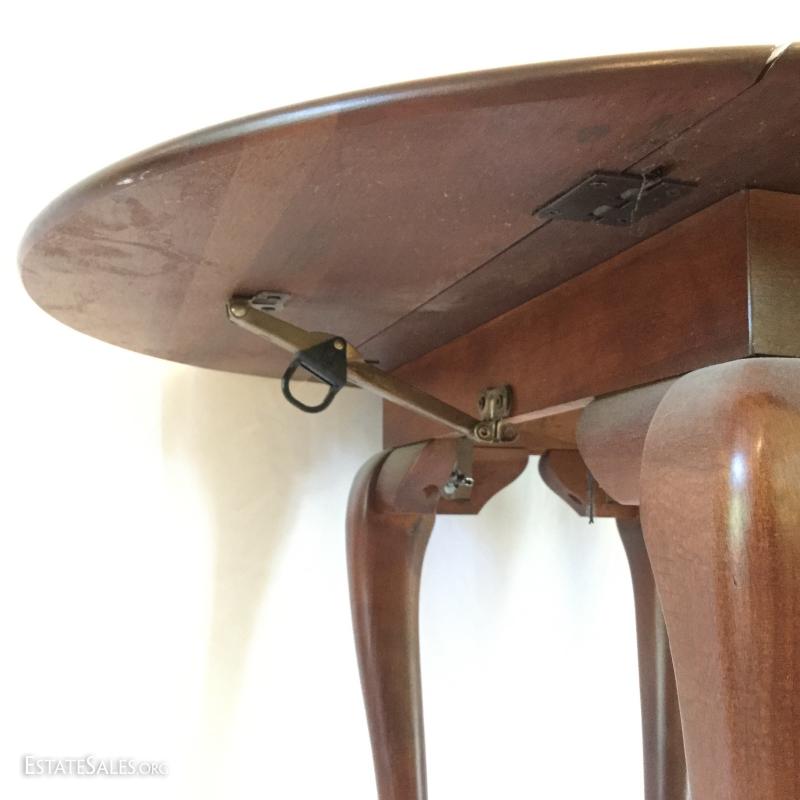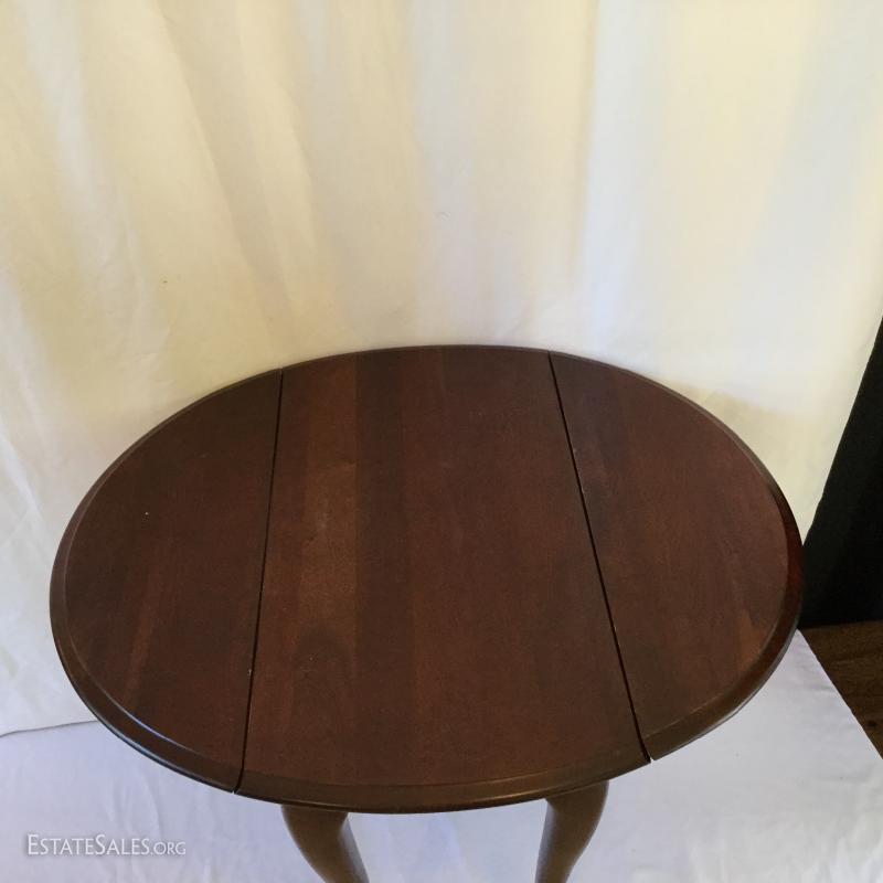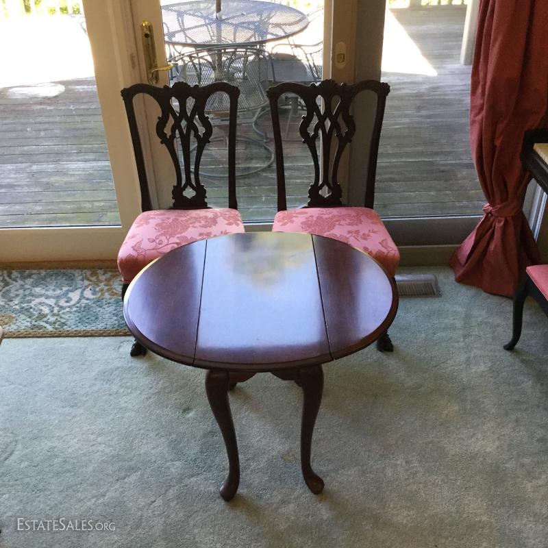 Two identical wooden and upholstered dining chairs, 37"Tall X 19"Wide. Lovely drop leaf wooden oval shaped table.