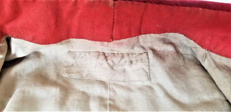 Fabulous 19th century British officer's vest - original tag written in old ink "Mr. Watson" - brass fittings down the front and hooks are in good condition - sizing belt on reverse. Everything about it looks "right." This really brings home how SMALL these people were - Measures 14" across at the shoulders, 21" long. 2 pockets on front. Good antique condition.