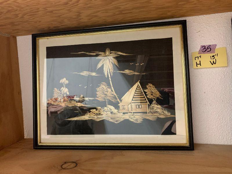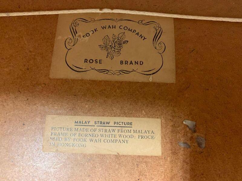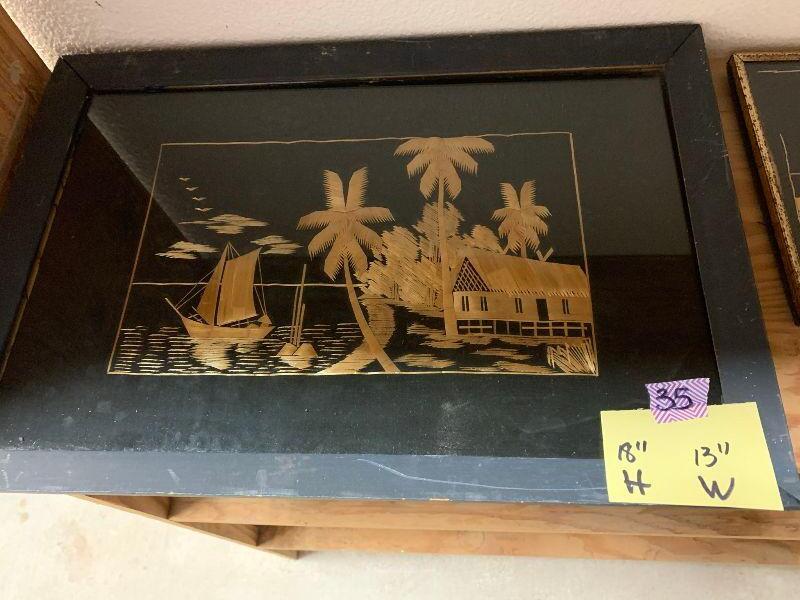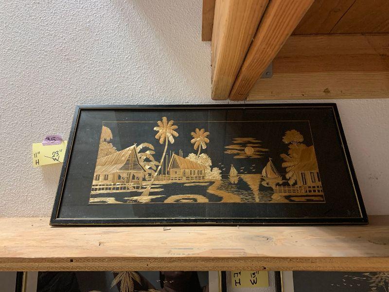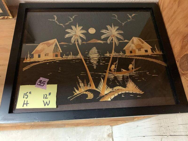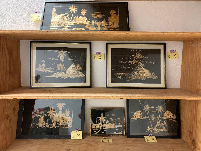 Oriental Pictures made from straw: house and palm tree, 2 buildings with fence and palm tree, 2 buildings with 2 palms and boat, 1 building with 3 palms and boat, house and mountain, and 3 buildings with boats and the moon.