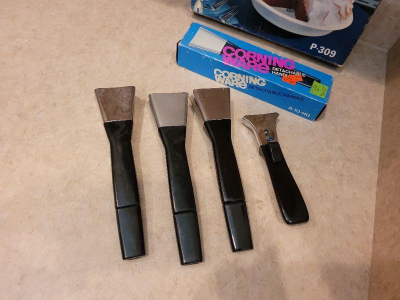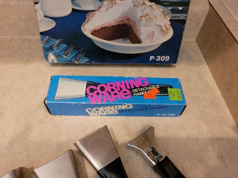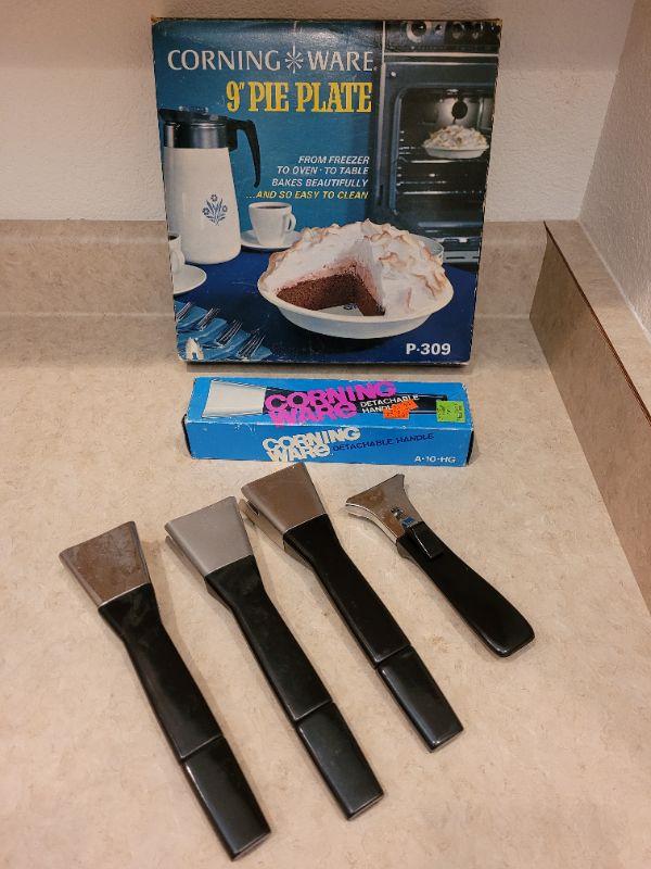Lot 35: New Corning Ware Pie Plate and Handle in Boxes and (4) used Handles