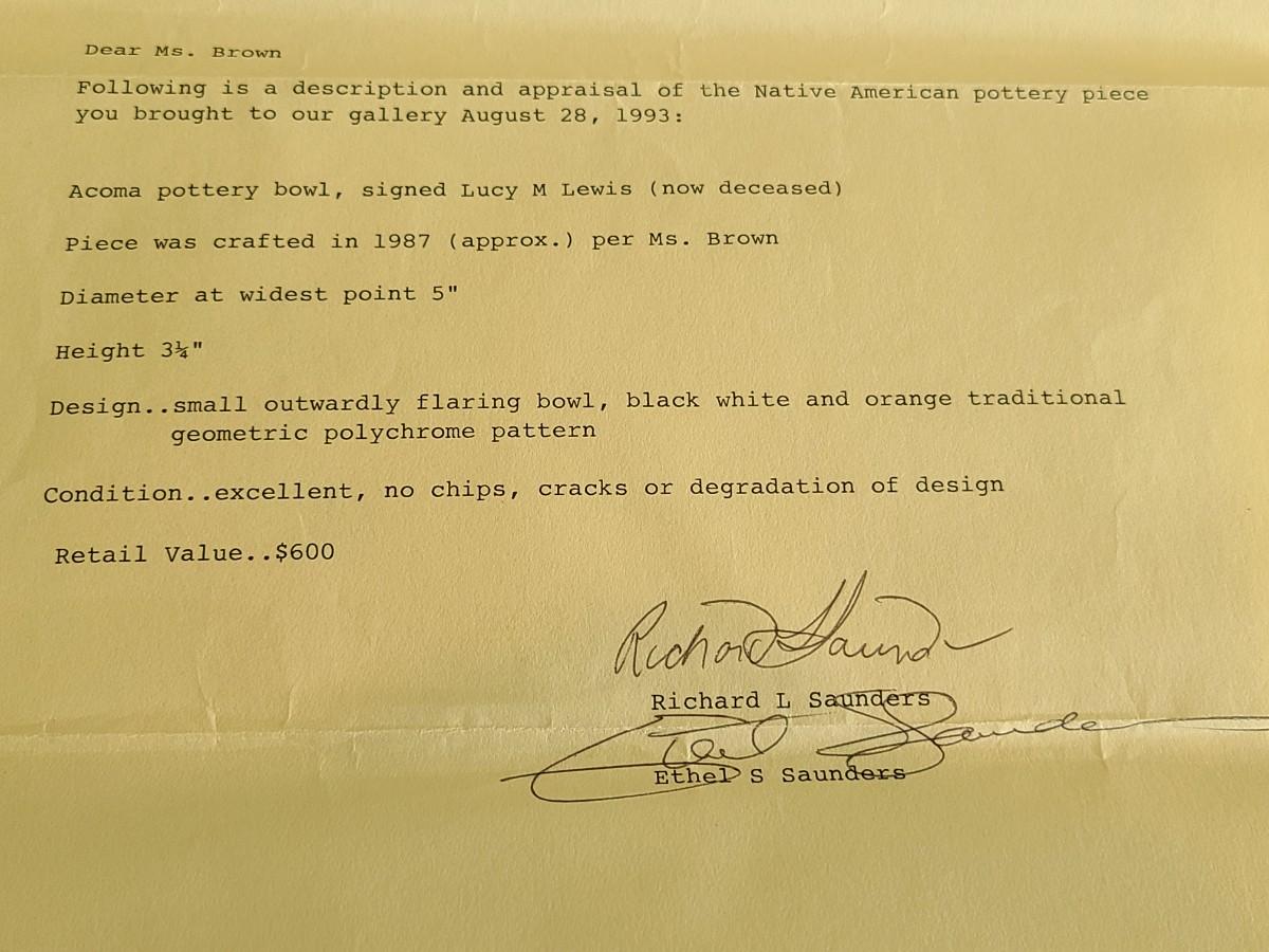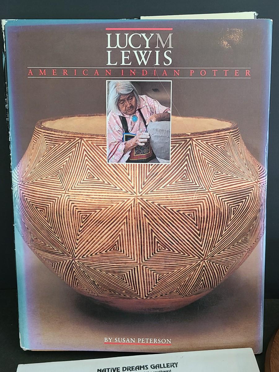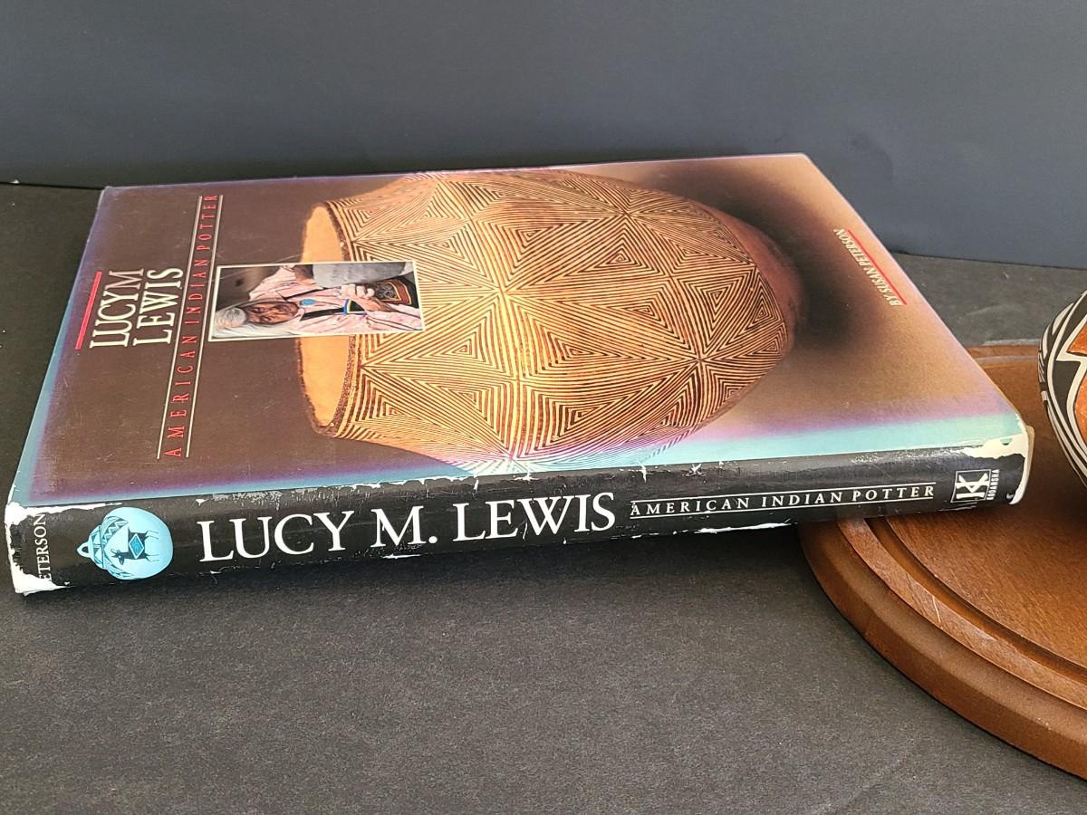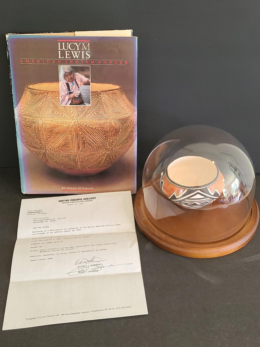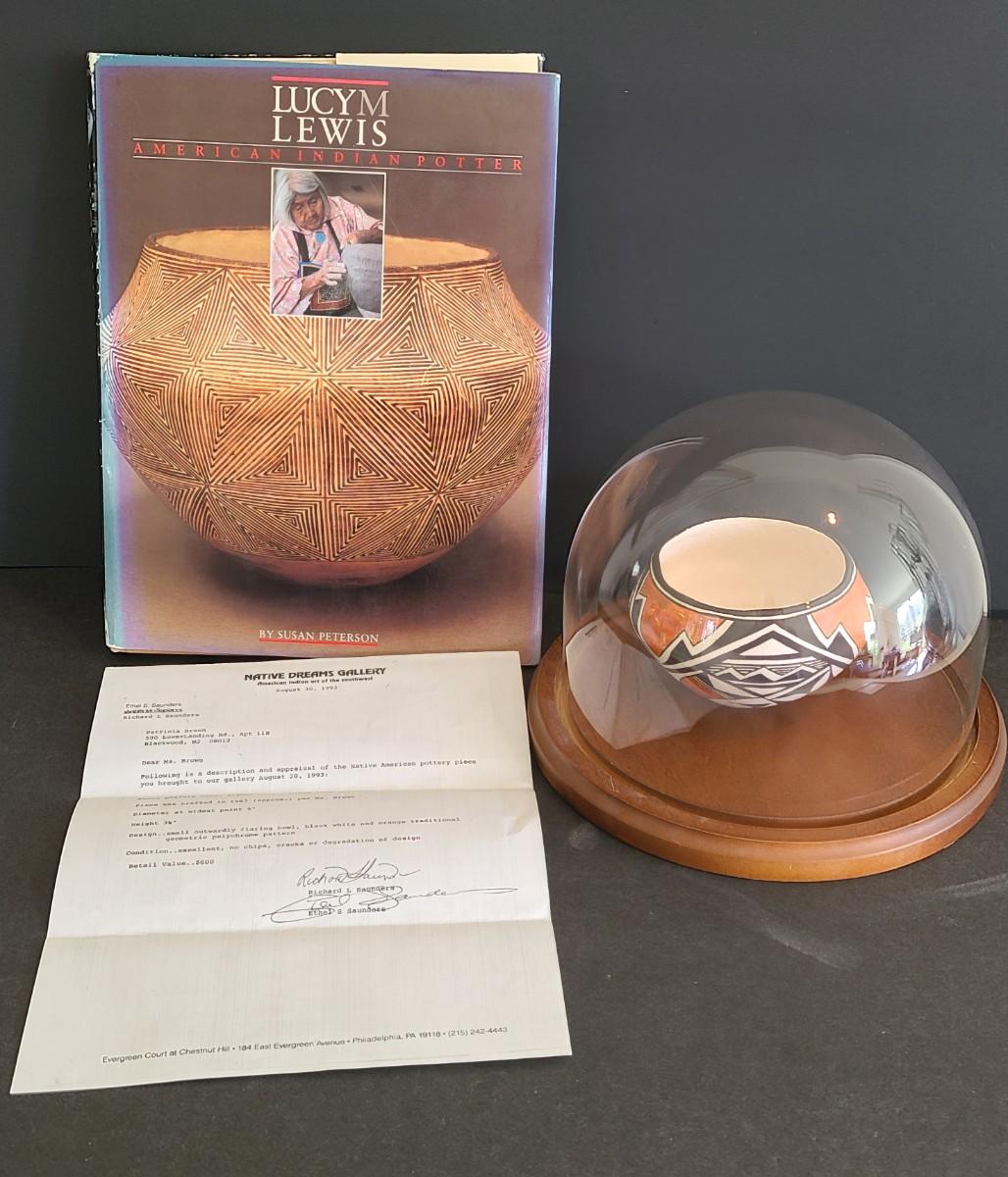 Signed Lucy Lewis American Indian Pottery. In addition, a copy of Lucy M Lewis American Indian Potter book, showing the same type of aroma bowls .The pottery piece was appraised in 1993 with the value at $600. It is a beautiful piece of art & pottery you be able to cherish for years to come. It is protected by is glass display case as it only measures 3 1/4 in height and 5" diameter.. It flares outward white black & orange traditional geometric polychrome patterns. Please see all pictures for content of the lot, condition of the lot, and measurements if taken. Pictures are the best representation of the items listed and items are untested unless indicated in description. Thank you for looking and have fun bidding!