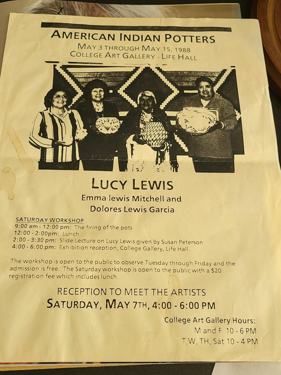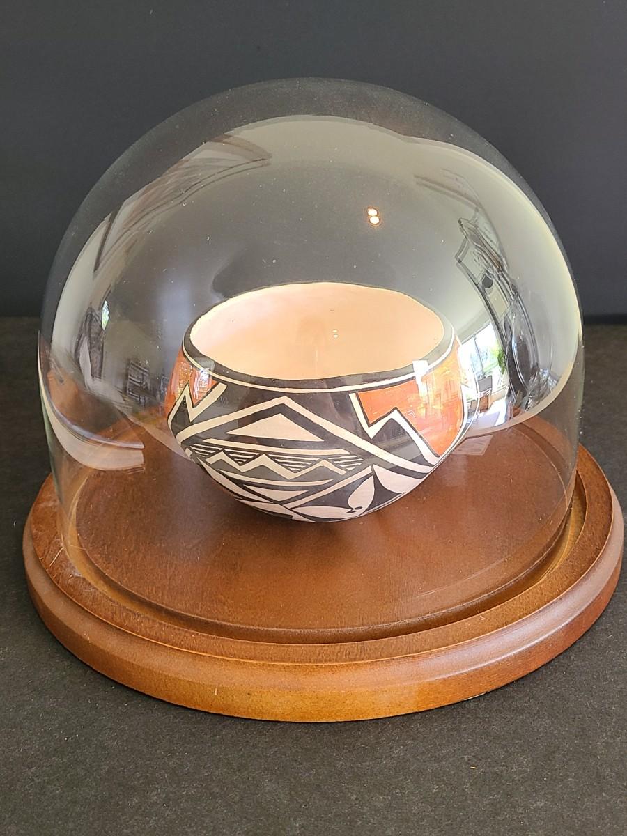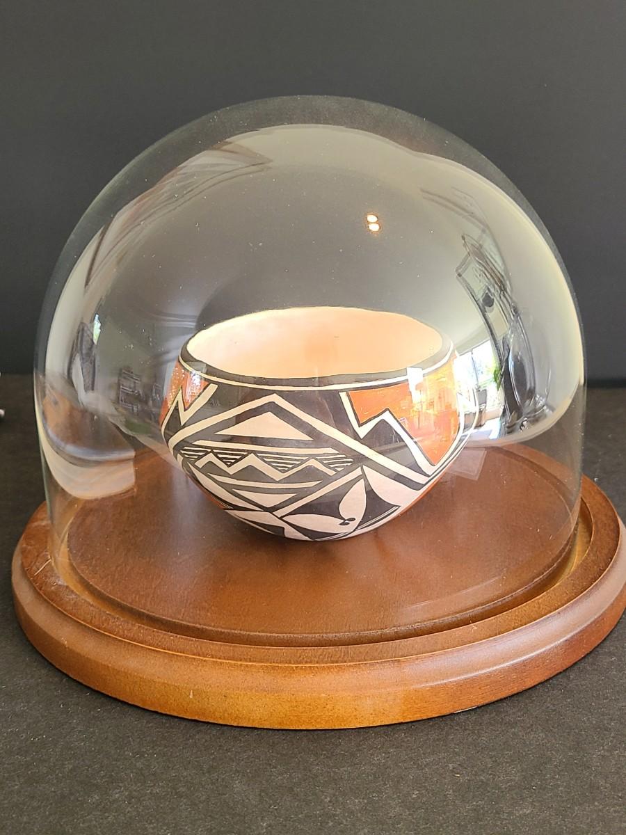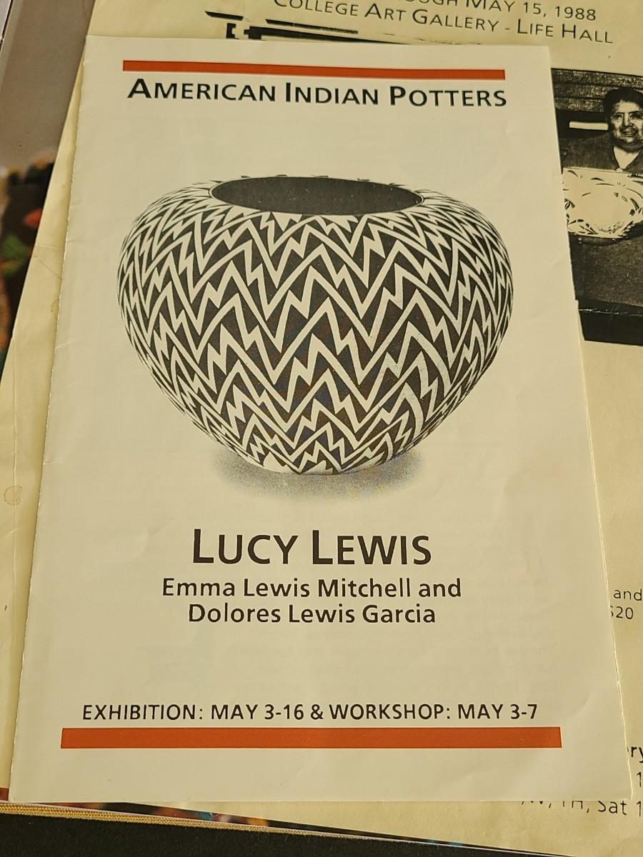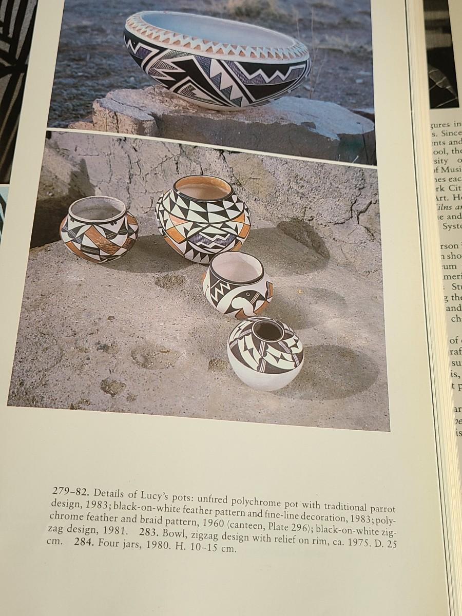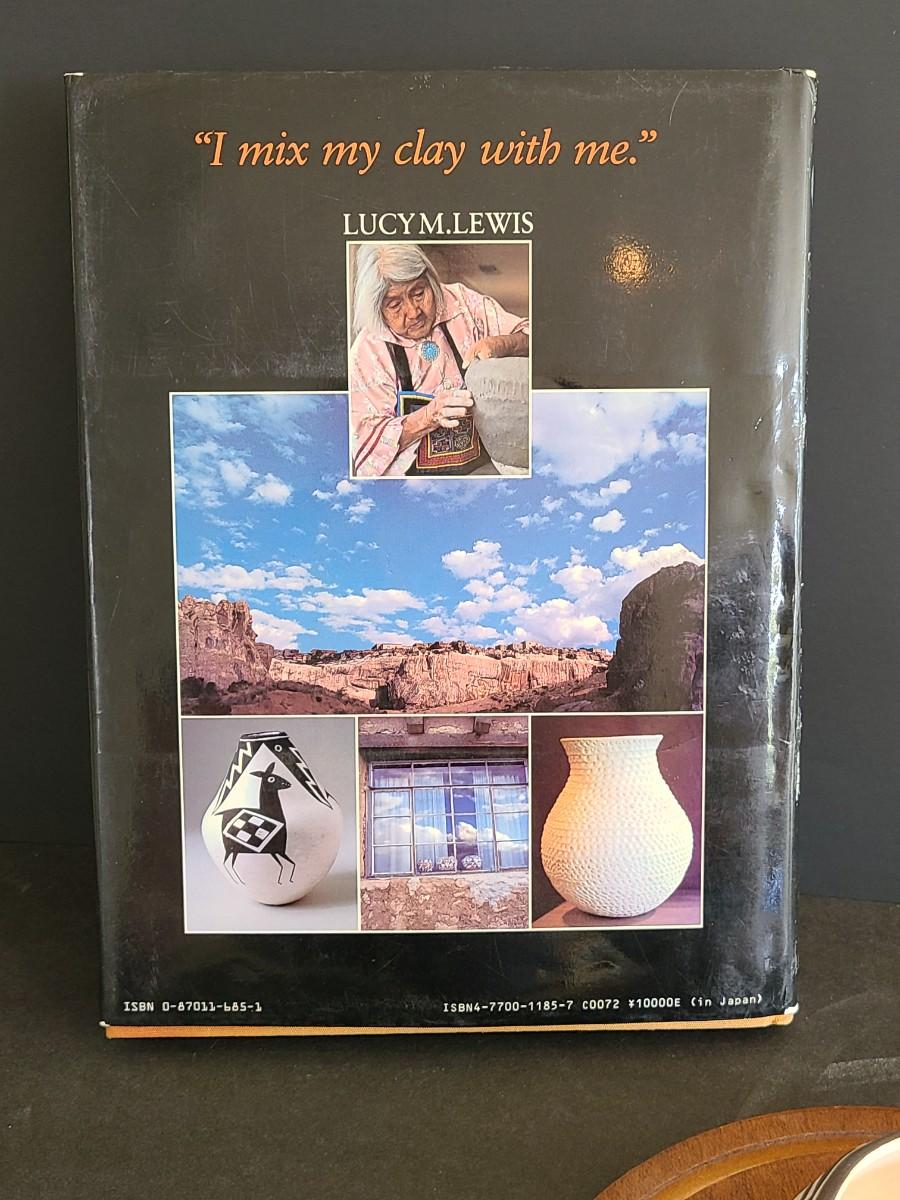Signed Lucy Lewis American Indian Pottery. In addition, a copy of Lucy M Lewis American Indian Potter book, showing the same type of aroma bowls .The pottery piece was appraised in 1993 with the value at $600. It is a beautiful piece of art & pottery you be able to cherish for years to come. It is protected by is glass display case as it only measures 3 1/4 in height and 5" diameter.. It flares outward white black & orange traditional geometric polychrome patterns. Please see all pictures for content of the lot, condition of the lot, and measurements if taken. Pictures are the best representation of the items listed and items are untested unless indicated in description. Thank you for looking and have fun bidding!