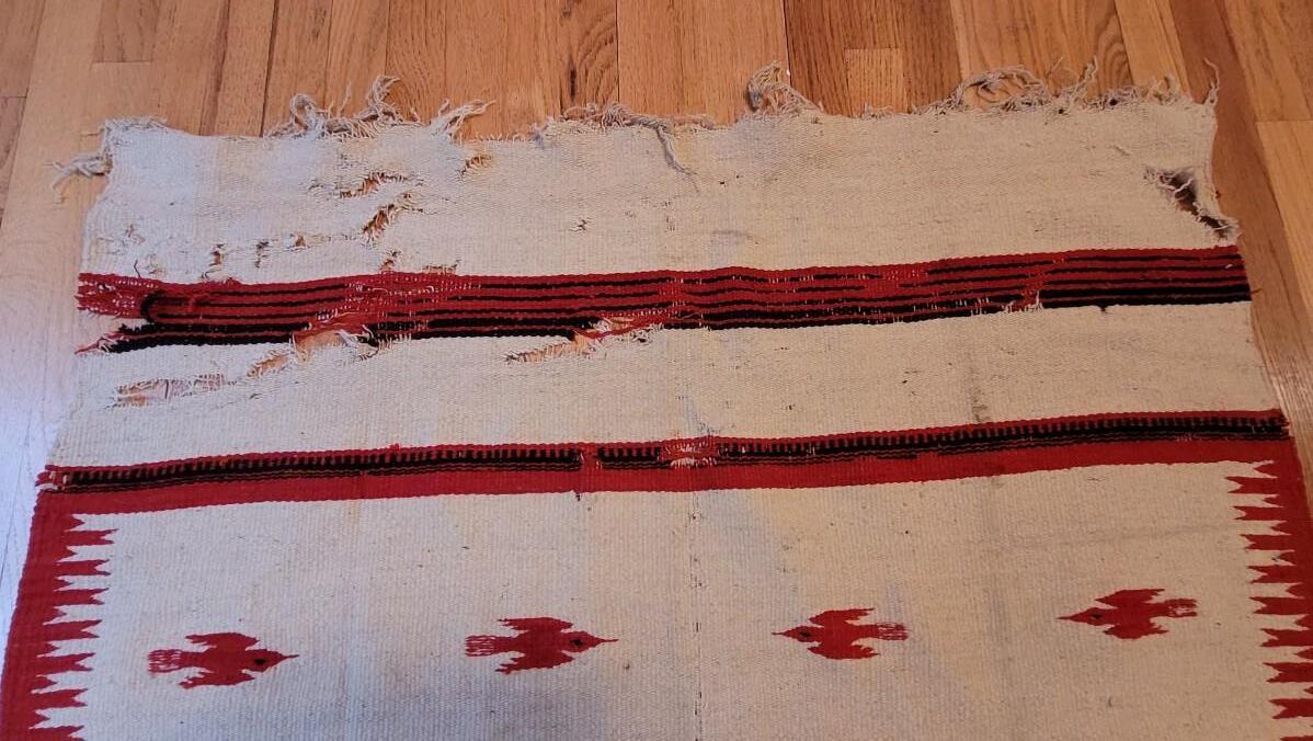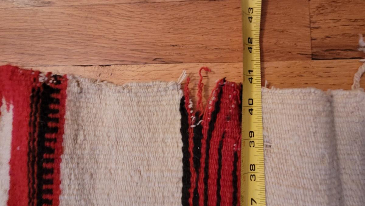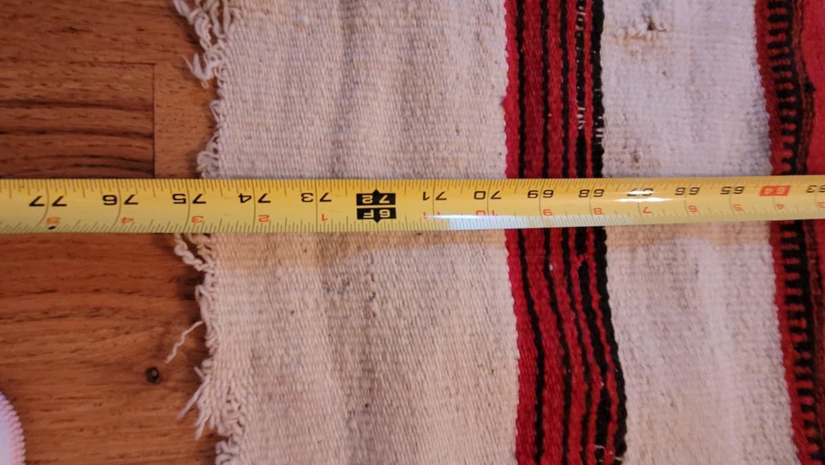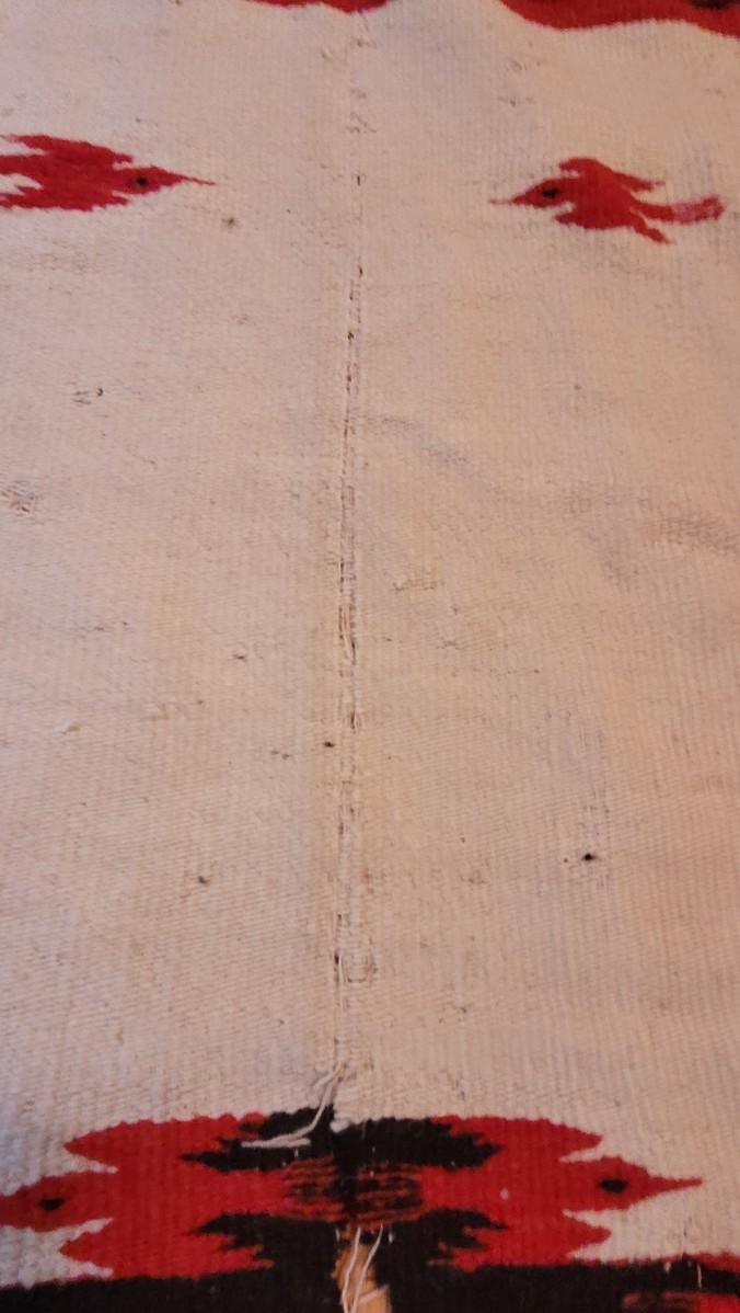The bright red and black design are 2 separate weavings sewn together. This is a thick wool serape in the Navajo style.