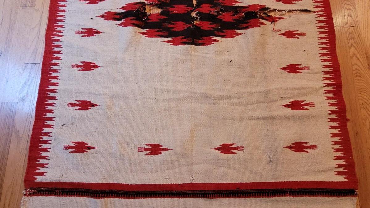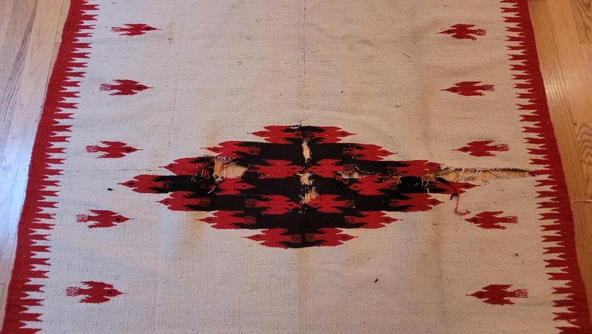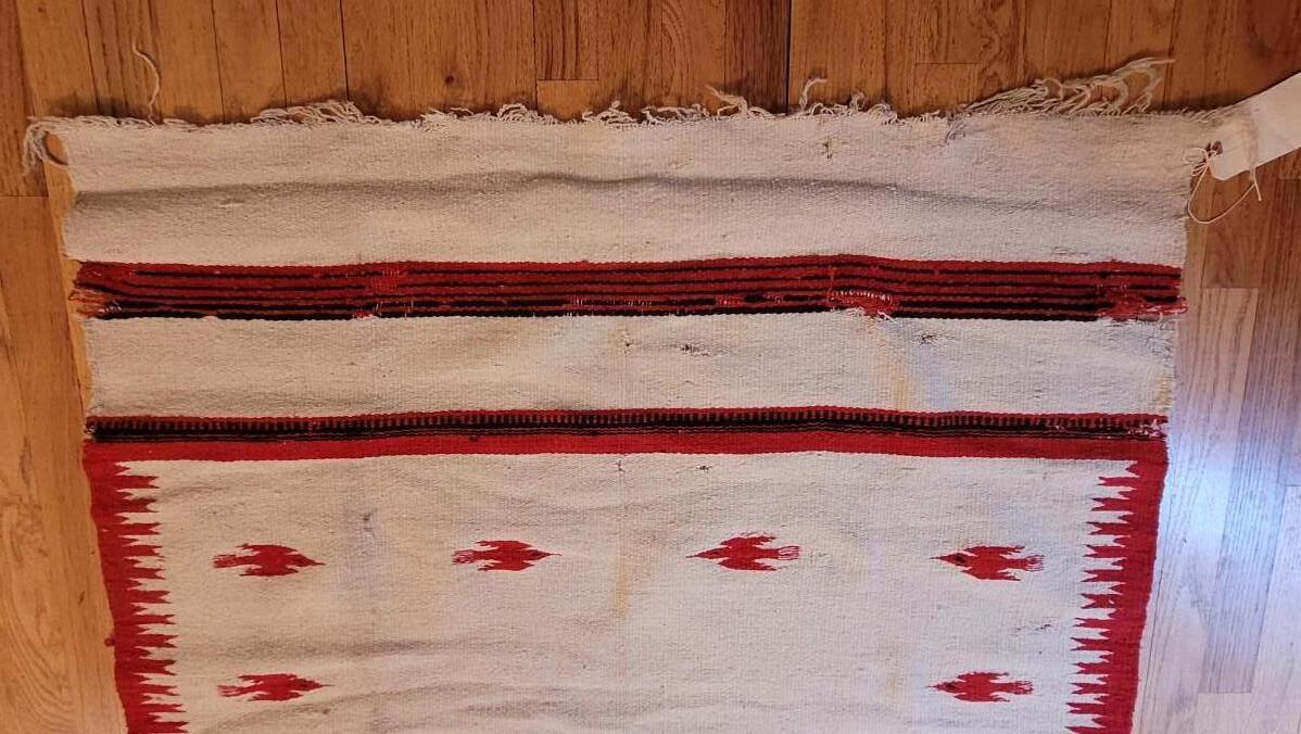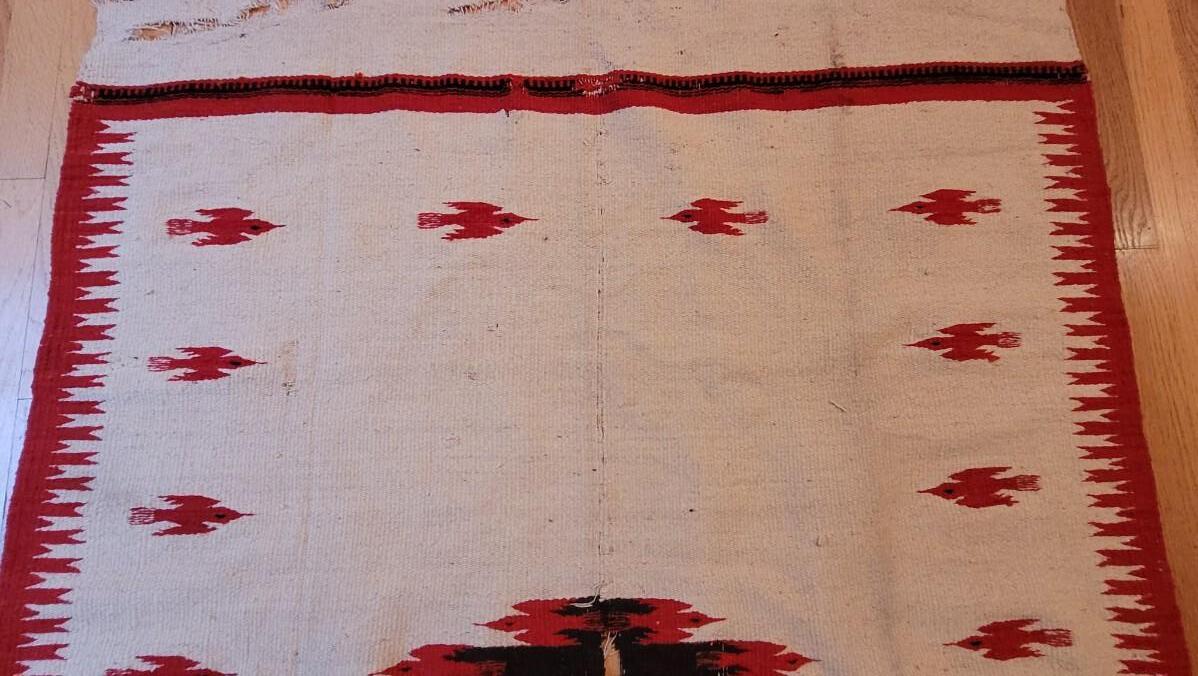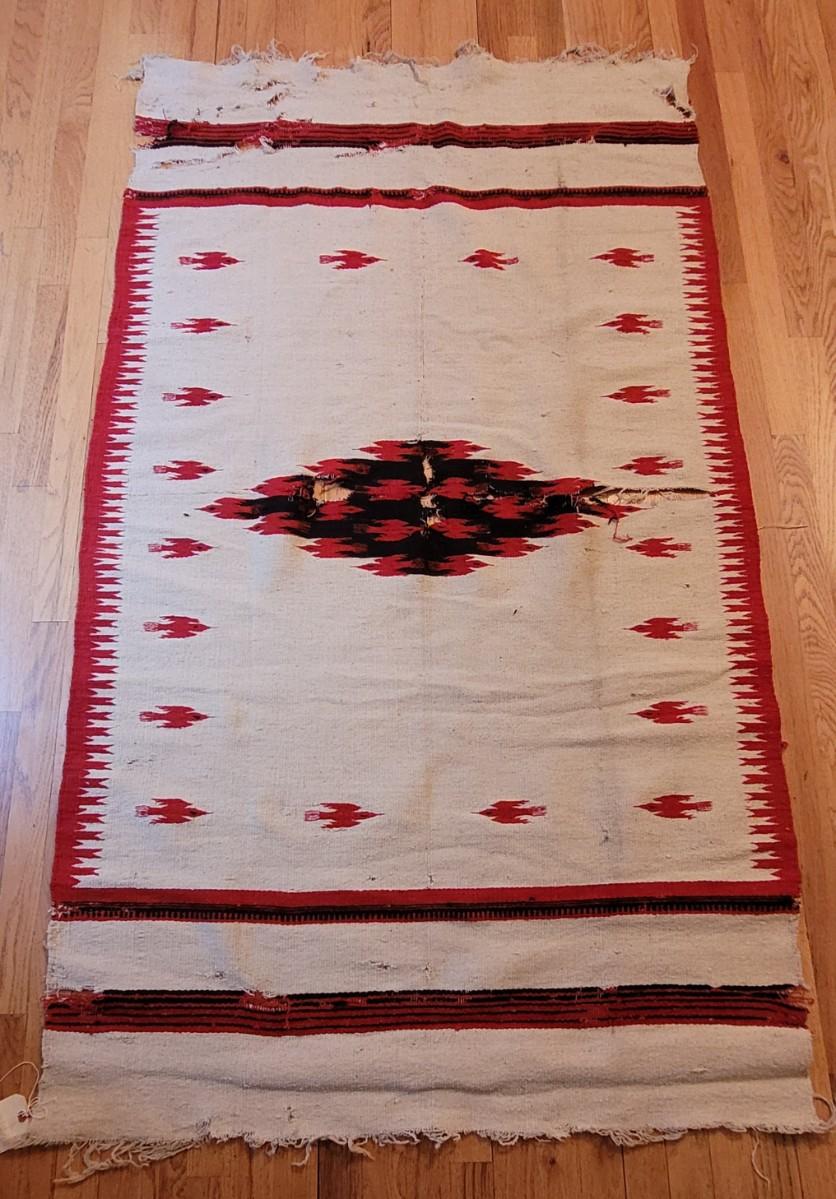 The bright red and black design are 2 separate weavings sewn together. This is a thick wool serape in the Navajo style.