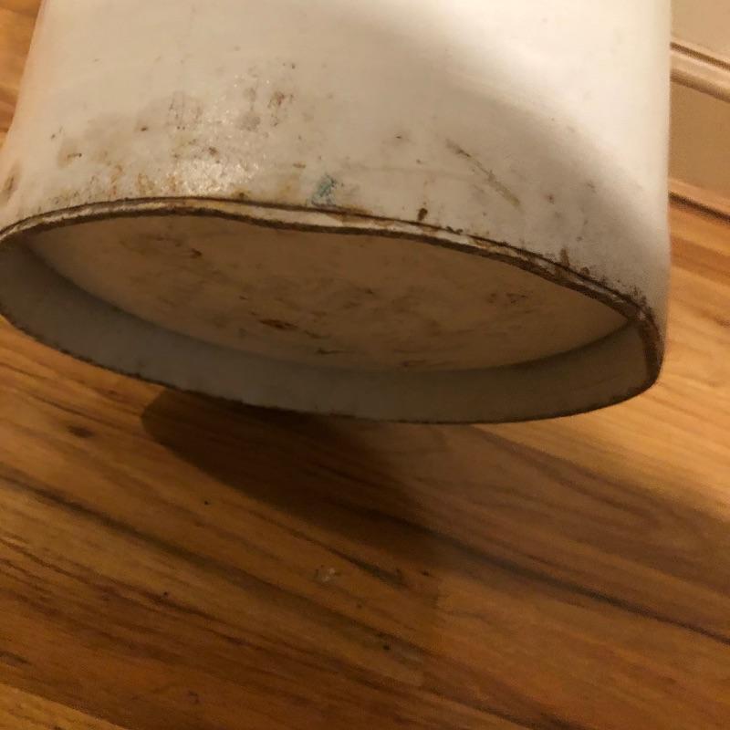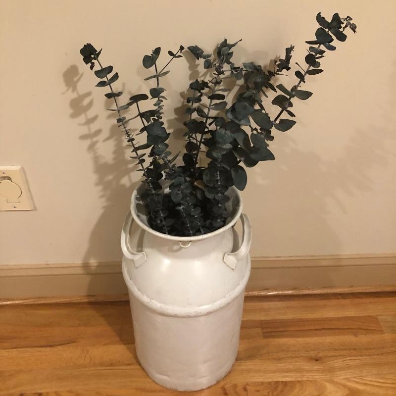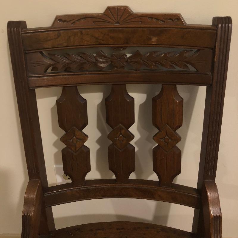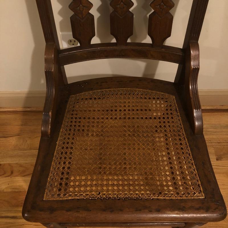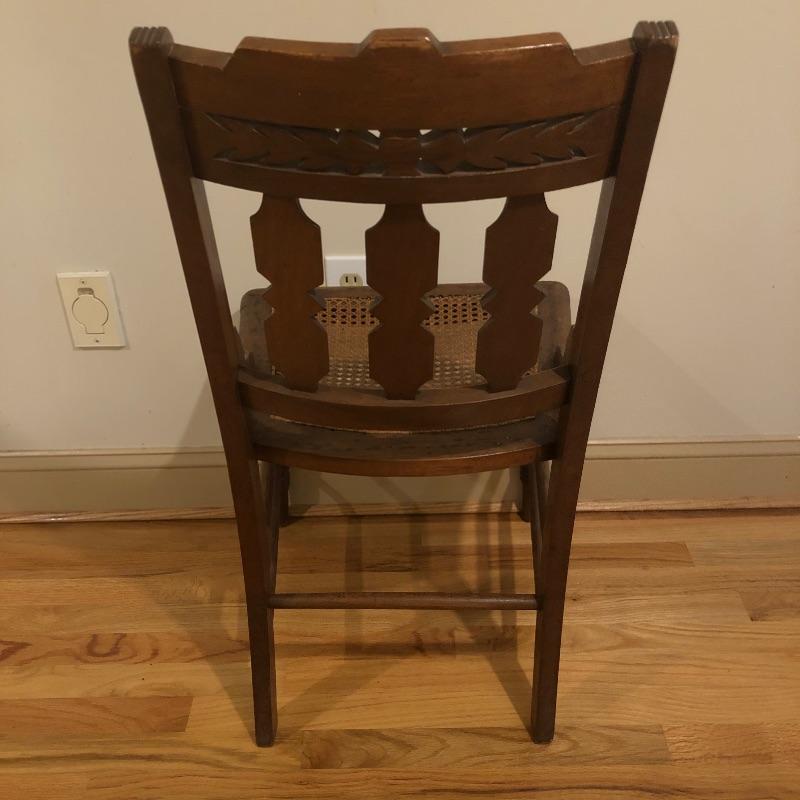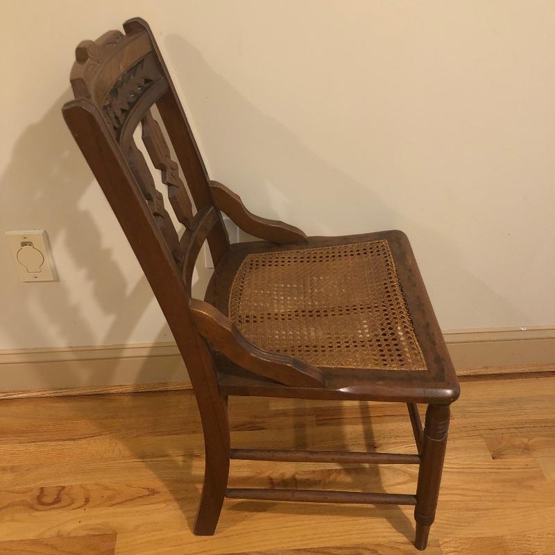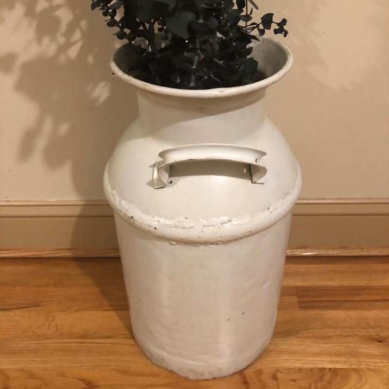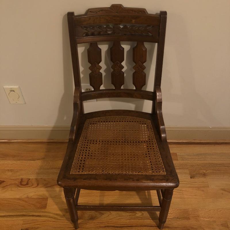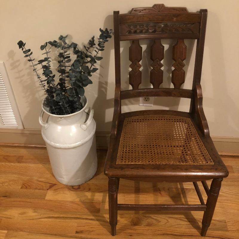 This lot includes a vintage wood chair With cane seat and a white painted metal milk jug with a faux plant. The chair features beautiful carving details. The top piece on the chair back (last picture of chair) wiggles slightly, but this does not affect the function of the chair. Chair measures 18.5”W x 20”D x 34.5”H. Local pick up only.