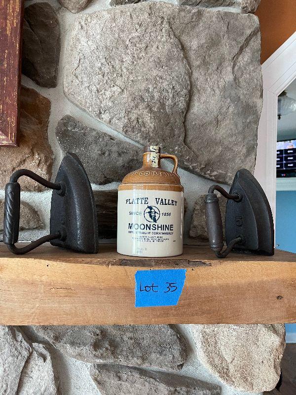 Platte Valley McCormick Moonshine Jug Made in Poland, 2 Vintage Irons (#5 & #8).