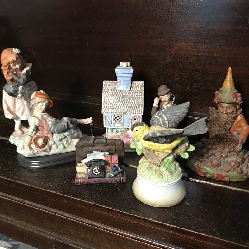 Lot includes six figurines. Most appear to be porcelain. The The Tom Clark gnome is dusty.. Tallest figurine (of the boy and sleeping girl) is approx. 9” tall. House has three pieces, bird includes a wind up music box. See pics. Shipping available or local pickup.