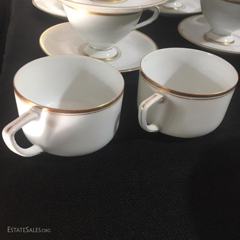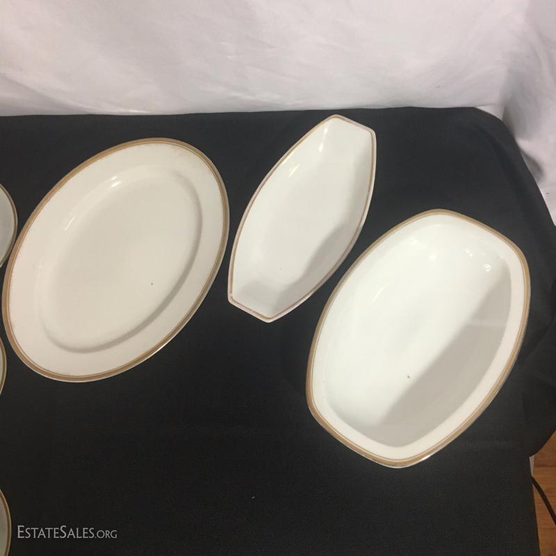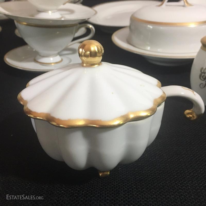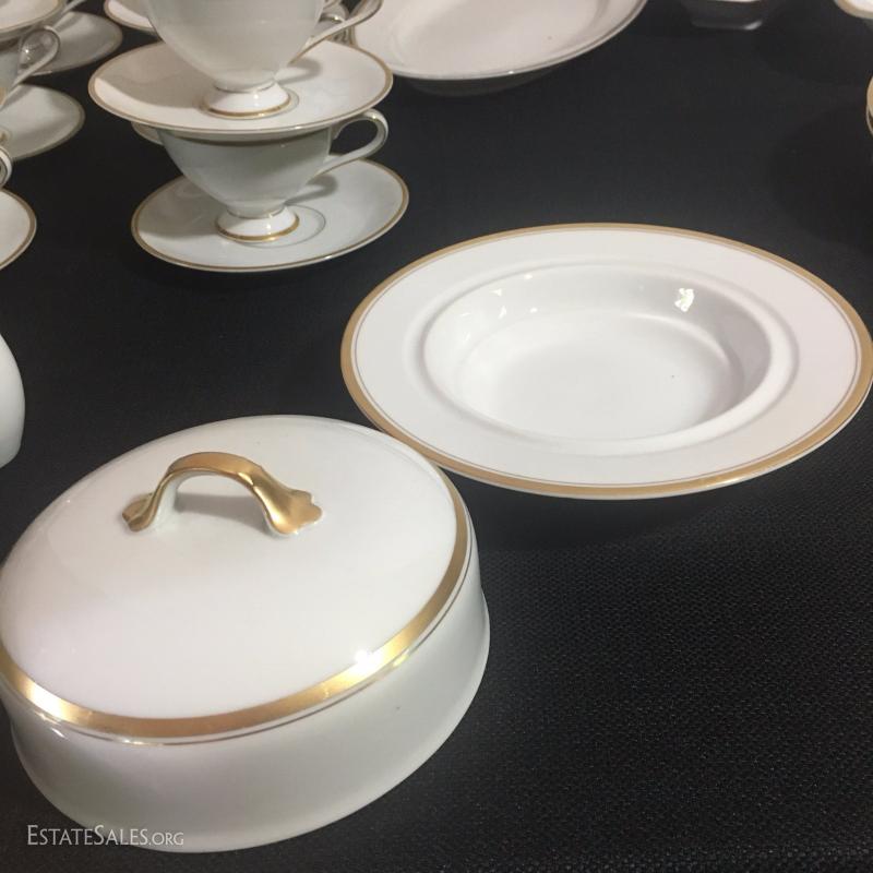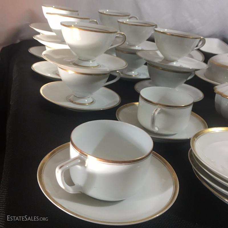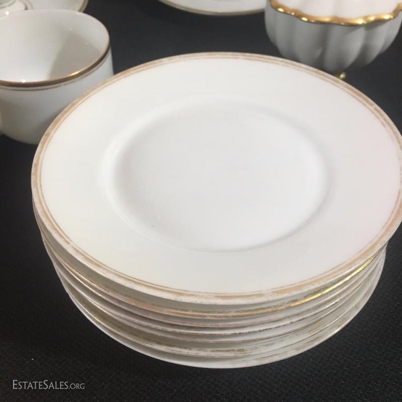 60pc white and gold rim China set. Several different makers but very similar design. See photos for details. Some gold rim is slightly faded on some pieces.