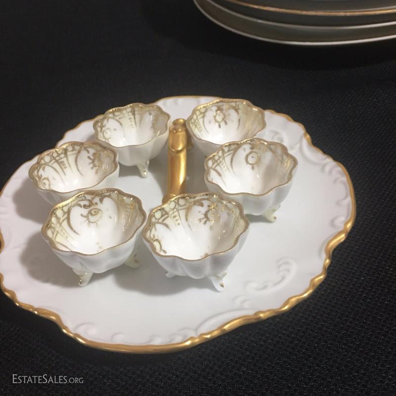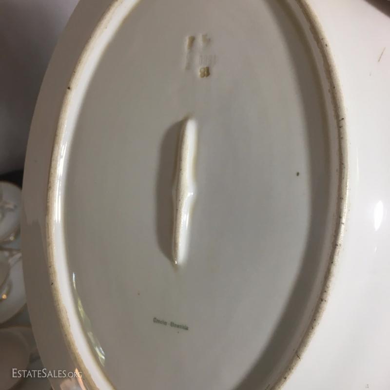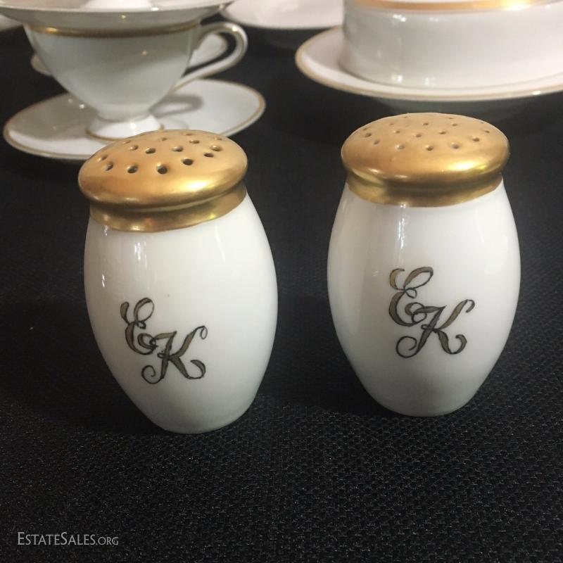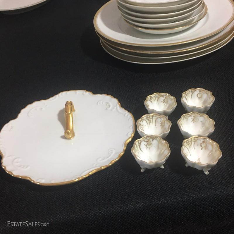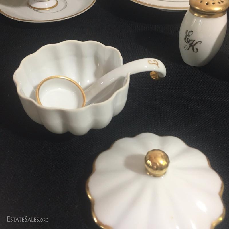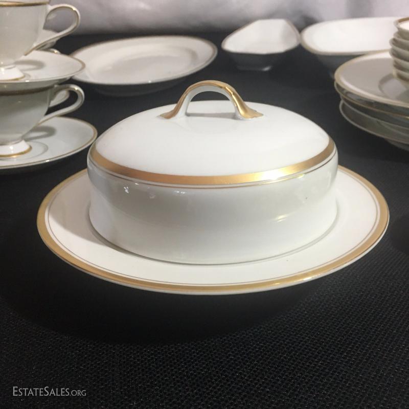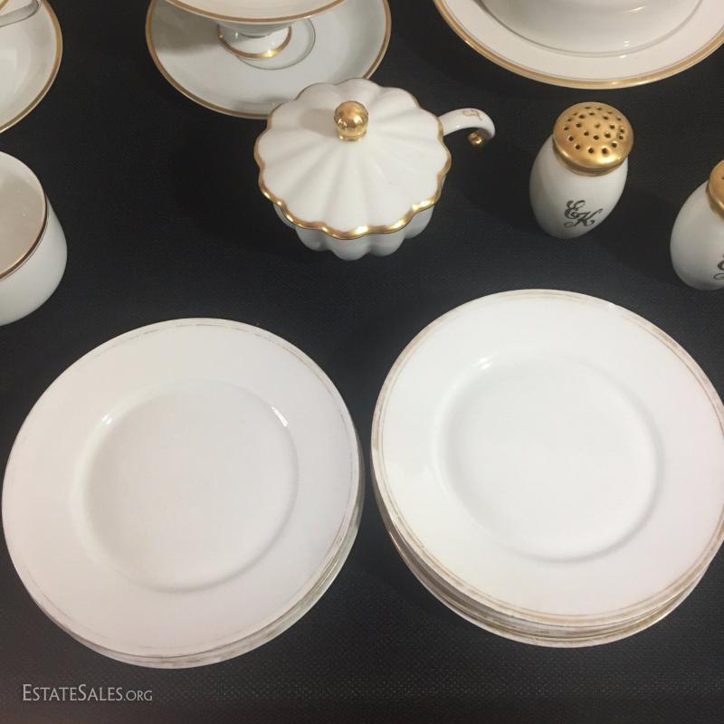 60pc white and gold rim China set. Several different makers but very similar design. See photos for details. Some gold rim is slightly faded on some pieces.