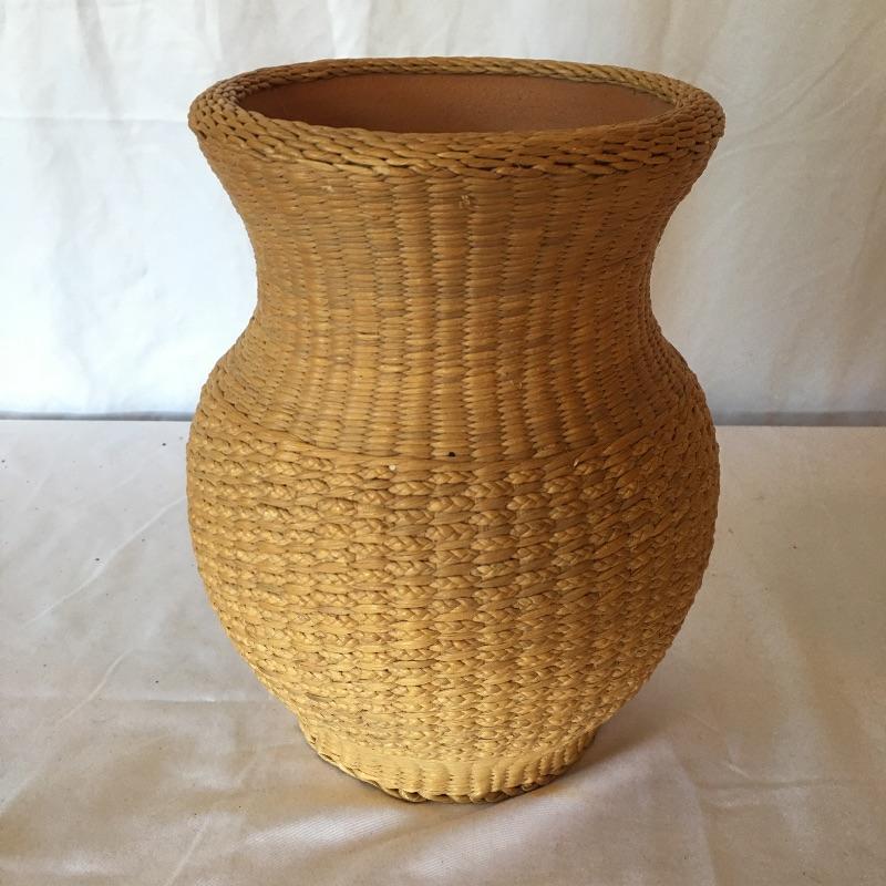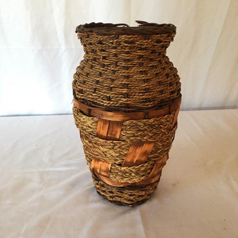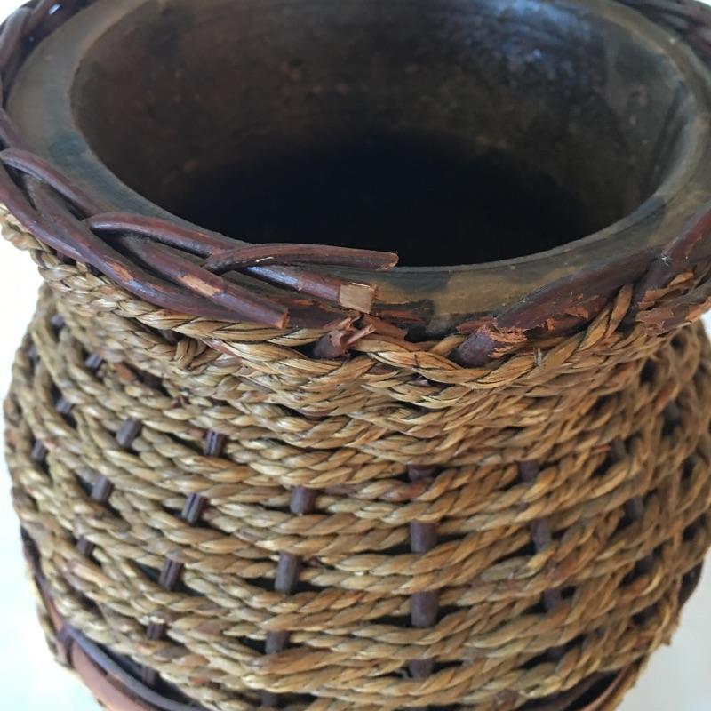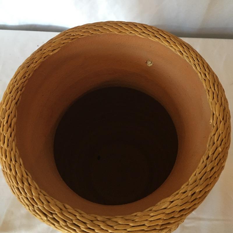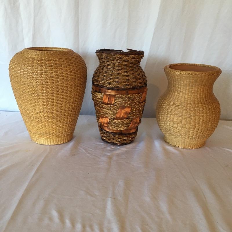 These three pieces include two pieces that are matching colors with the third piece wrapped in different textured ropes with one piece being loose on top. Have a great place to display your flowers with these three beauties. Tallest piece measures 6”D x 12” tall.