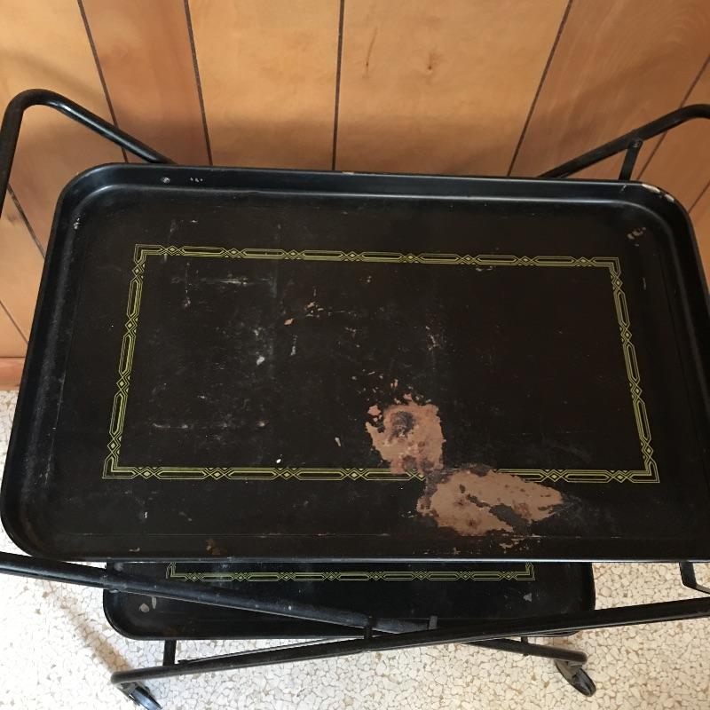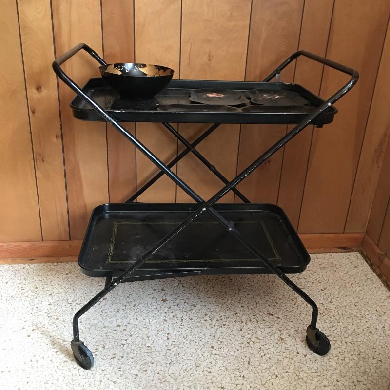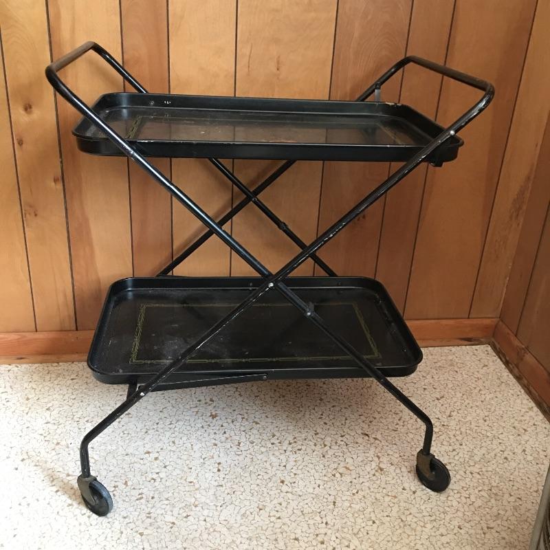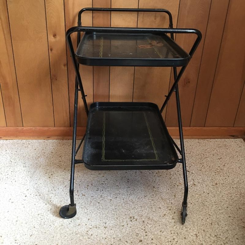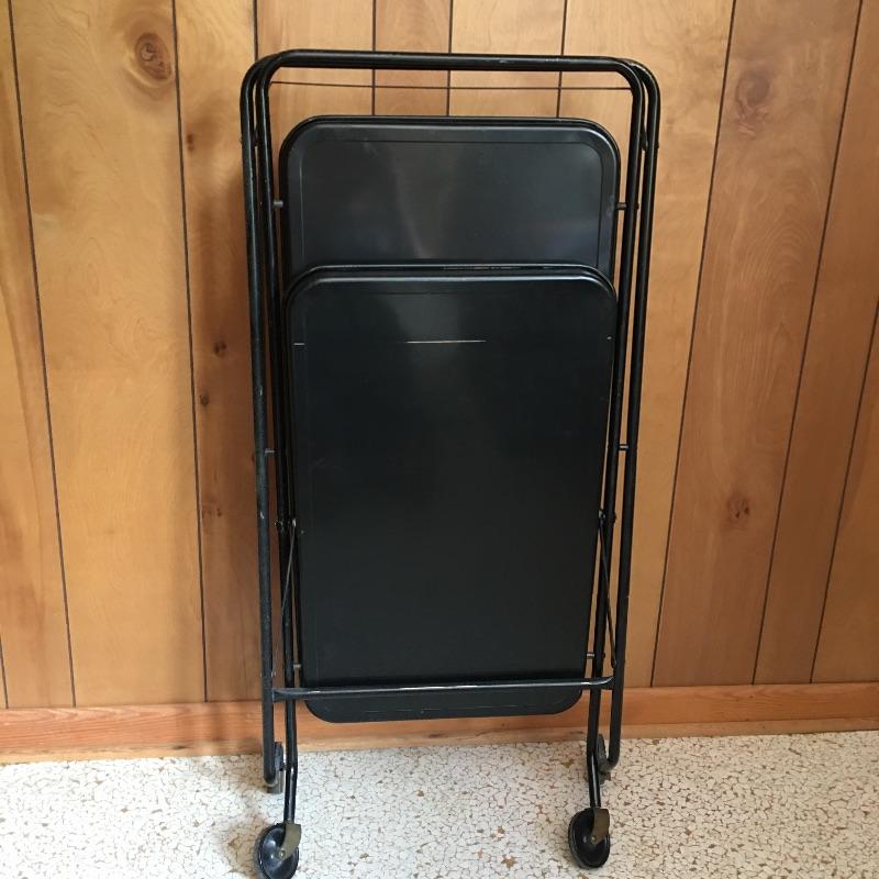 This is great to serve drinks tray at your next party. This two tiered rolling cart measures approximately 20.5” x 28” x 33”. and also folds up to 9.5” x 20” x 42” for easy storage. Also includes four black metal serving trays and one metal bowl. Top tray has a decent sized blemish and two small trays have some wear, see pictures.