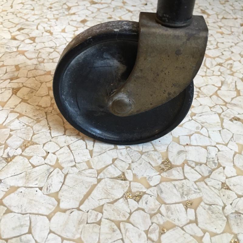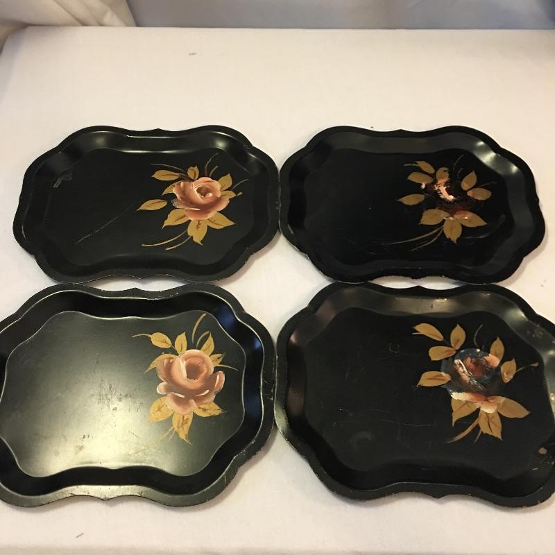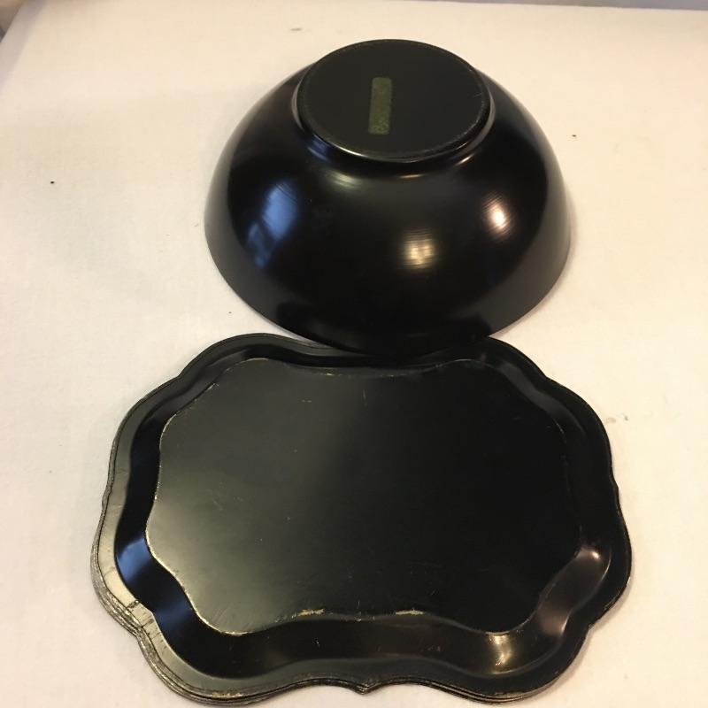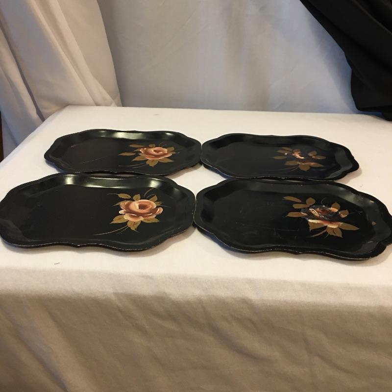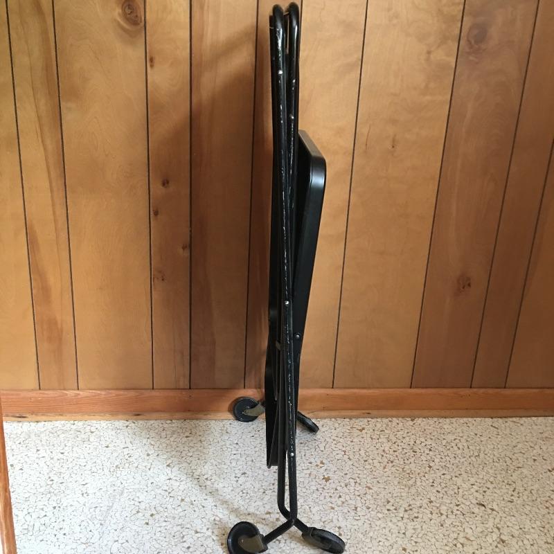 This is great to serve drinks tray at your next party. This two tiered rolling cart measures approximately 20.5” x 28” x 33”. and also folds up to 9.5” x 20” x 42” for easy storage. Also includes four black metal serving trays and one metal bowl. Top tray has a decent sized blemish and two small trays have some wear, see pictures.
