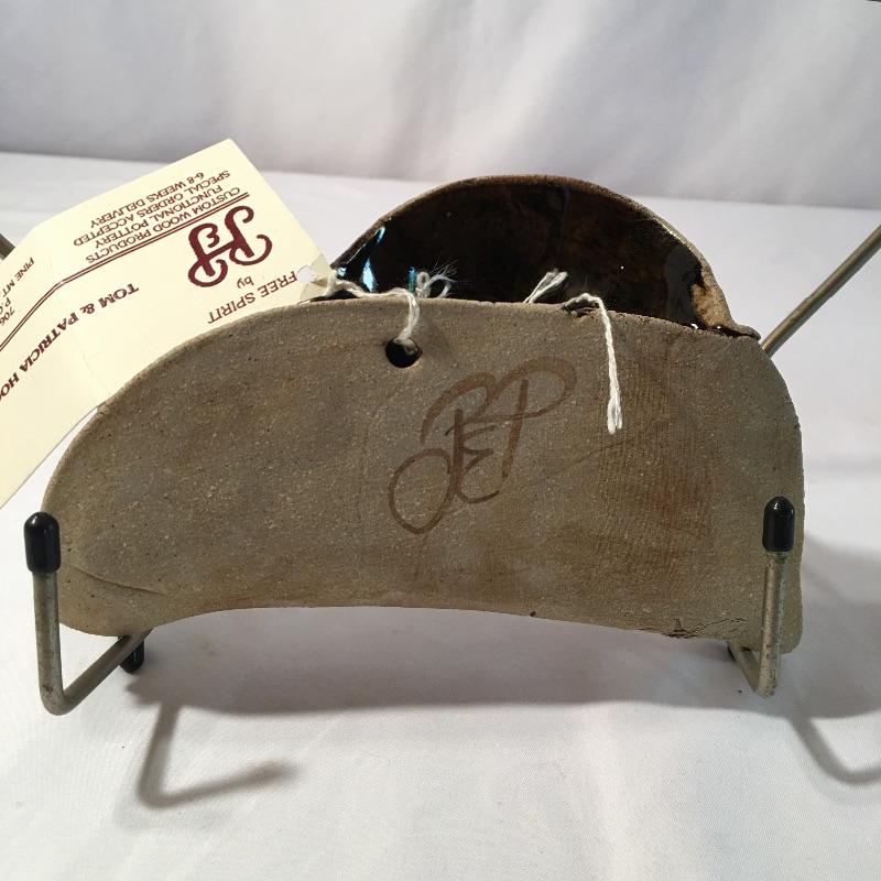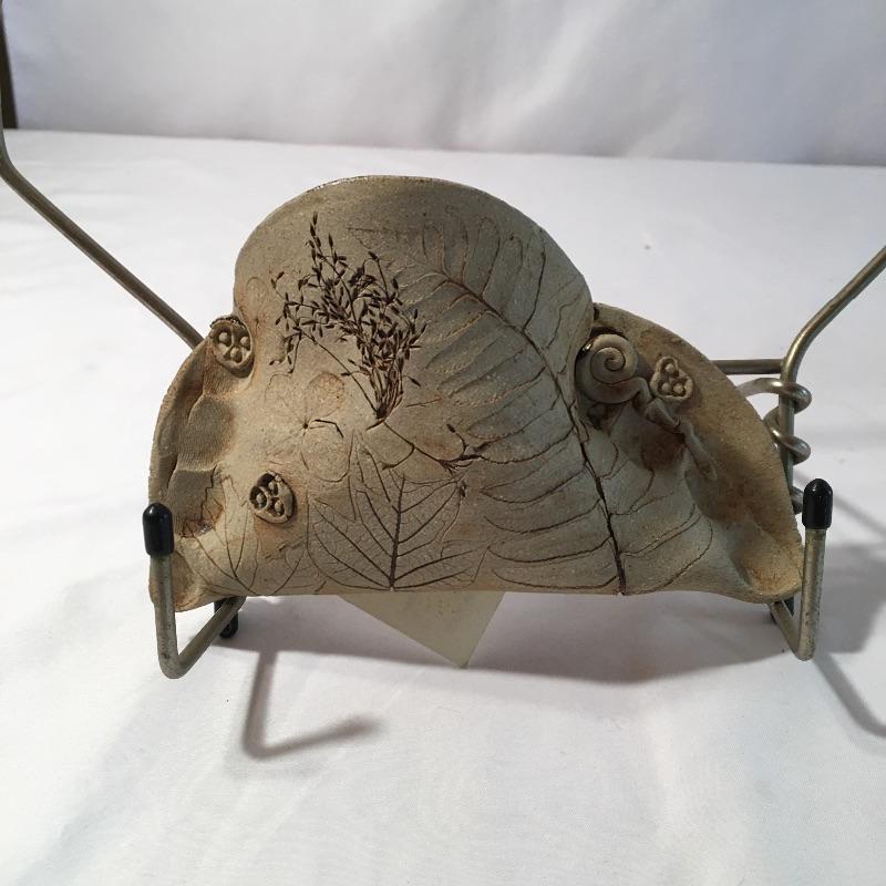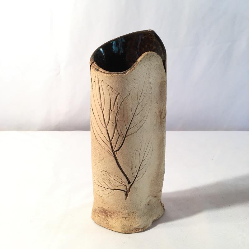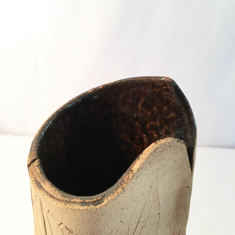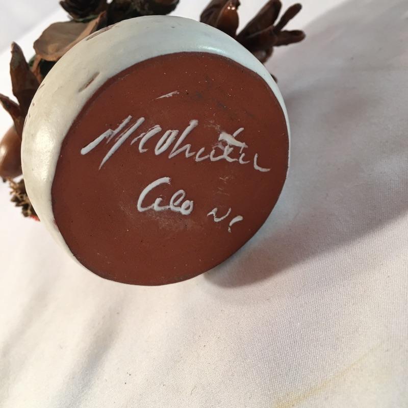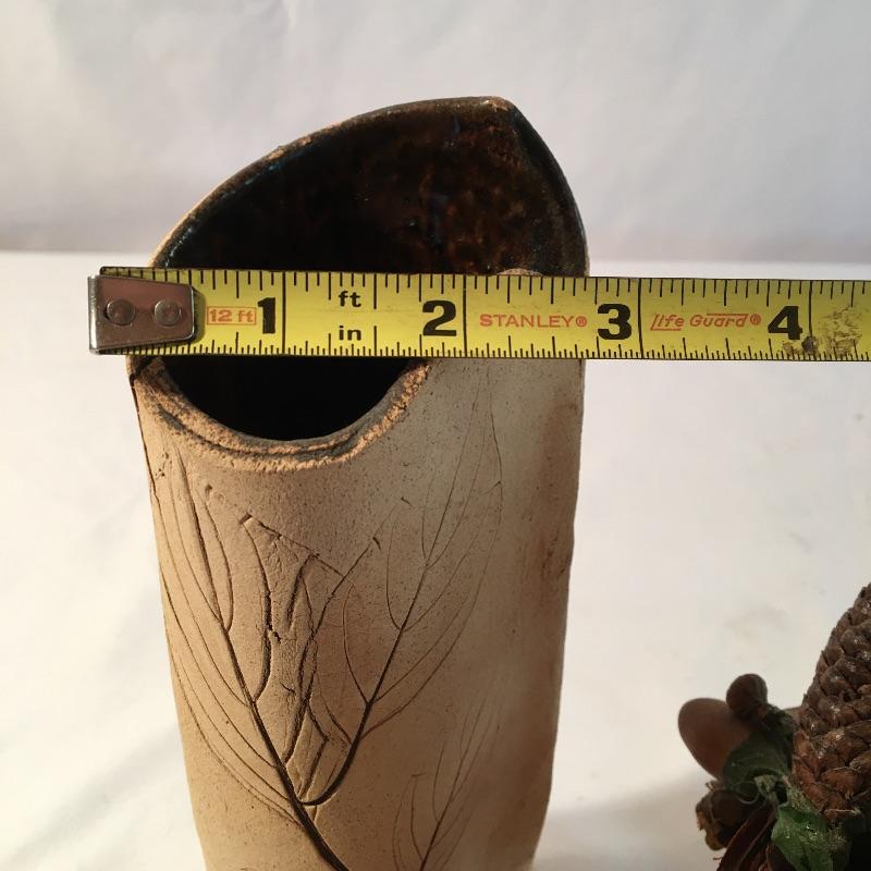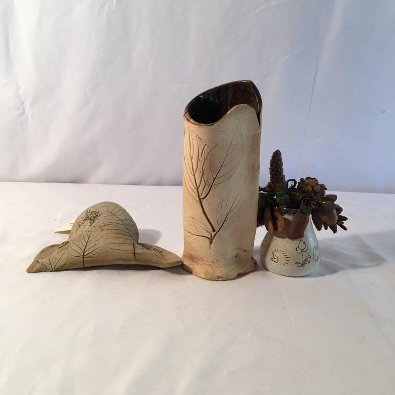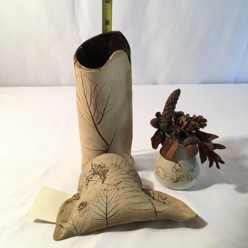 This trio of pottery vases includes a wall pocket by Tom and Patricia Hooten, a vase with leaf imprints and a small Signed vase with carved animals and plants.