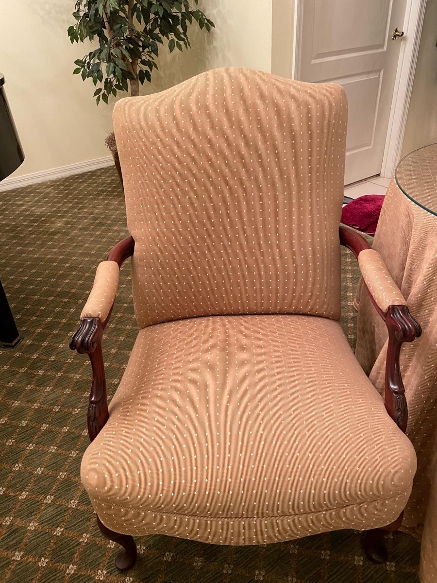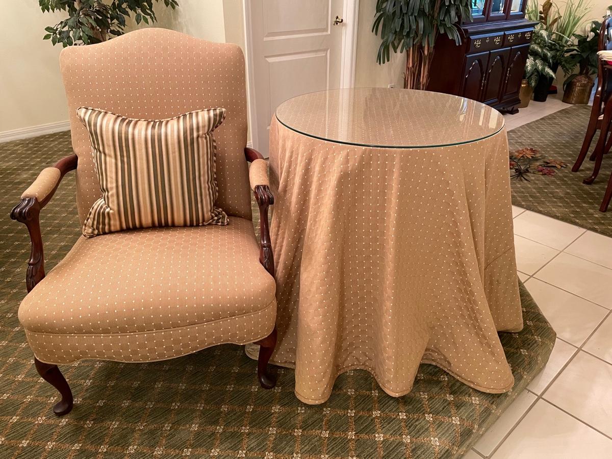 Vintage side chair beautifully reupholstered in gold fabric with matching table skirt over a particle board table base. 28" diameter with custom glass top. Includes custom pillow