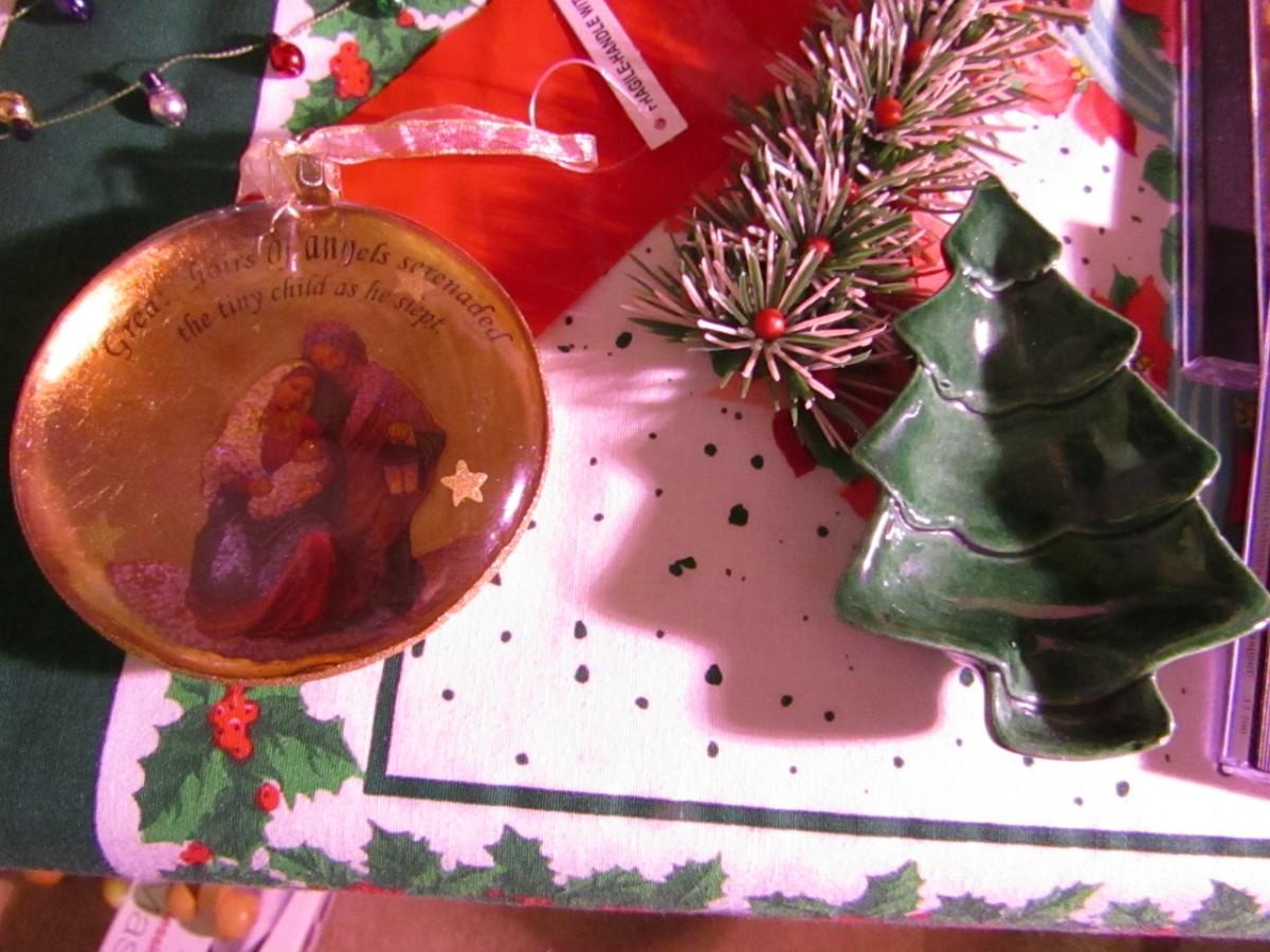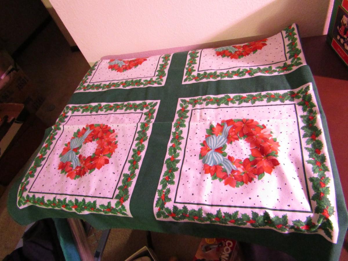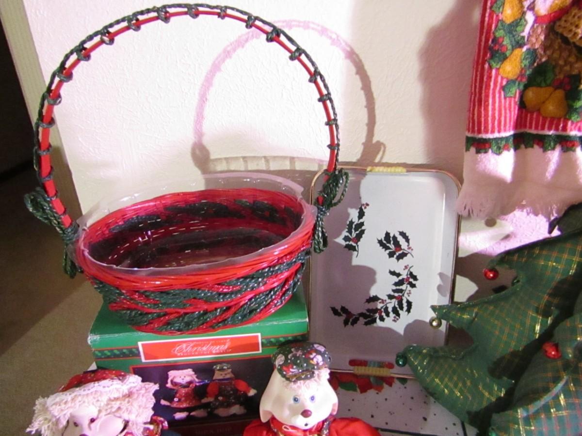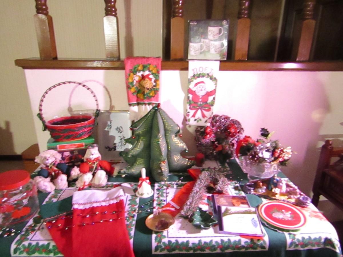 RECTANGLE TABLECLOTH, DISH TOWELS, PLUSH TREE, SMALL WREATH, TABLE DECORATION, NATIVITY SCENE CANDLE HOLDER, NIB COFFEE CUPS, HOUSE OF FLOYD HIP AND HOP CHARACTERS, STOCKINGS, BASKET AND MORE