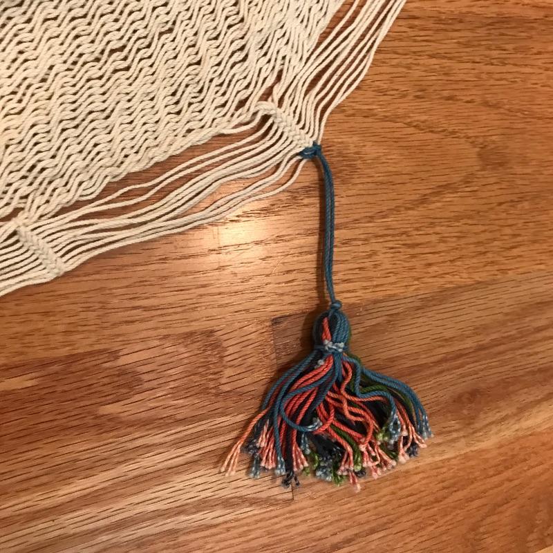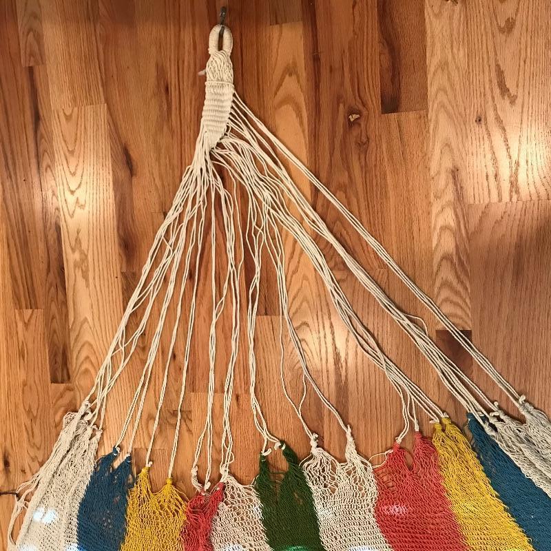 Cute and fun woven hammock in amazing condition! It almost appears to have never been used outside. Outstretched fully the hammock 13’ and it’s approximately 66” wide. See photos. Shipping available.