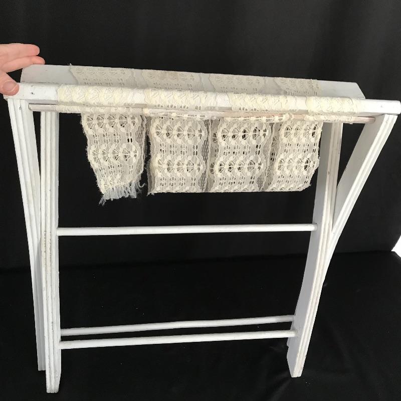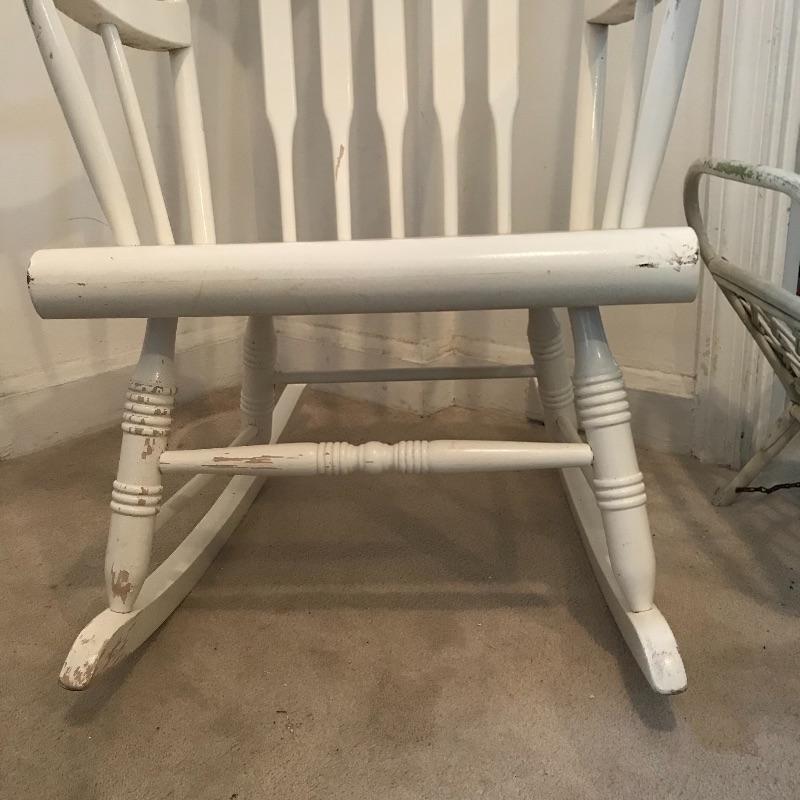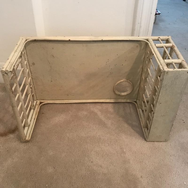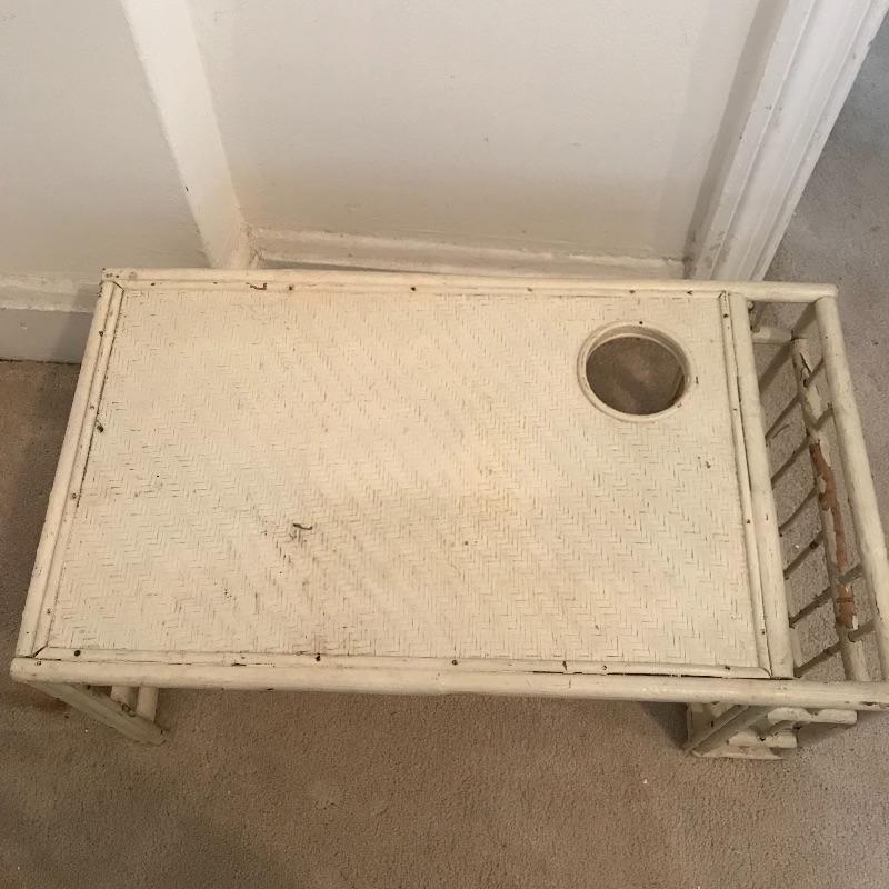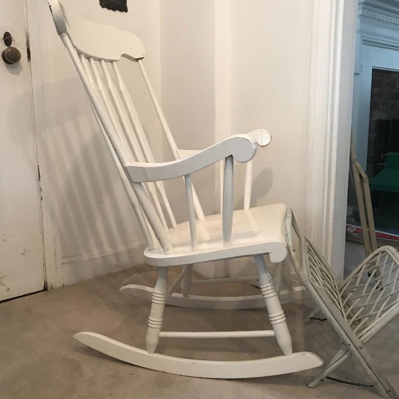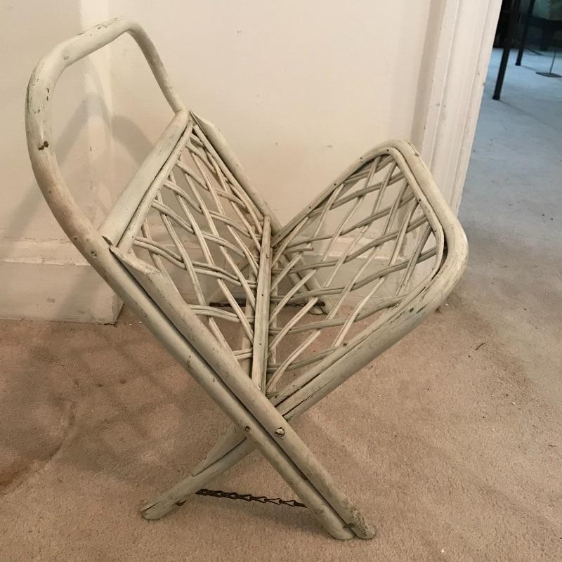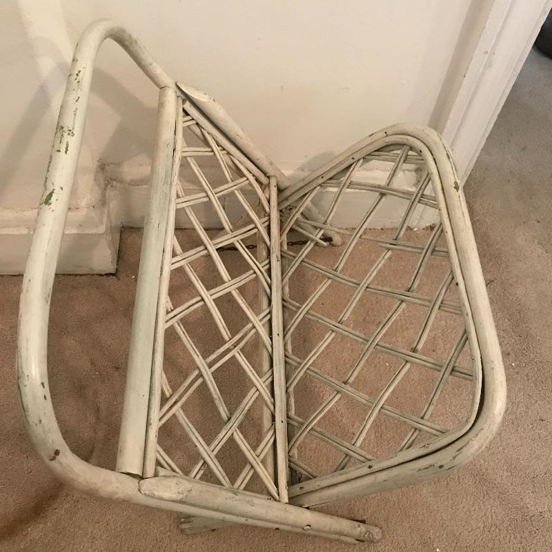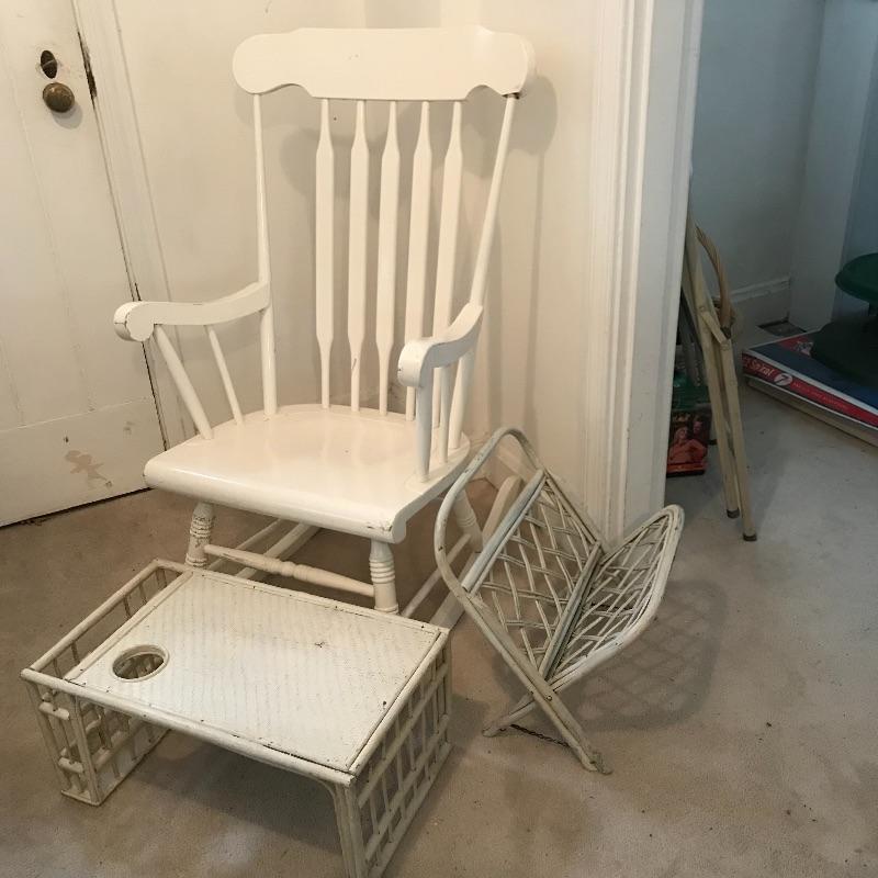 White rocker in fair shape, some scuffs in the paint are noted in photos. There is a chip in the top frame and the peg comes loose when rocking, but it appears to be a reasonable fix. A magazine tray with cup holder and rattan magazine rack would make a terrific addition as rustic decor, or a little refurbishing to make classy and functional! Lot also includes a small luggage rack with one band a little disheveled. Chair measures approximately 24” x 17” x 42”. No shipping.