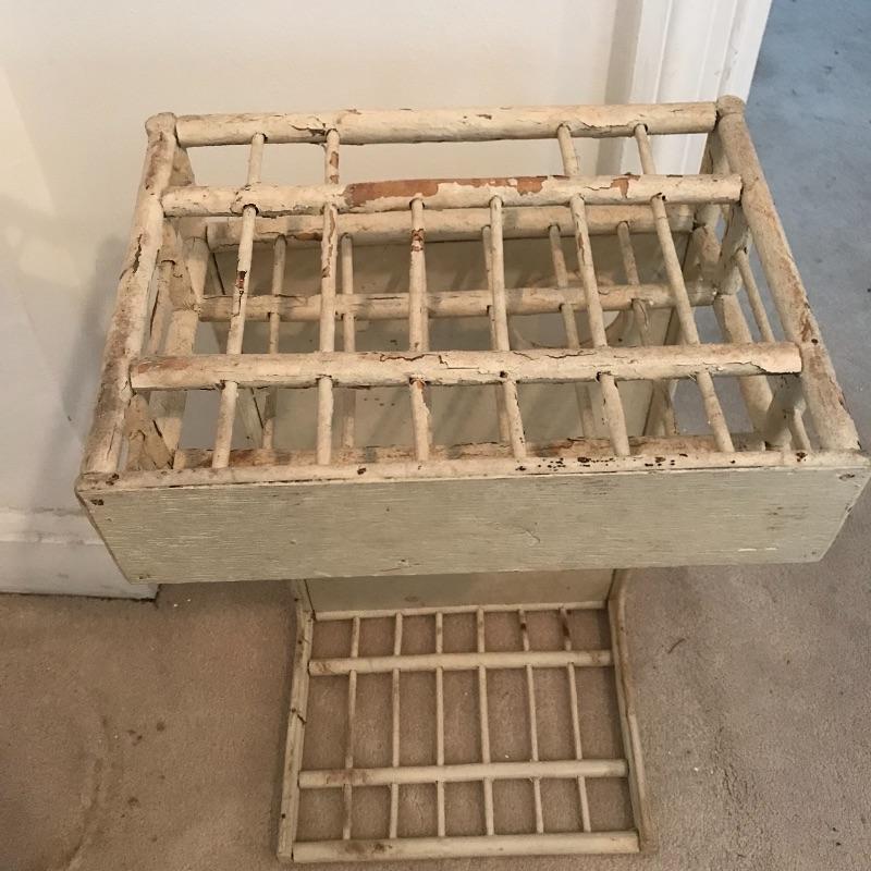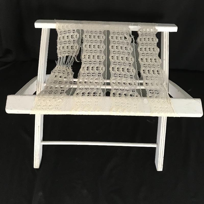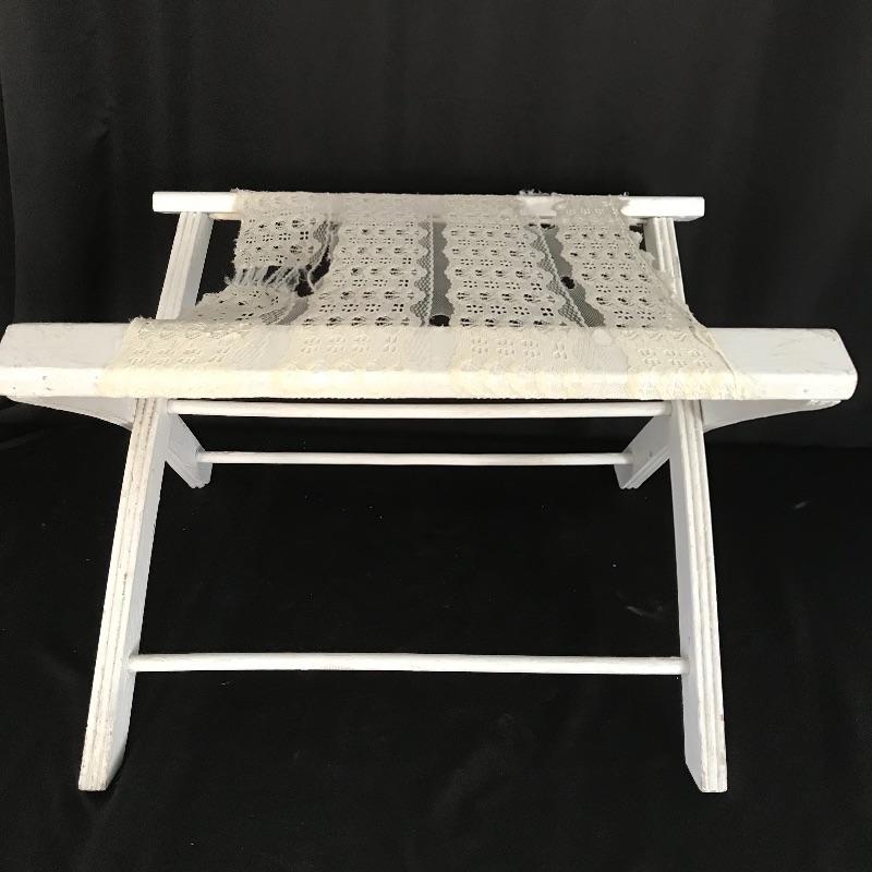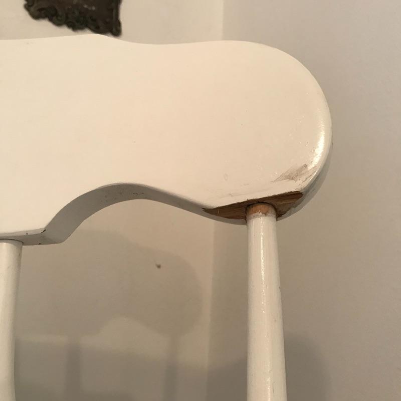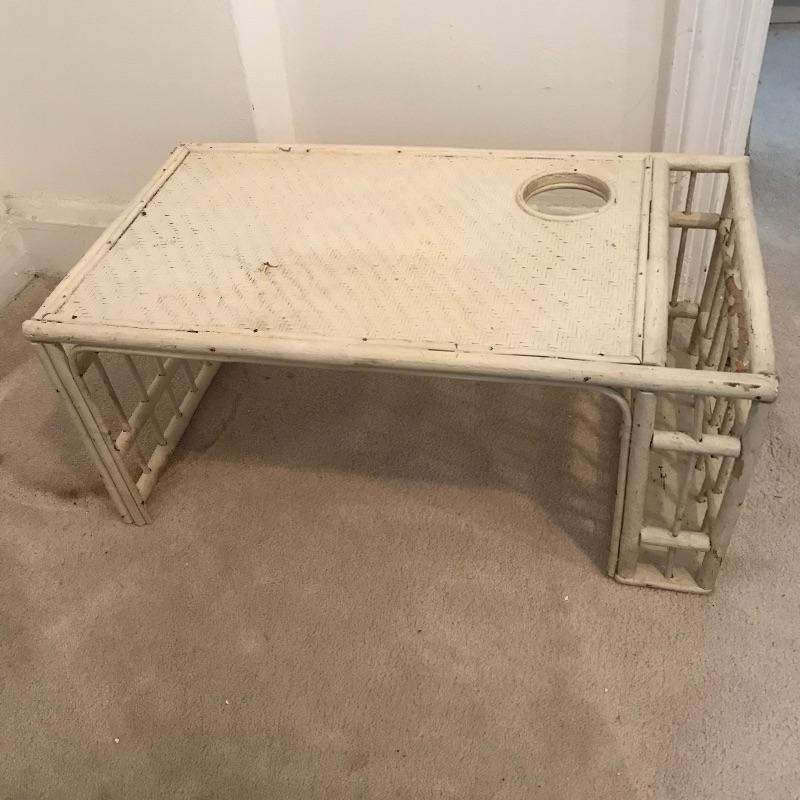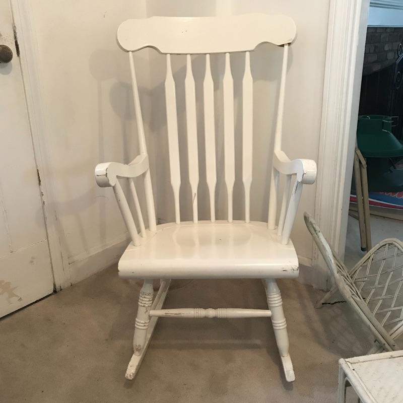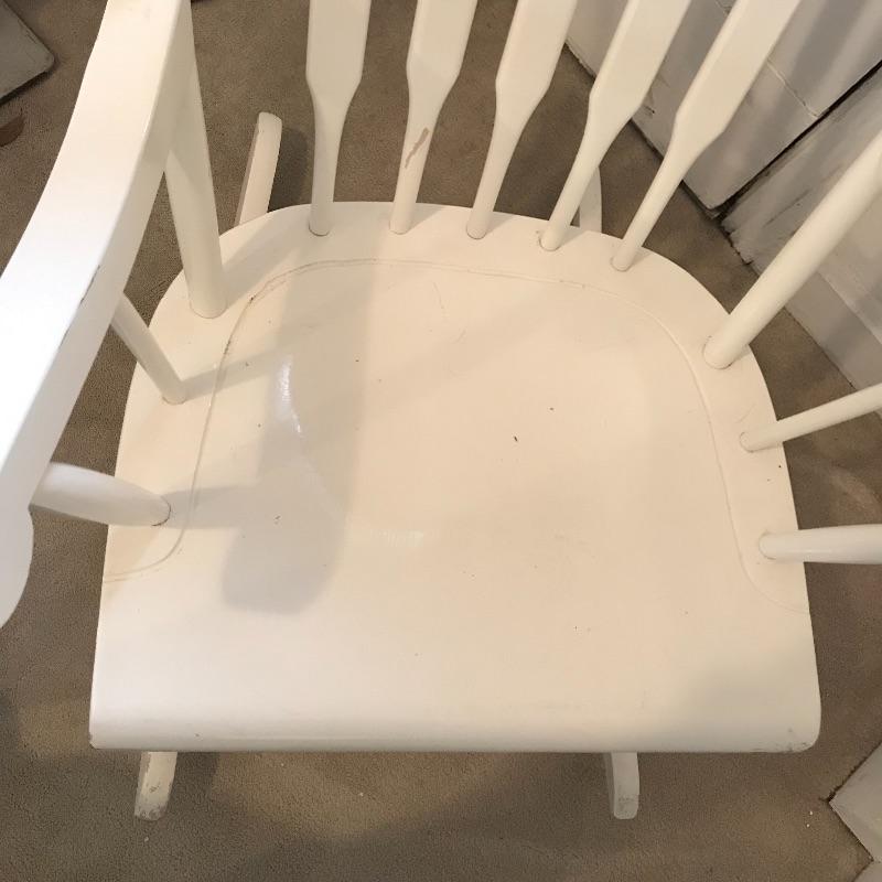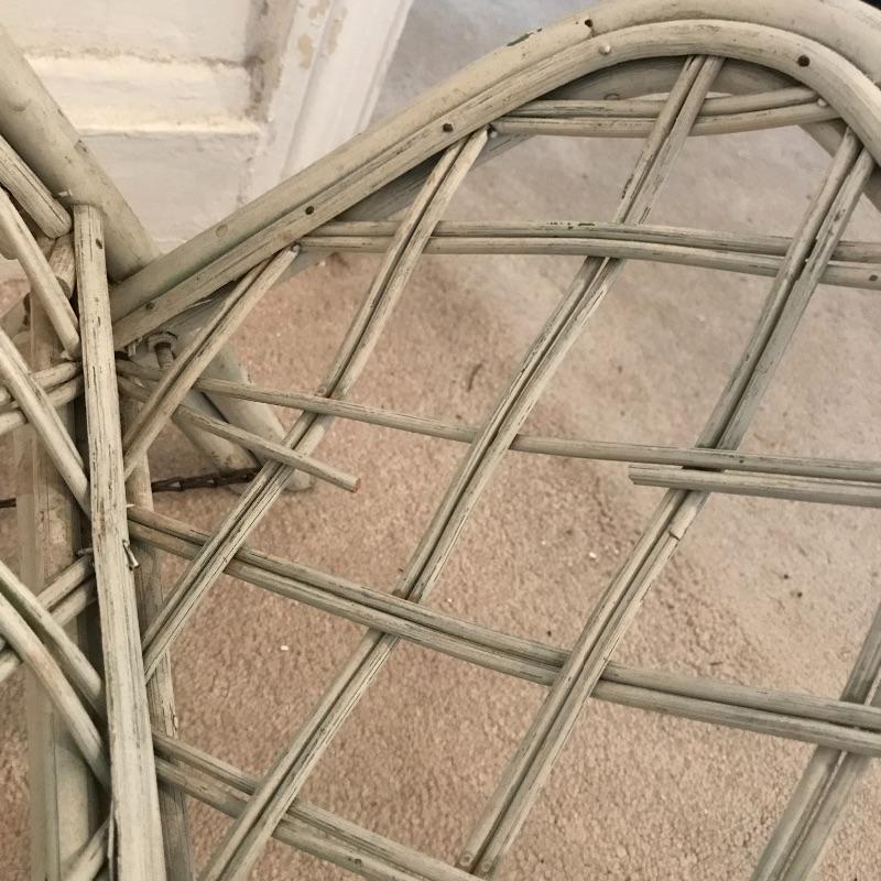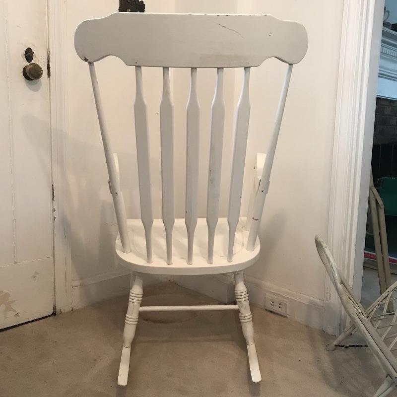 White rocker in fair shape, some scuffs in the paint are noted in photos. There is a chip in the top frame and the peg comes loose when rocking, but it appears to be a reasonable fix. A magazine tray with cup holder and rattan magazine rack would make a terrific addition as rustic decor, or a little refurbishing to make classy and functional! Lot also includes a small luggage rack with one band a little disheveled. Chair measures approximately 24” x 17” x 42”. No shipping.