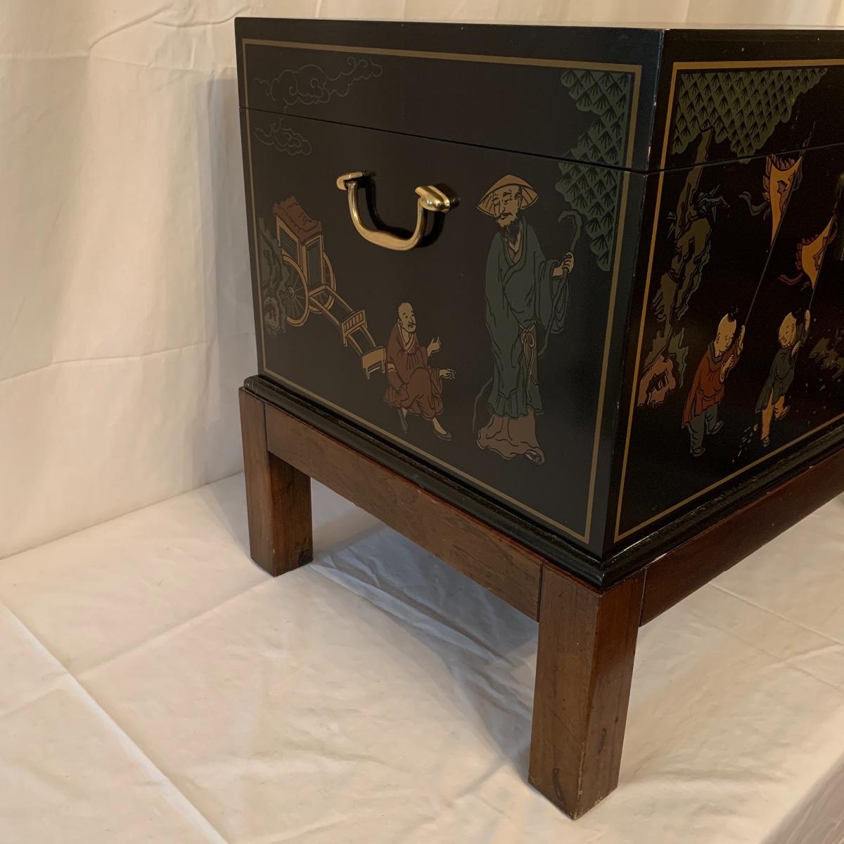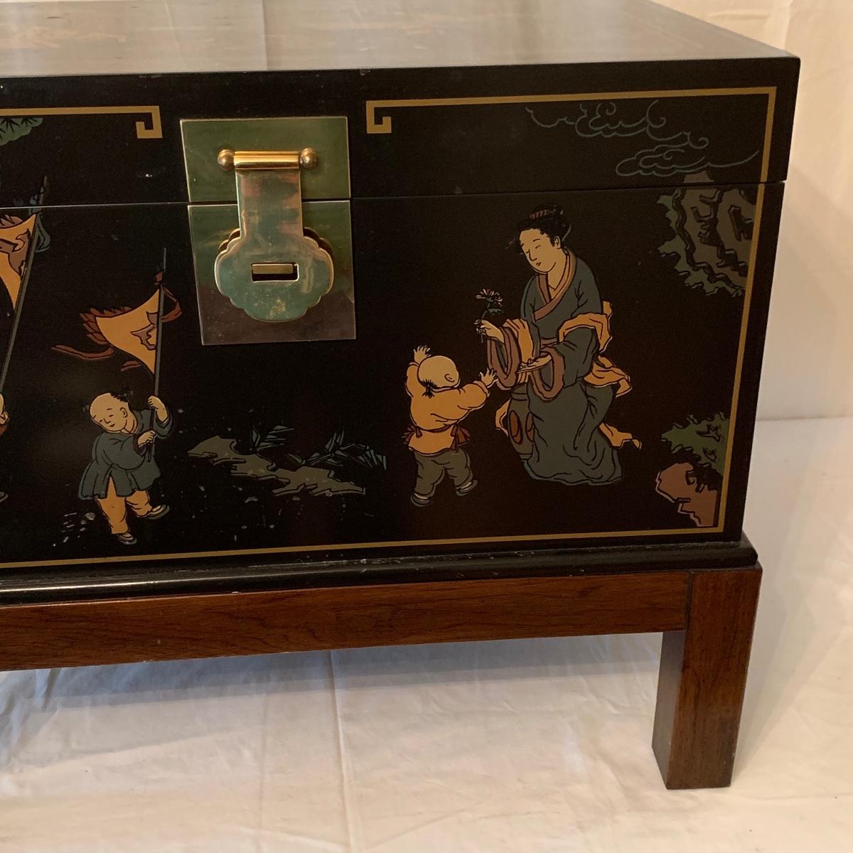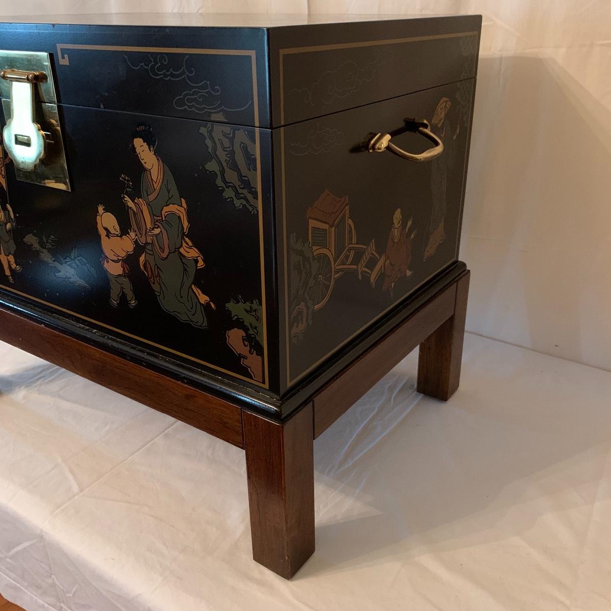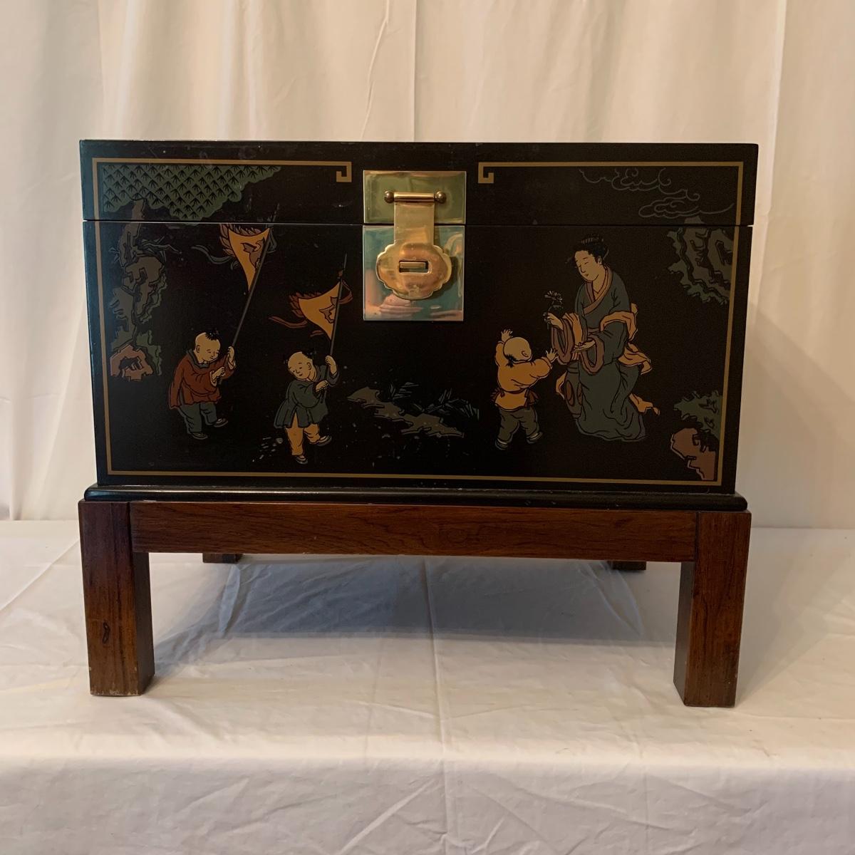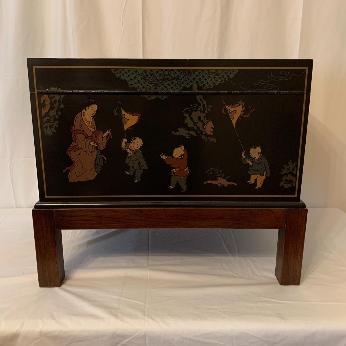 This is a beautiful chest by Drexel Heritage Furnishings that is decorated with Asian scenery. It is mounted on a wooden frame. It has a gold colored latch on the front and handles on each side. The whole unit measures 24” x 17” x 20.5”. The inside of the chest (not including the lid) measures 9” x 21.5” x 14.5”. Shipping available.