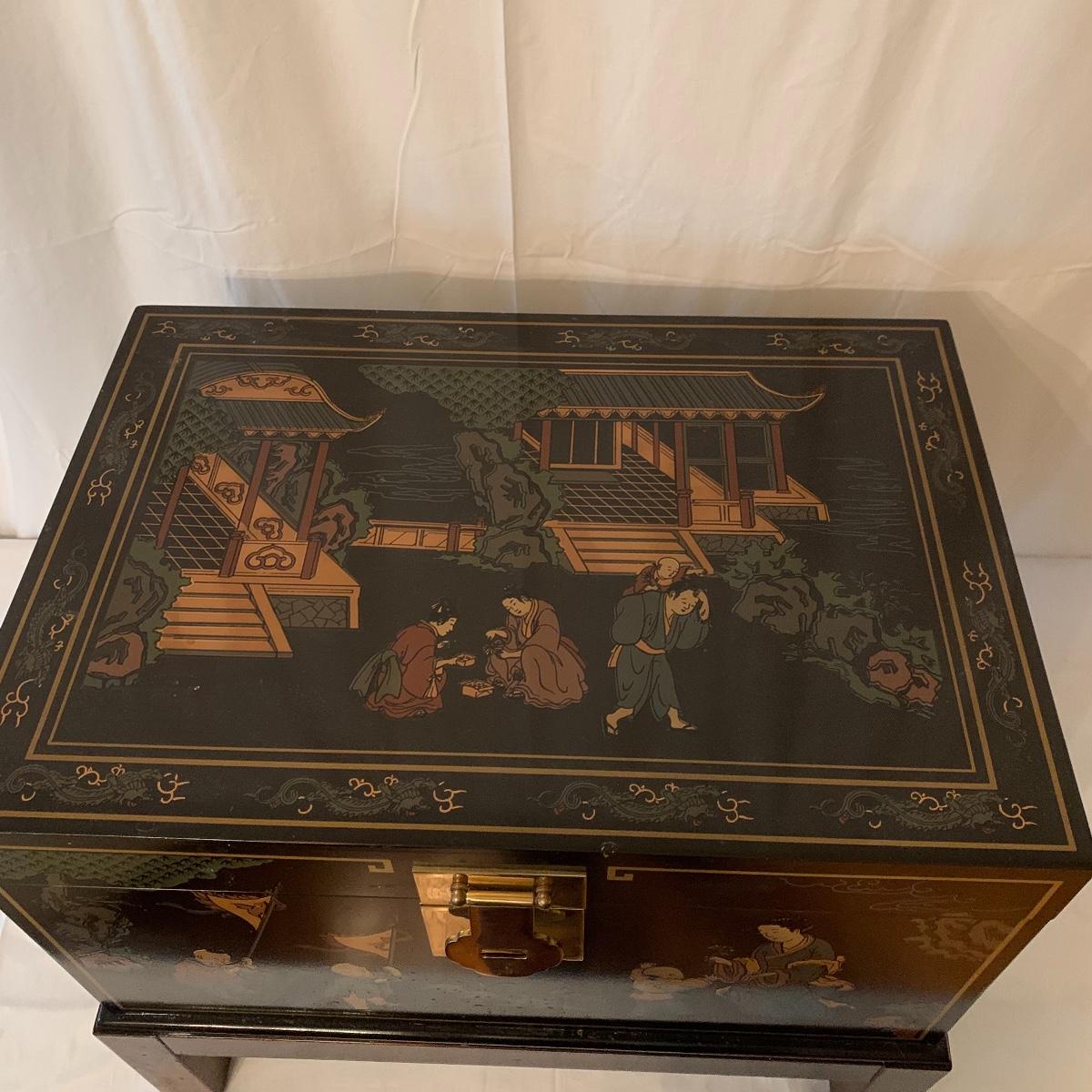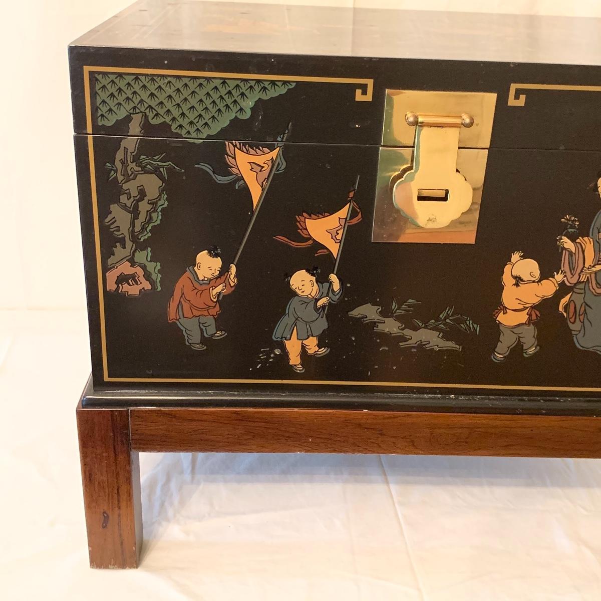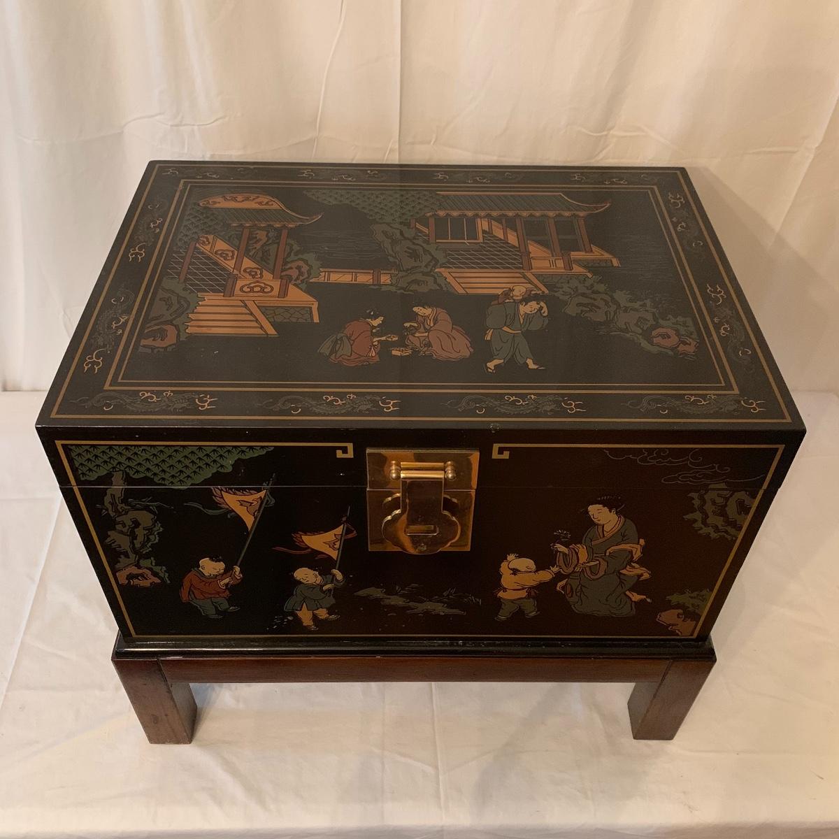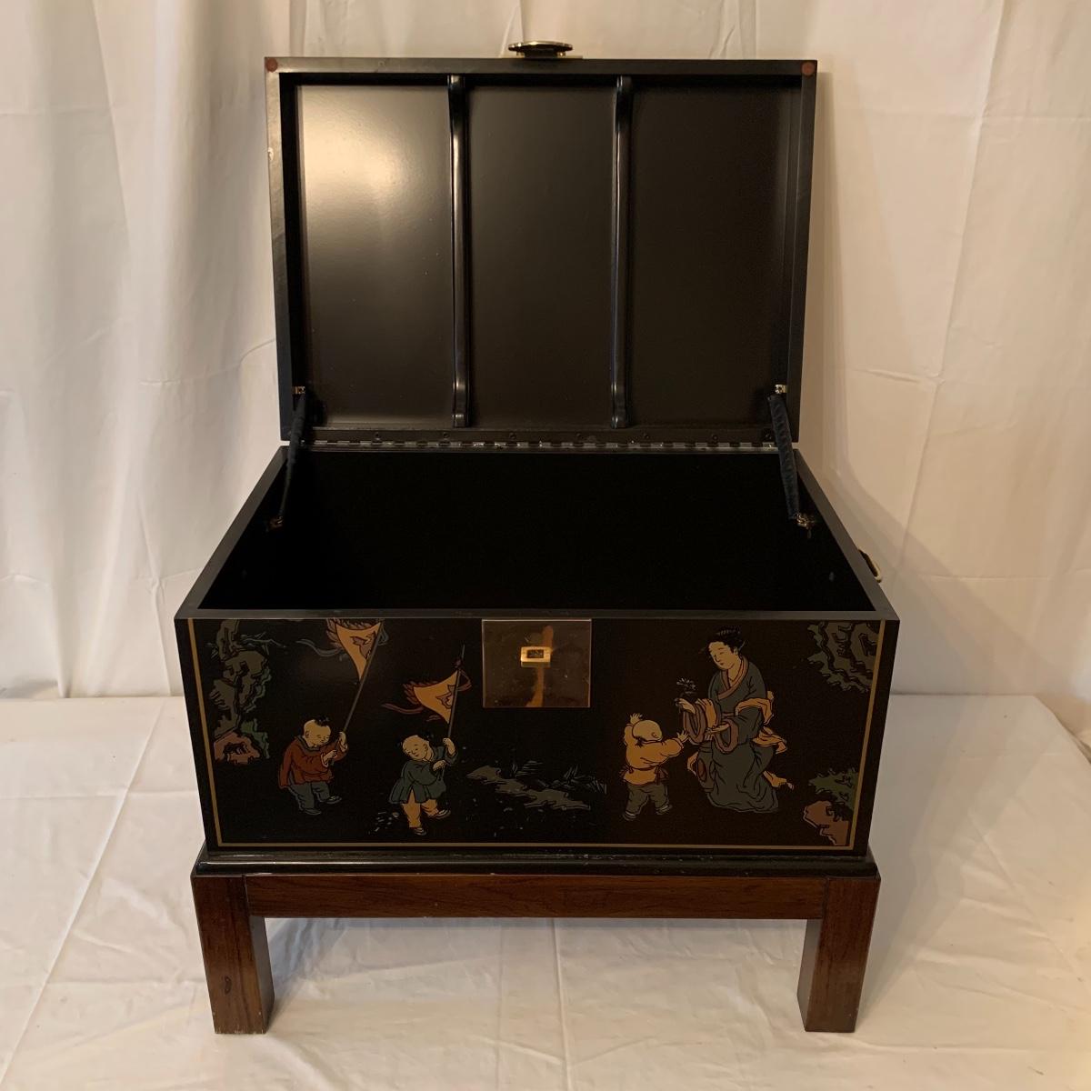 This is a beautiful chest by Drexel Heritage Furnishings that is decorated with Asian scenery. It is mounted on a wooden frame. It has a gold colored latch on the front and handles on each side. The whole unit measures 24” x 17” x 20.5”. The inside of the chest (not including the lid) measures 9” x 21.5” x 14.5”. Shipping available.