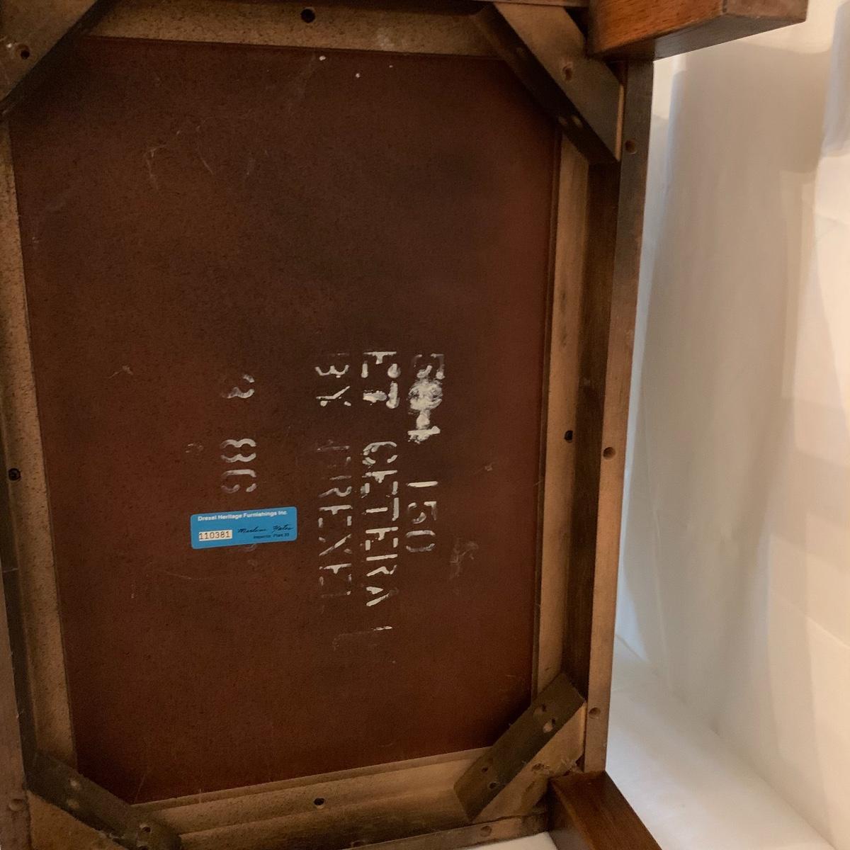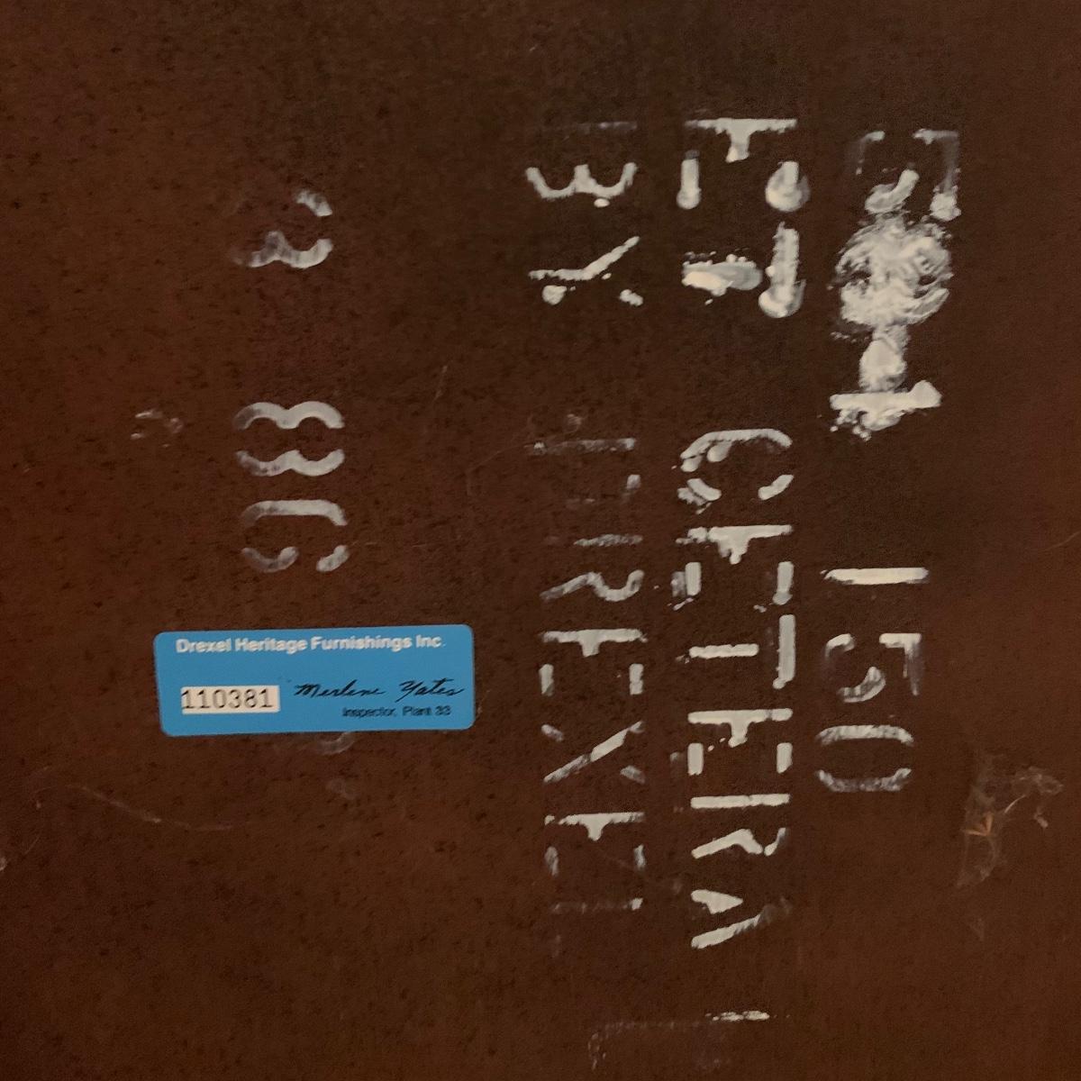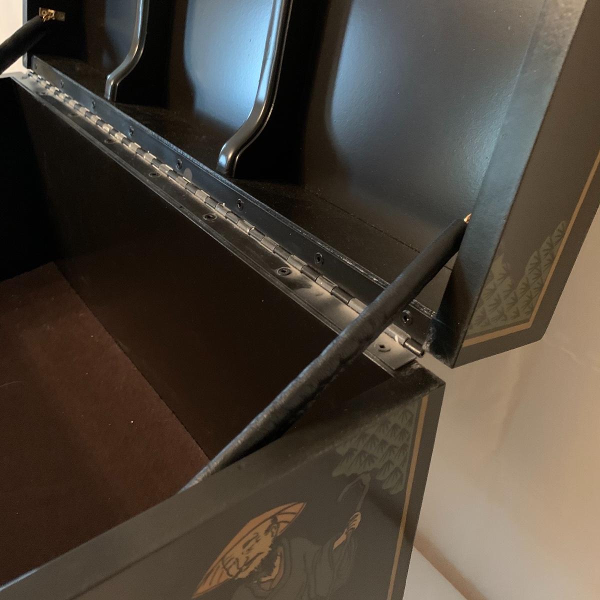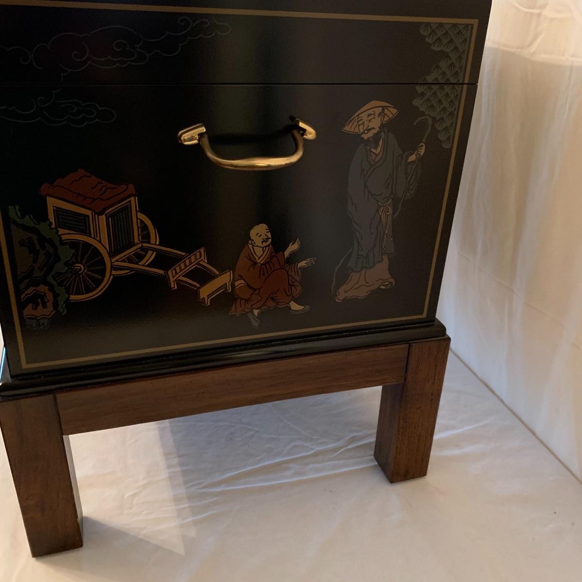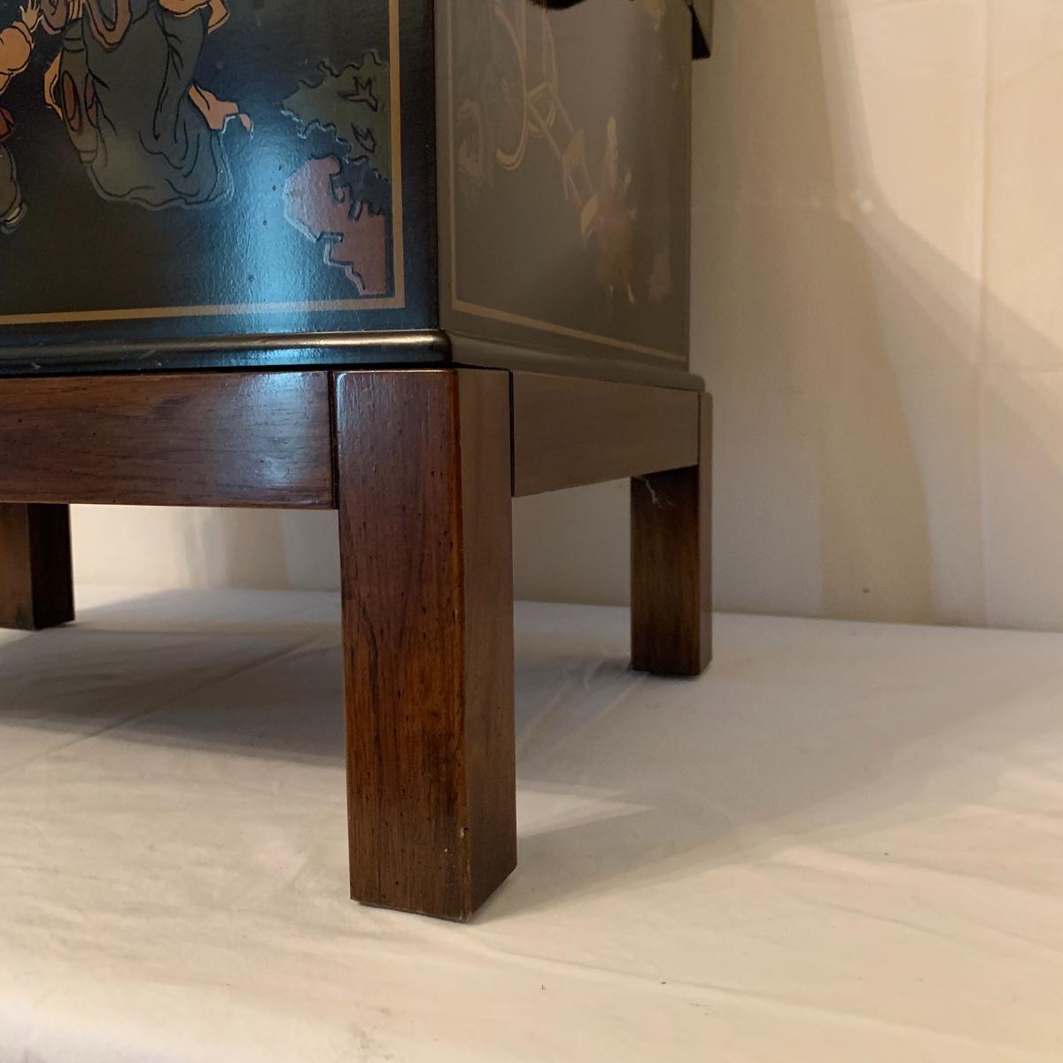 This is a beautiful chest by Drexel Heritage Furnishings that is decorated with Asian scenery. It is mounted on a wooden frame. It has a gold colored latch on the front and handles on each side. The whole unit measures 24” x 17” x 20.5”. The inside of the chest (not including the lid) measures 9” x 21.5” x 14.5”. Shipping available.