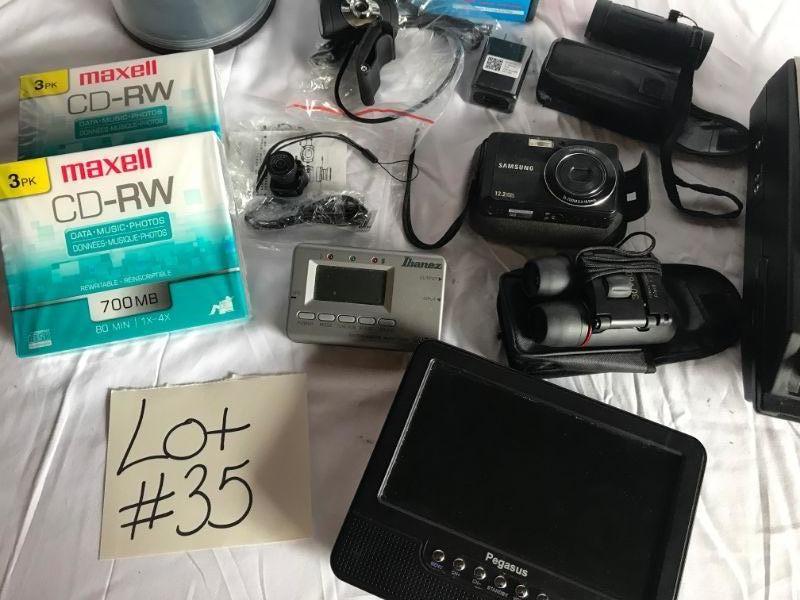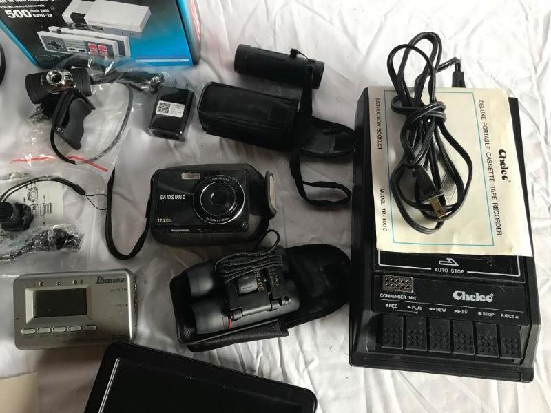 Mini Nintendo, Blank CD's, Ibanez Guitar Tuner, Chelco Portable Tape Recorder, Pegasus Portable DVD Player, Samsung Camera, Spy Cam, Binoculars