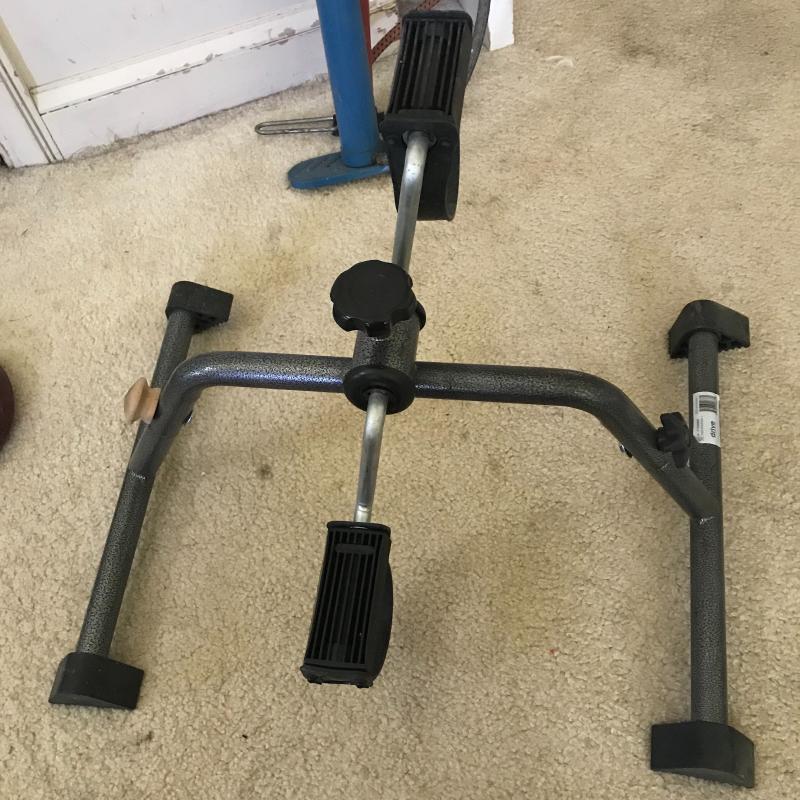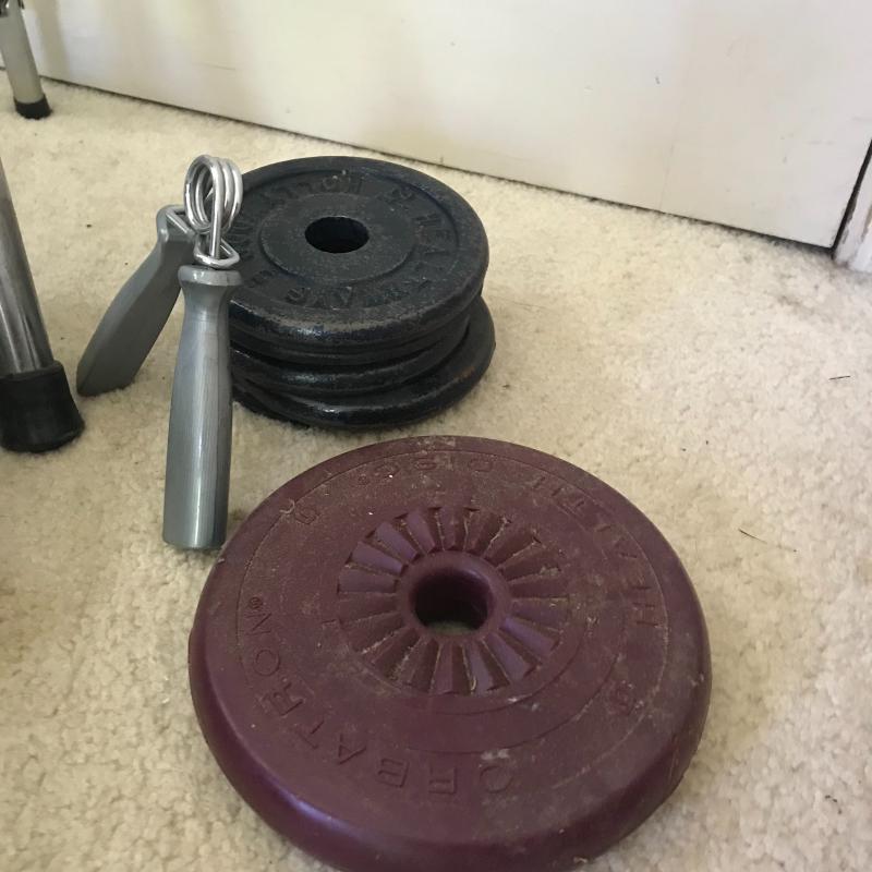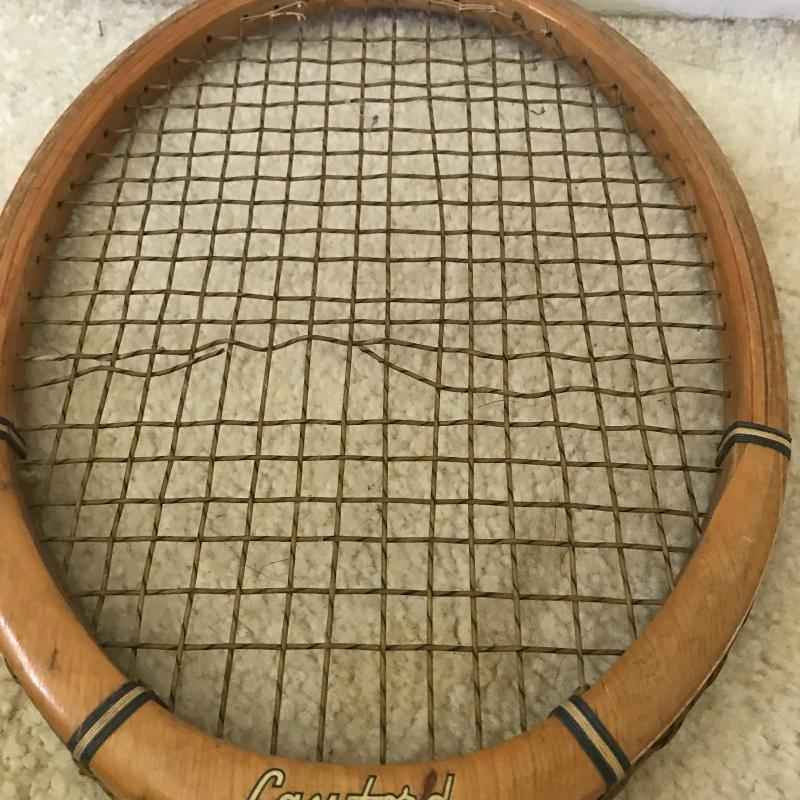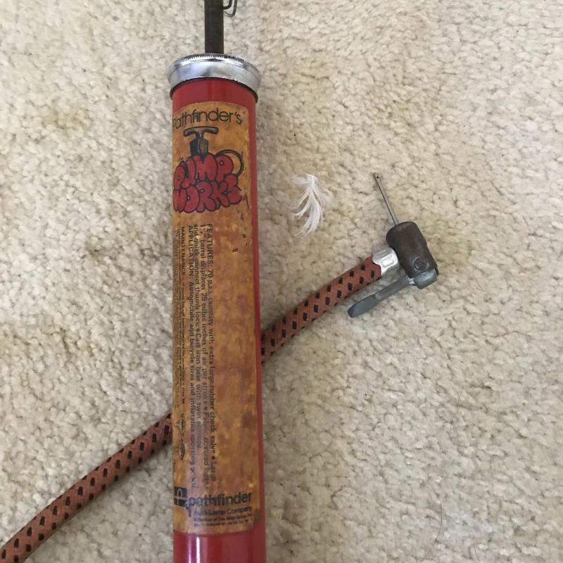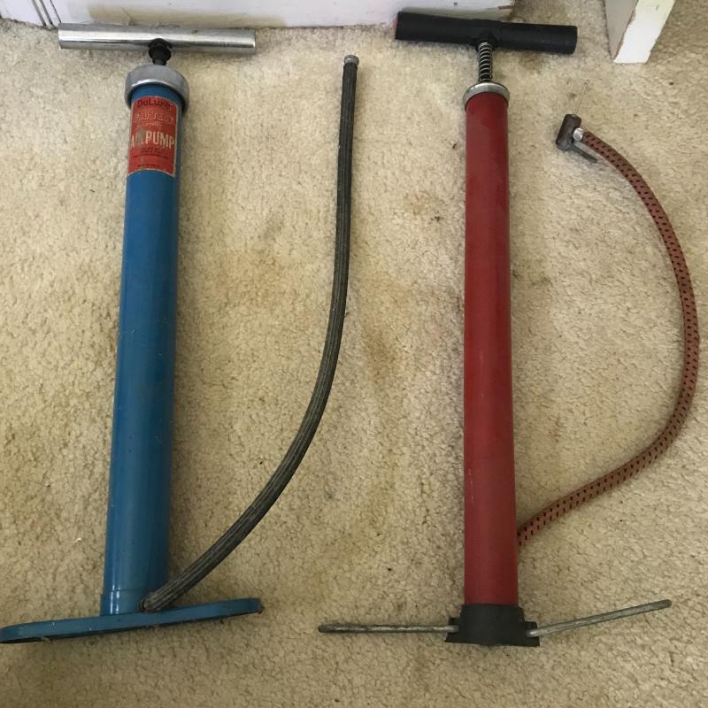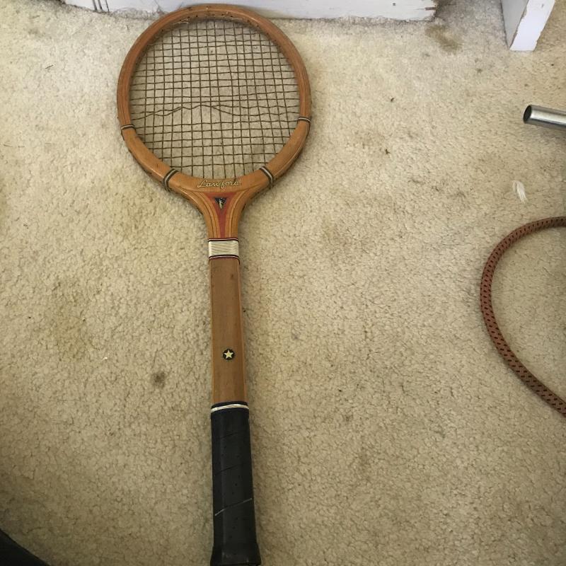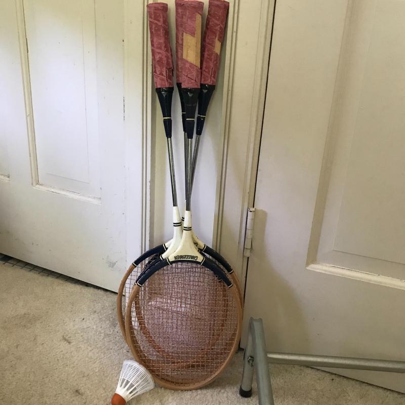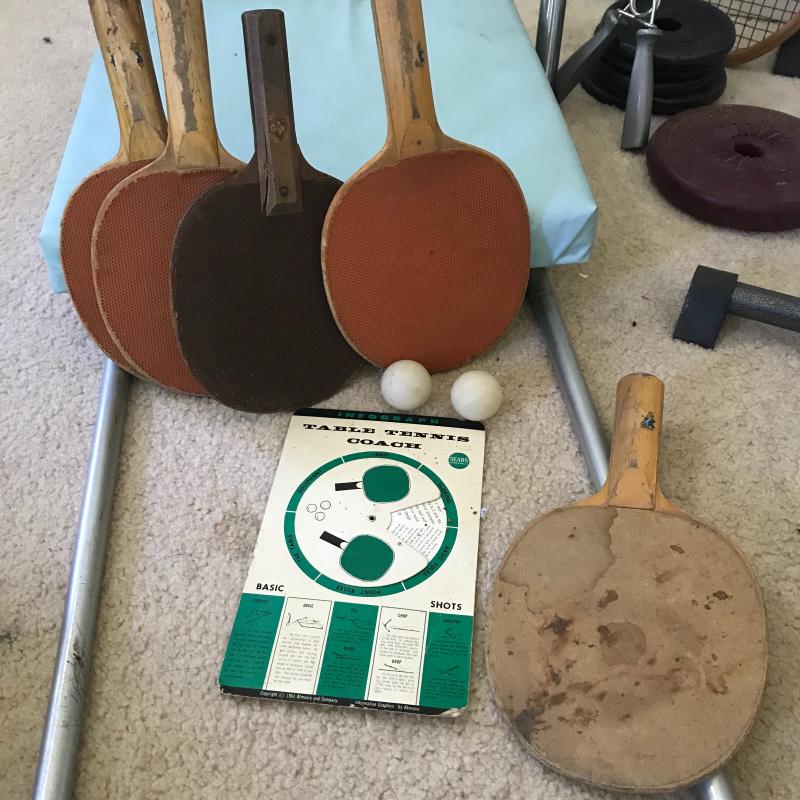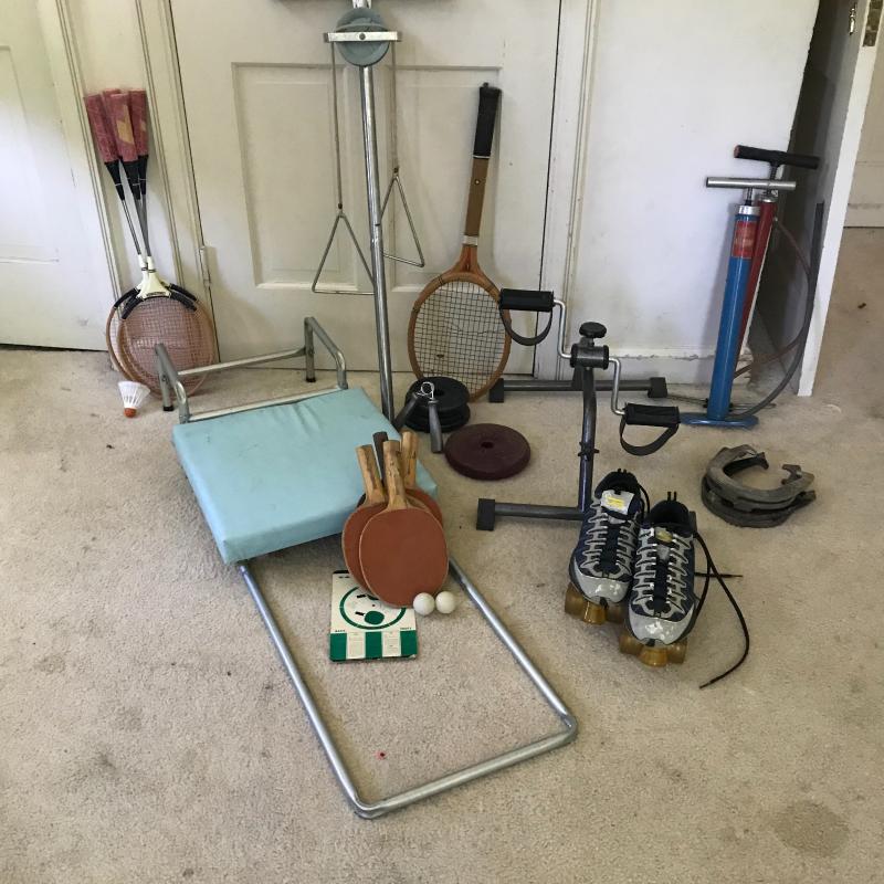 4 Challenger Badminton racquets and birdie (grips are dry rotted), Lawford tennis racquet, 5 table tennis paddles and two balls, vintage air pumps, metal horse shoes, speed skates (men’s size 7 or ladies size 9), vintage glider and pully system, and a few bar bell weights. Lot available for local pick up only.