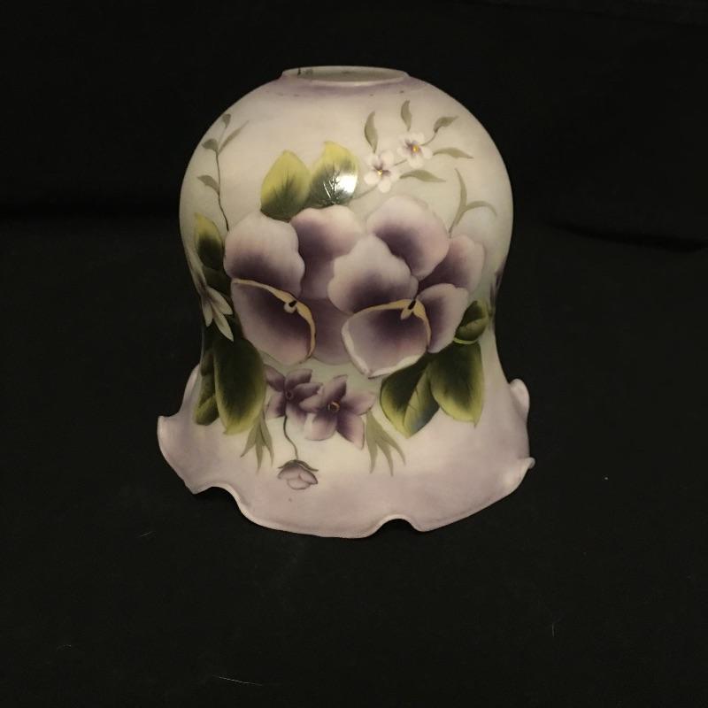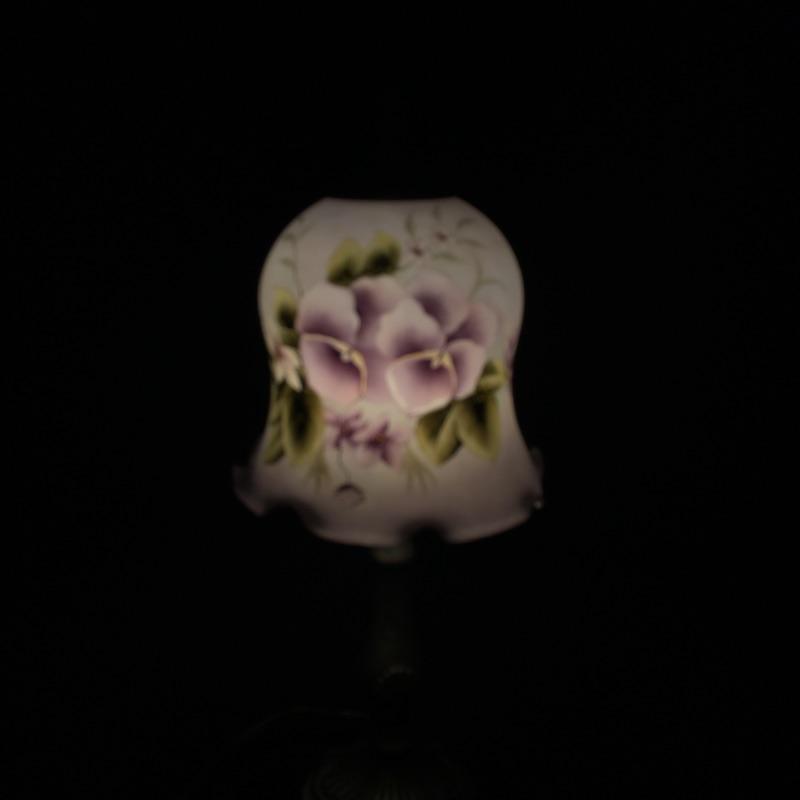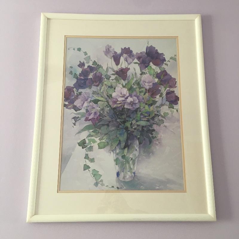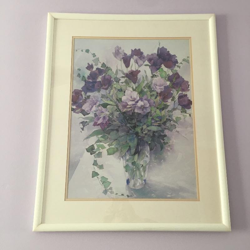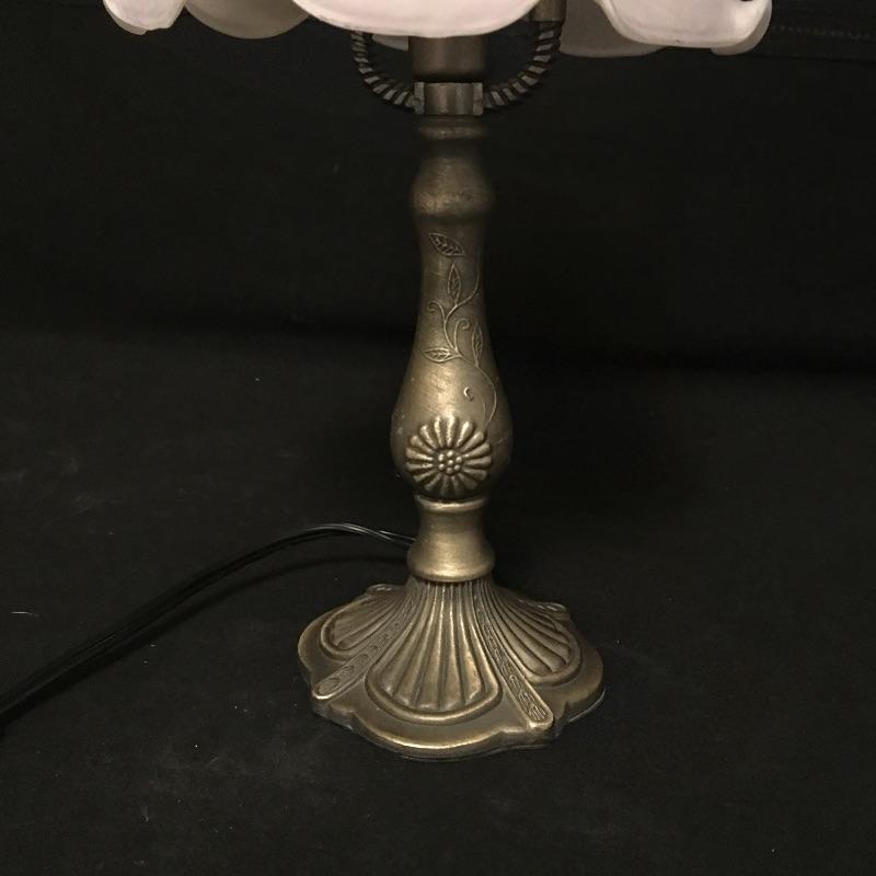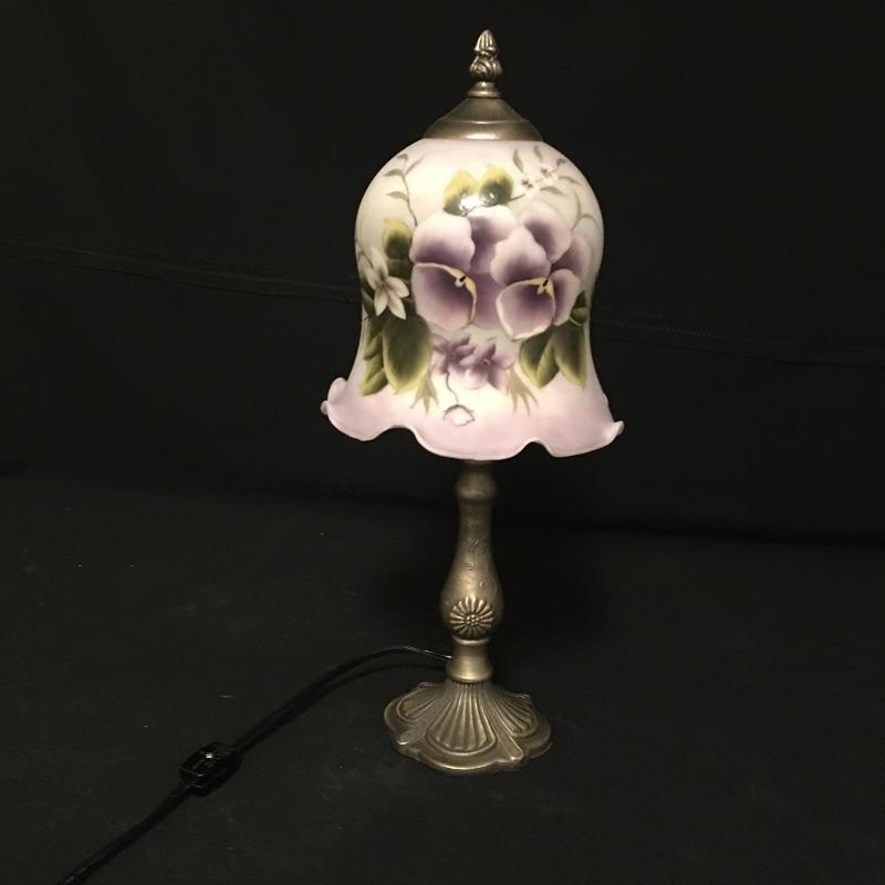 Lovely duo here that compliment each other well with a gorgeous small lamp and a floral piece of framed and matted artwork. The lamp has a metal base with an in-line cord switch and comes with a floral glass shade. Lamp does work. Lamp measures 17” tall with a 7”D and frame measures 25.5” x 31.5”.