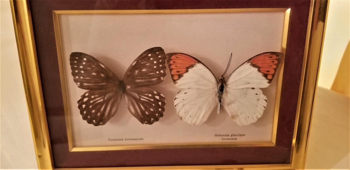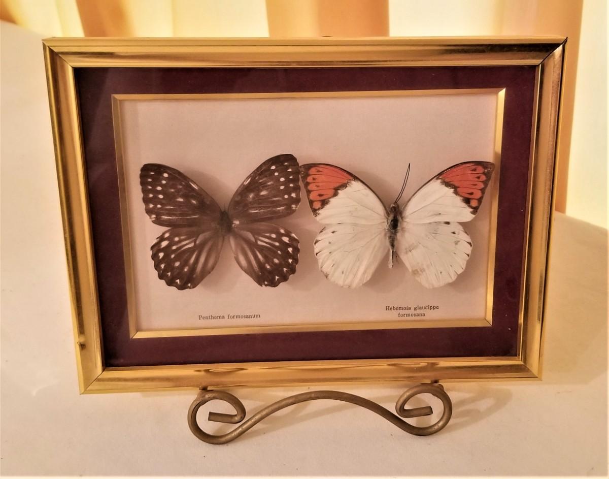 Nice framed pair of butterfly specimens - Penthema formosanum and Hebomoia glancippe formosana. Good condition. Comes with easel, as shown. Back also has a built in easel. 9" x 7".