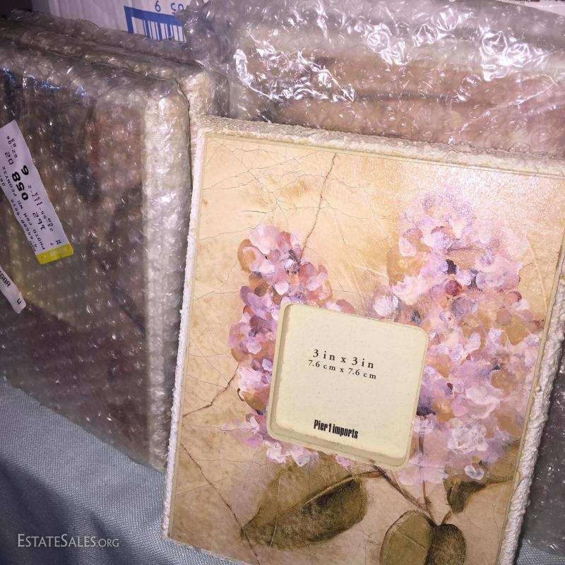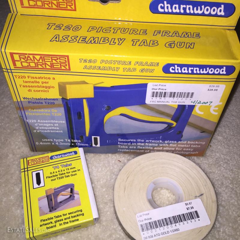 Miscellaneous picture framing/matting materials, decorative mat board, Framers corner picture frame assembly tab gun, total of 5 Pier 1imports picture frames 3" L x 3" H.