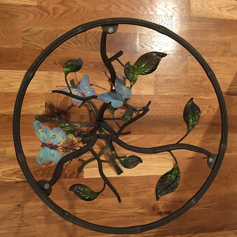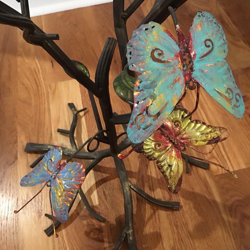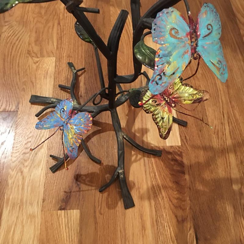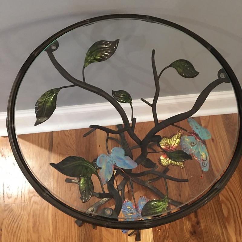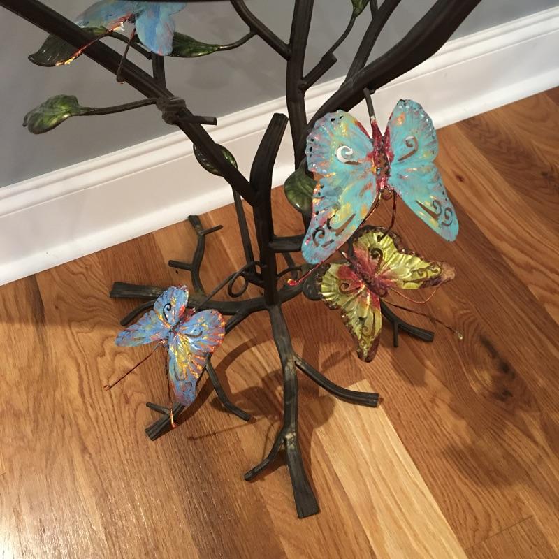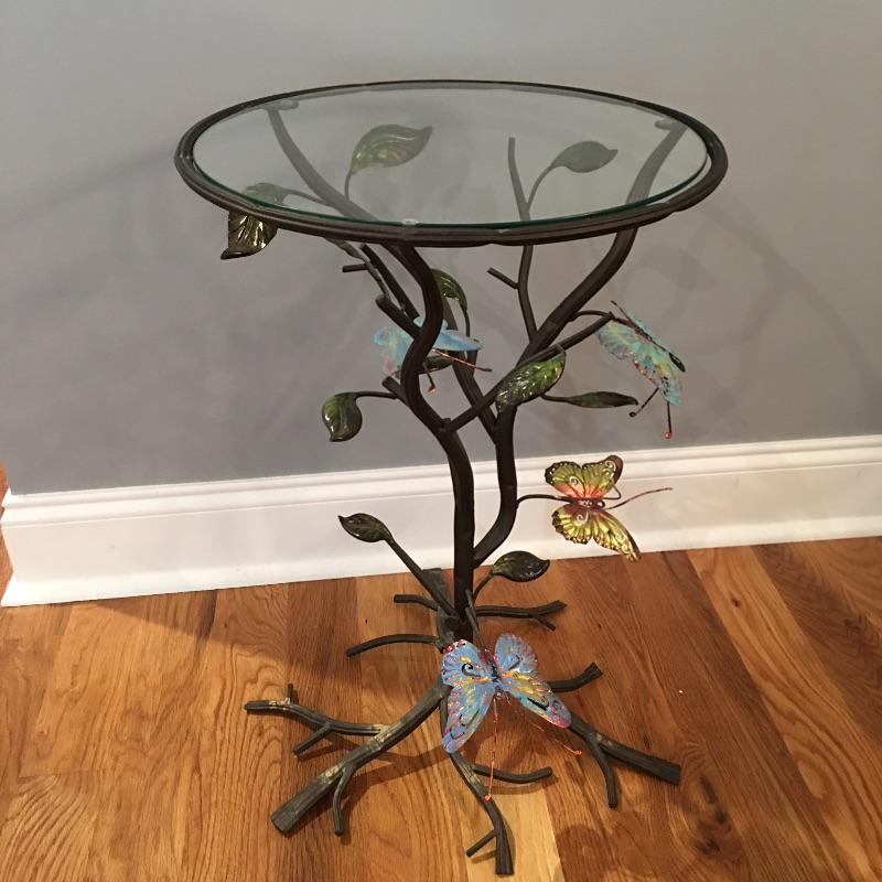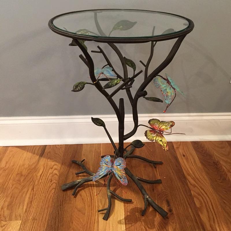 Quaint and fanciful, this glass topped side table has metal branches for its base with colorful butterflies interspersed on the branches. Very pleasing to look at and useful to boot, this piece will add unique beauty to any space.
