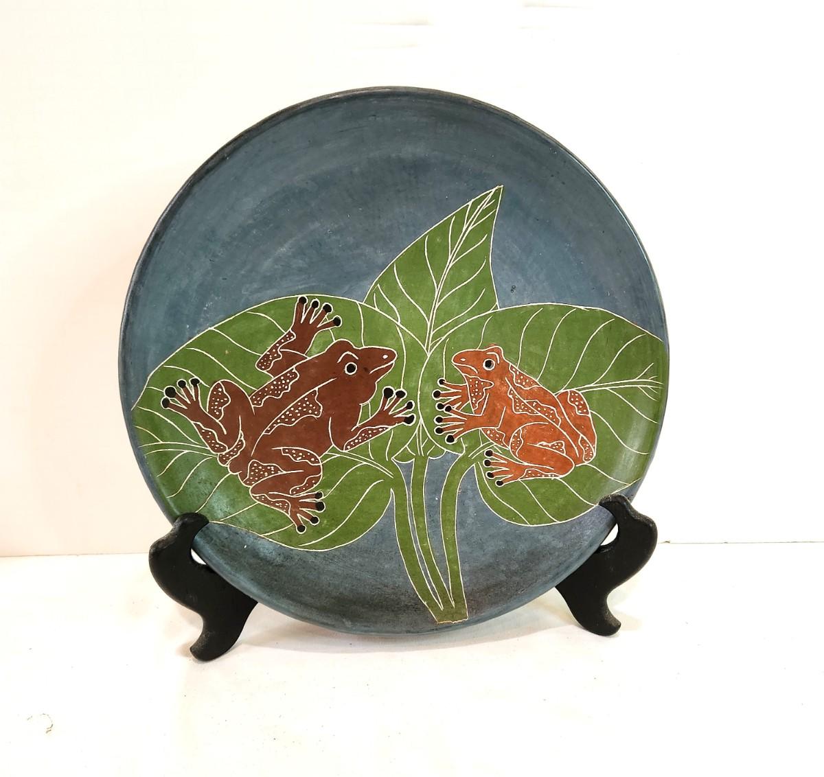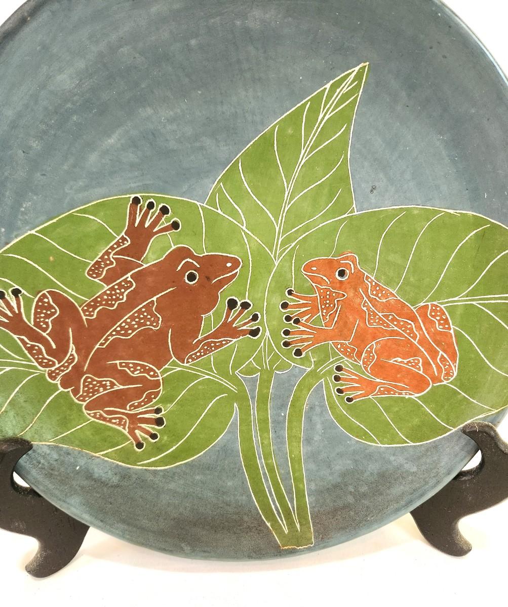 Handmade pottery plate - Nicaraguan - 2 frogs. Indistinguishable signature. 10.25" across. Good condition. Does not come with easel.