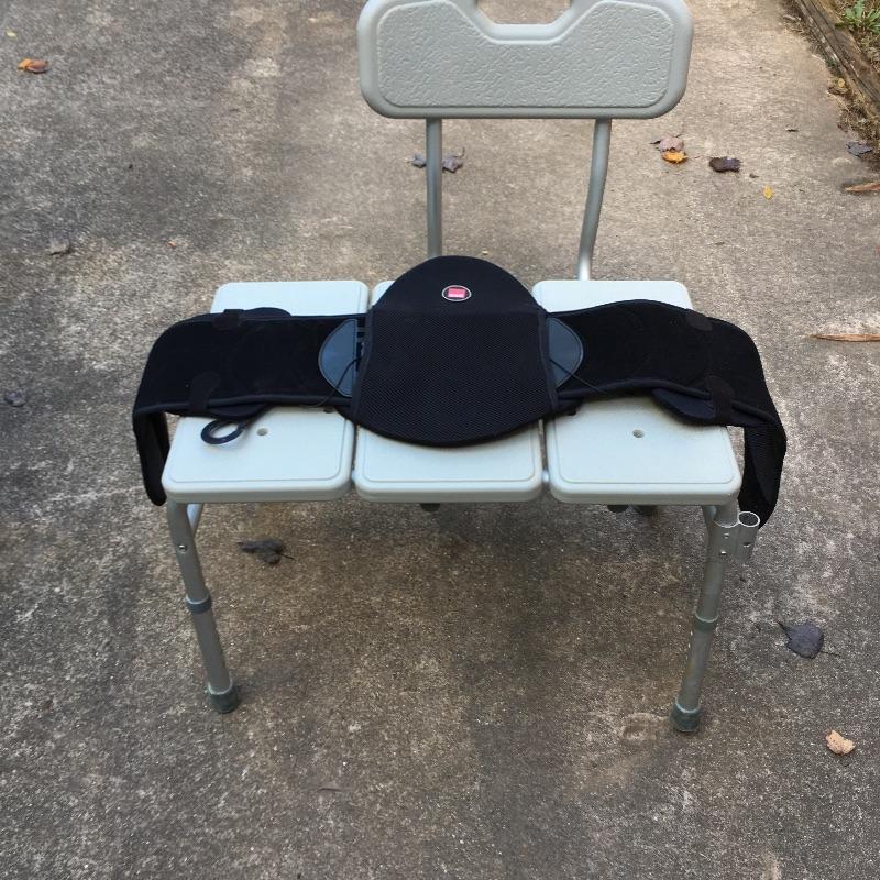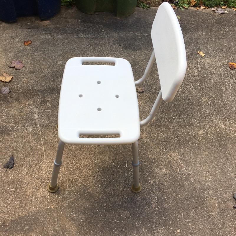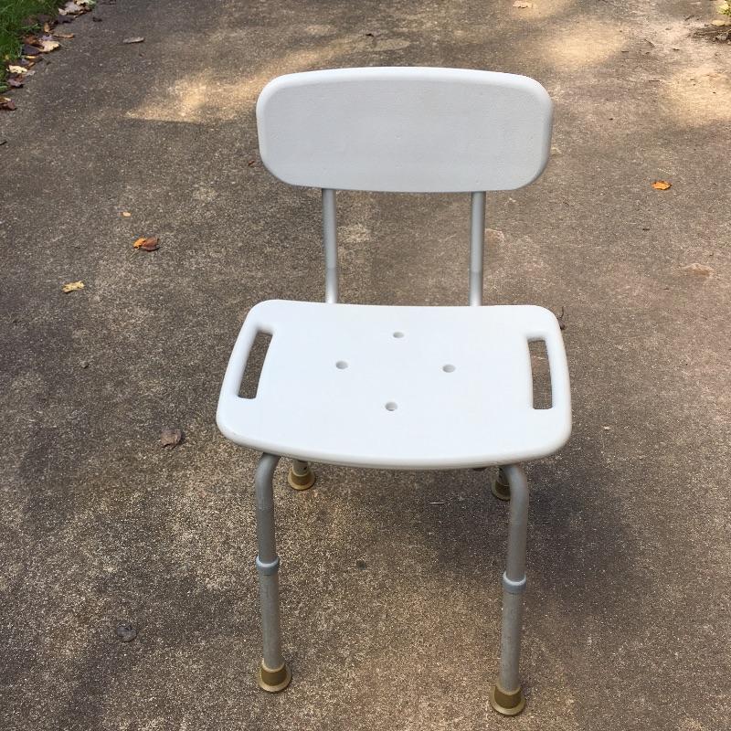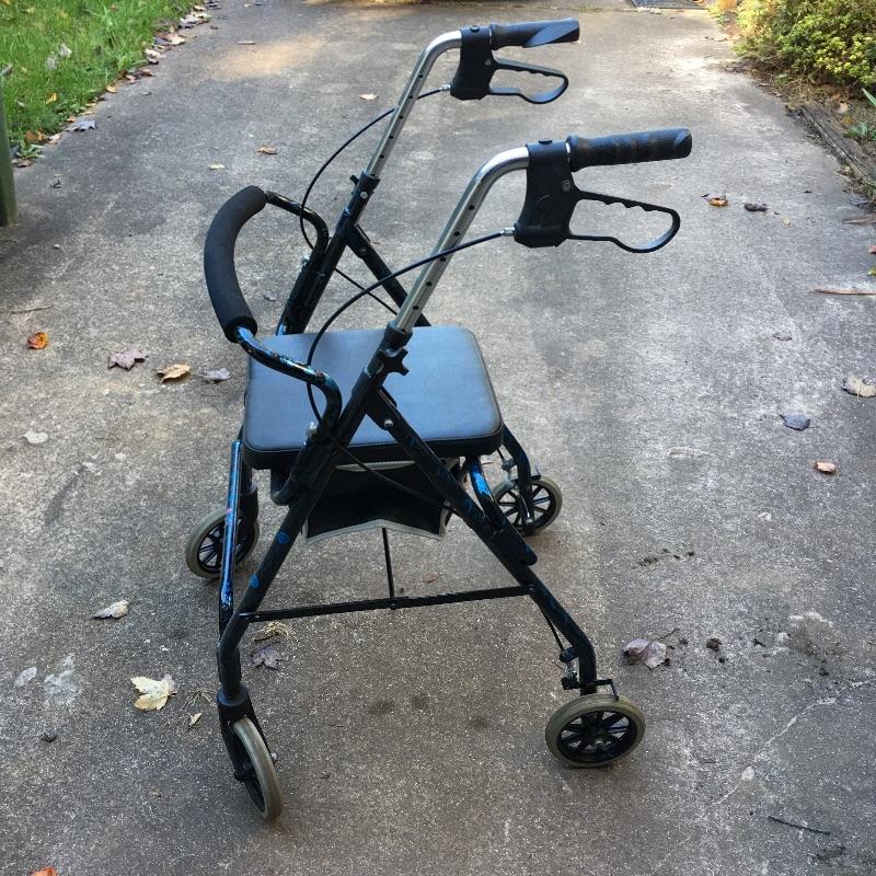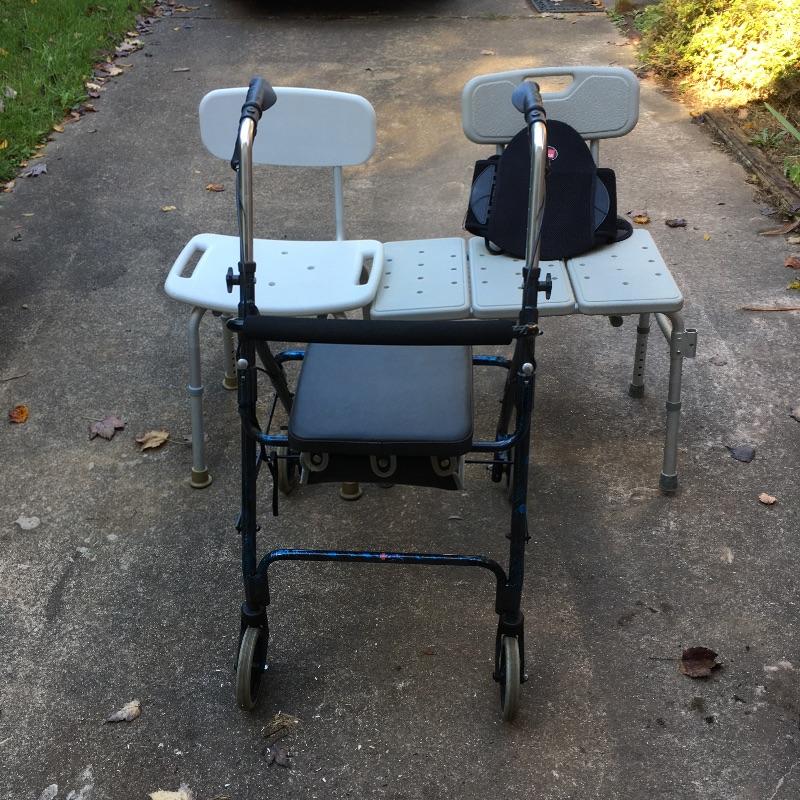 This home health lot includes walker with seat and storage, two shower chairs and a Medi back brace.