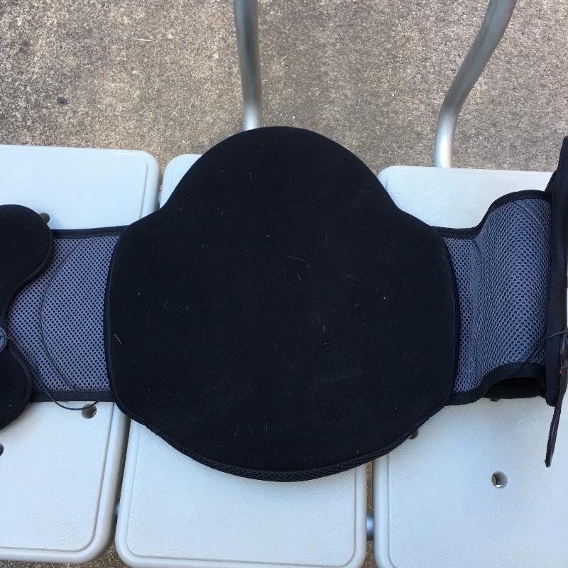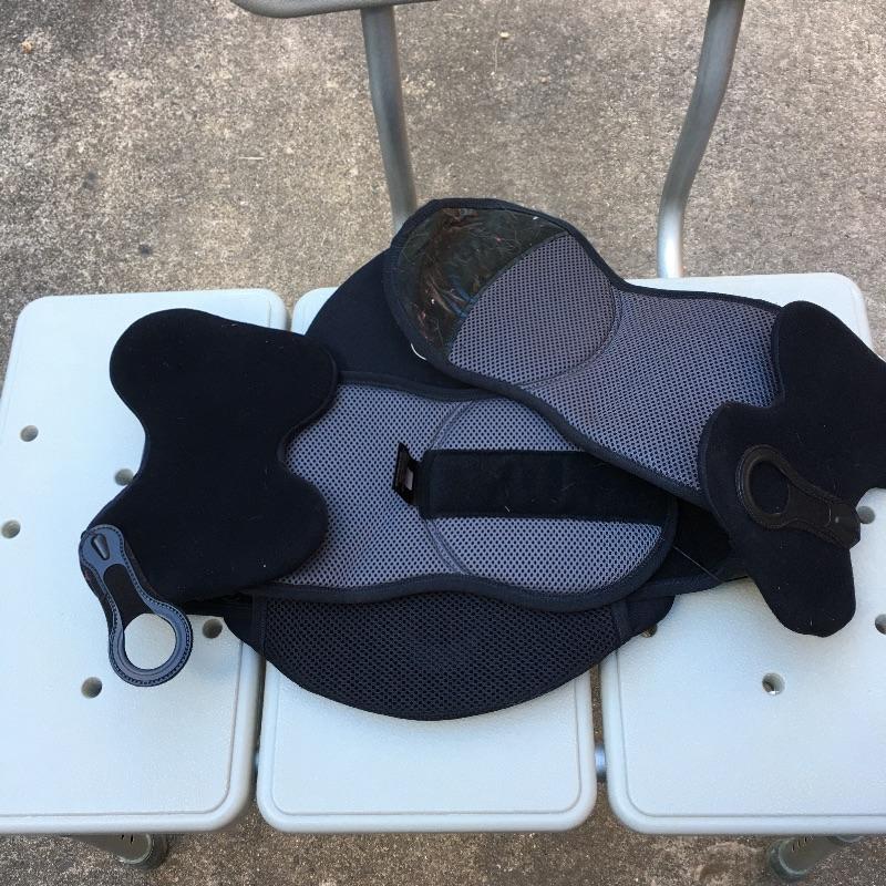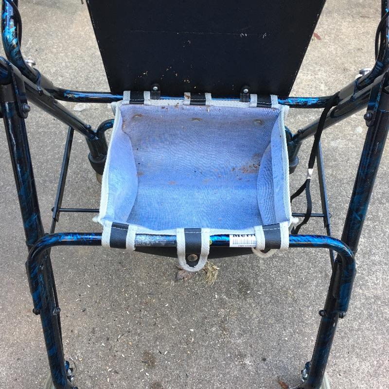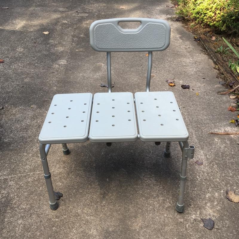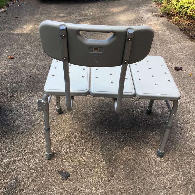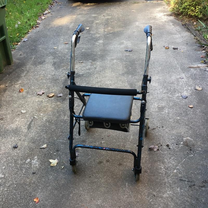 This home health lot includes walker with seat and storage, two shower chairs and a Medi back brace.
