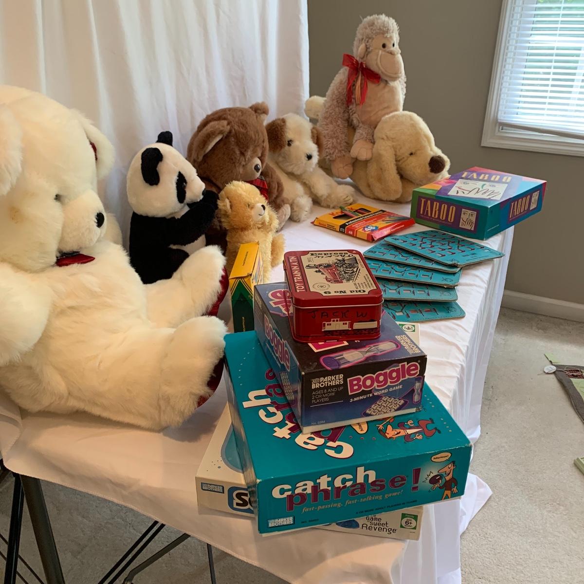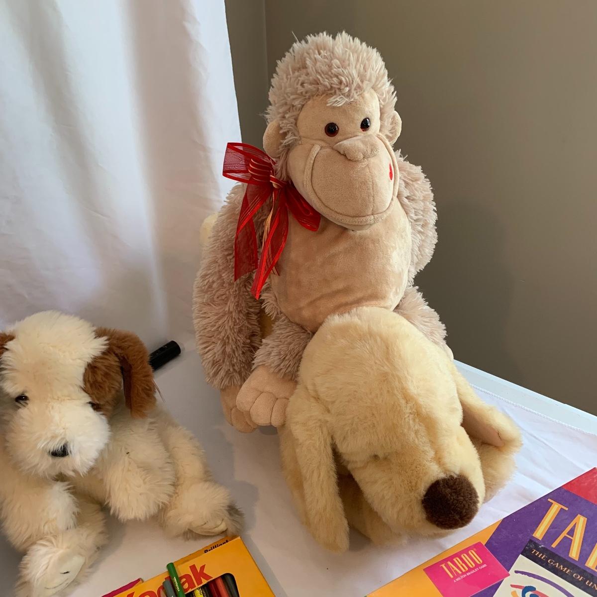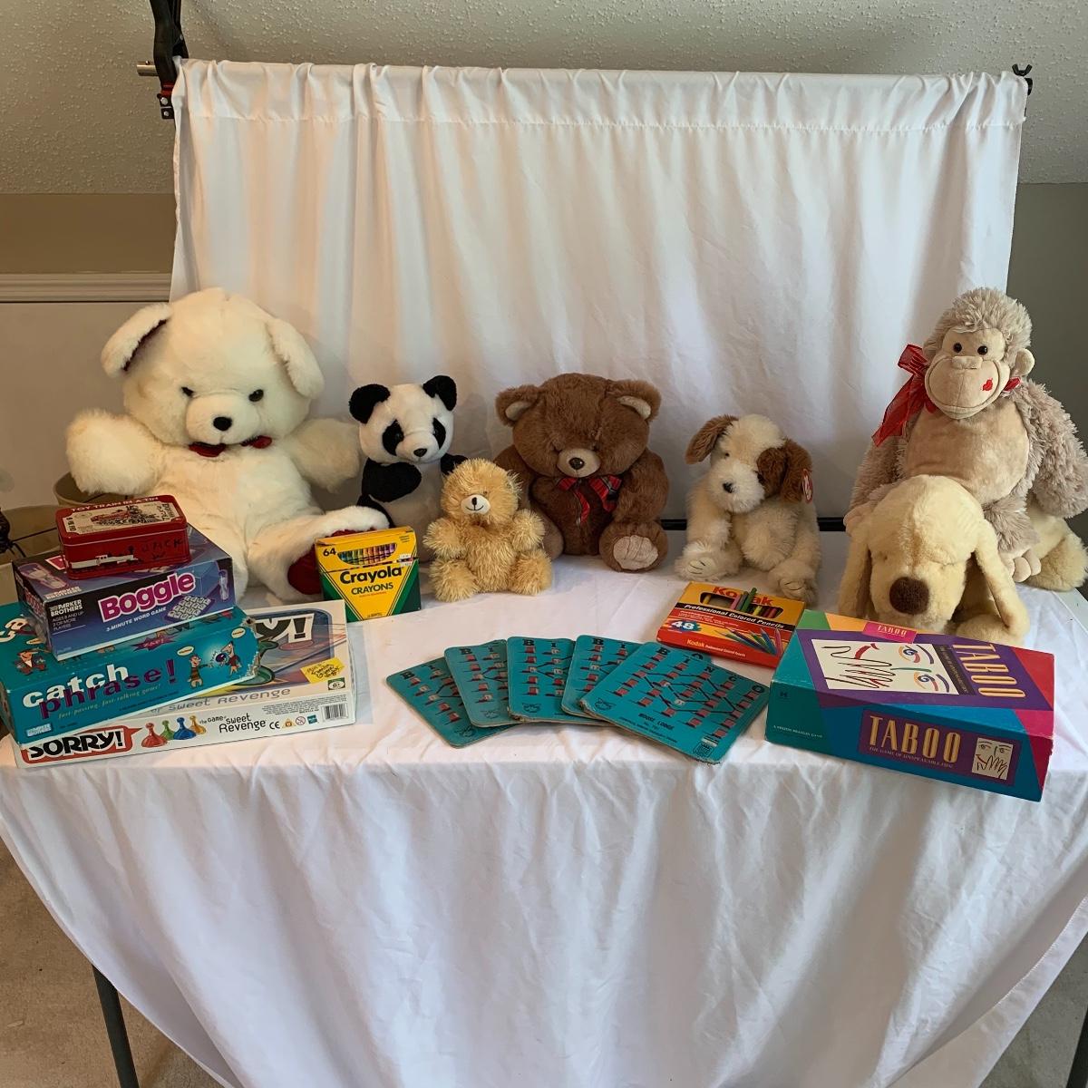 This family fun lot will keep the young and the ahem Lee young entertained! The lot includes several stuffed animals, numerous games, crayons, colored pencils, bingo cards, a cloth checker board w big checkers, and two small pressed wood shelving units. See pics to determine lot content. Bear in the last photo measures 24” tall; bear has a little dirt on his cheek that should wash out easily.
