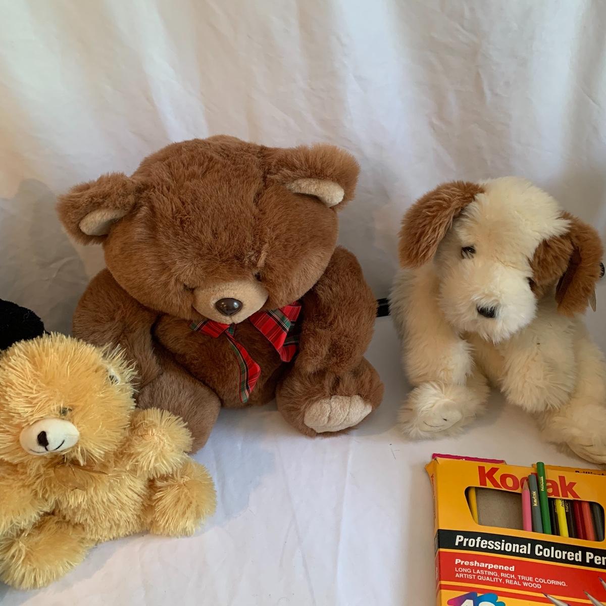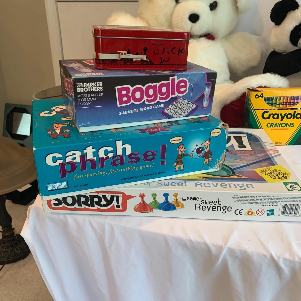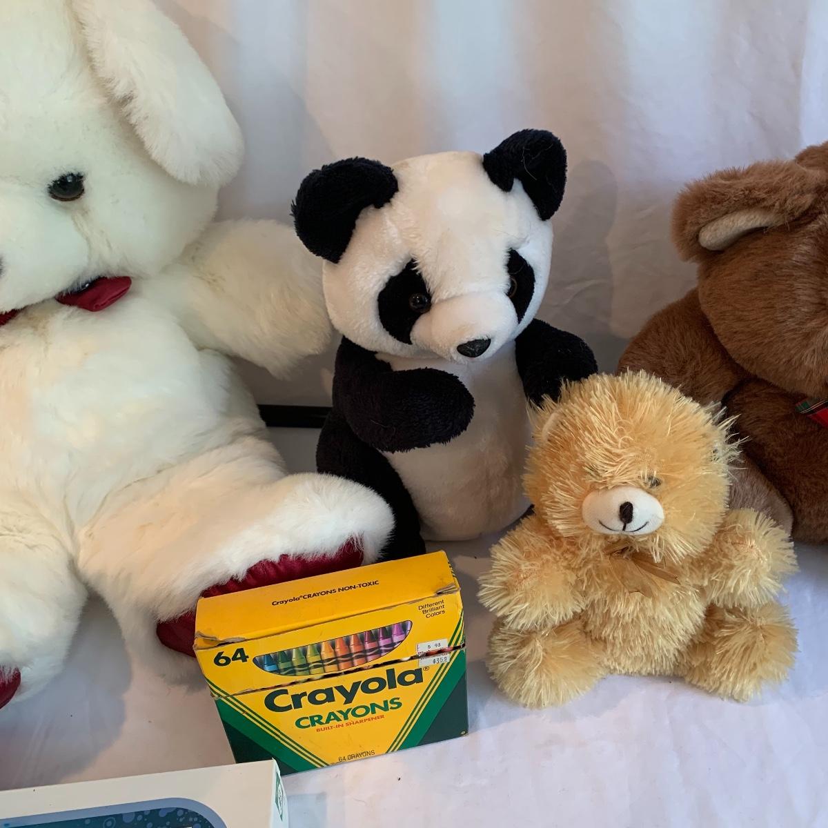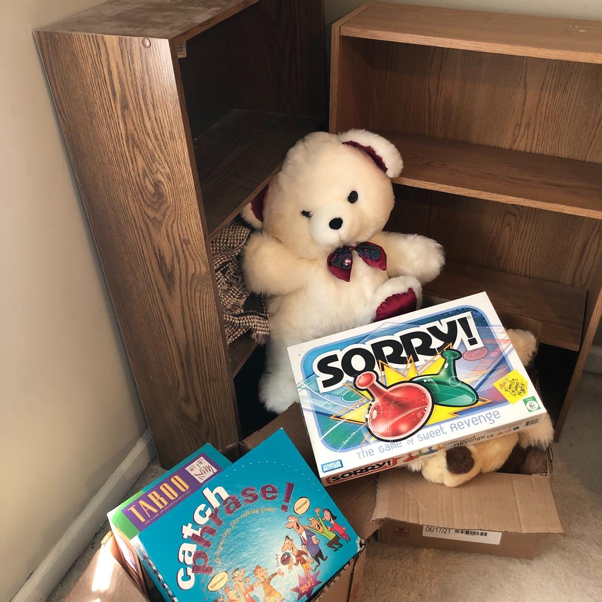 This family fun lot will keep the young and the ahem Lee young entertained! The lot includes several stuffed animals, numerous games, crayons, colored pencils, bingo cards, a cloth checker board w big checkers, and two small pressed wood shelving units. See pics to determine lot content. Bear in the last photo measures 24” tall; bear has a little dirt on his cheek that should wash out easily.