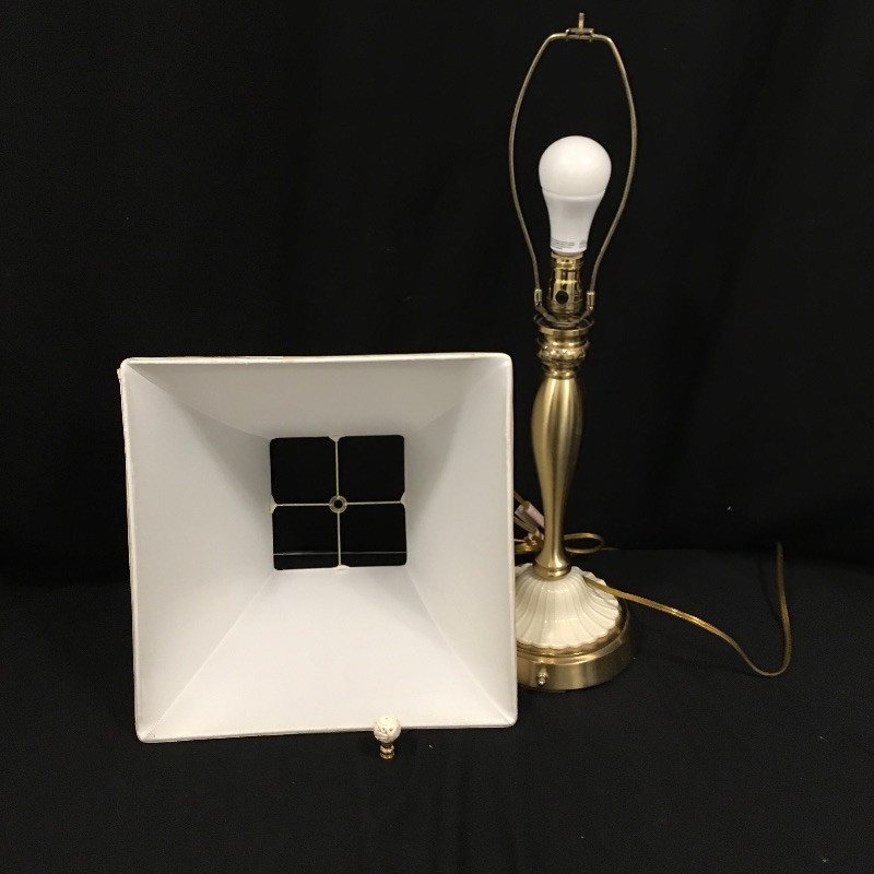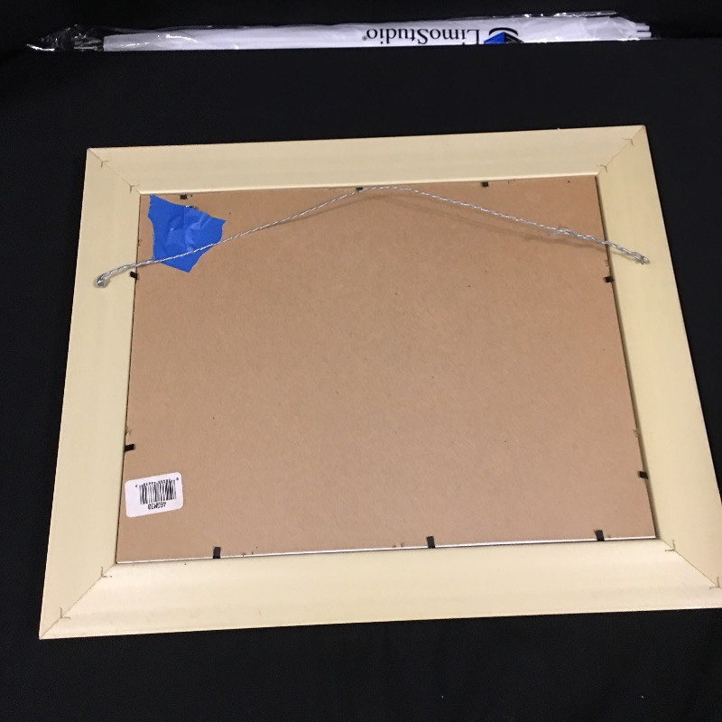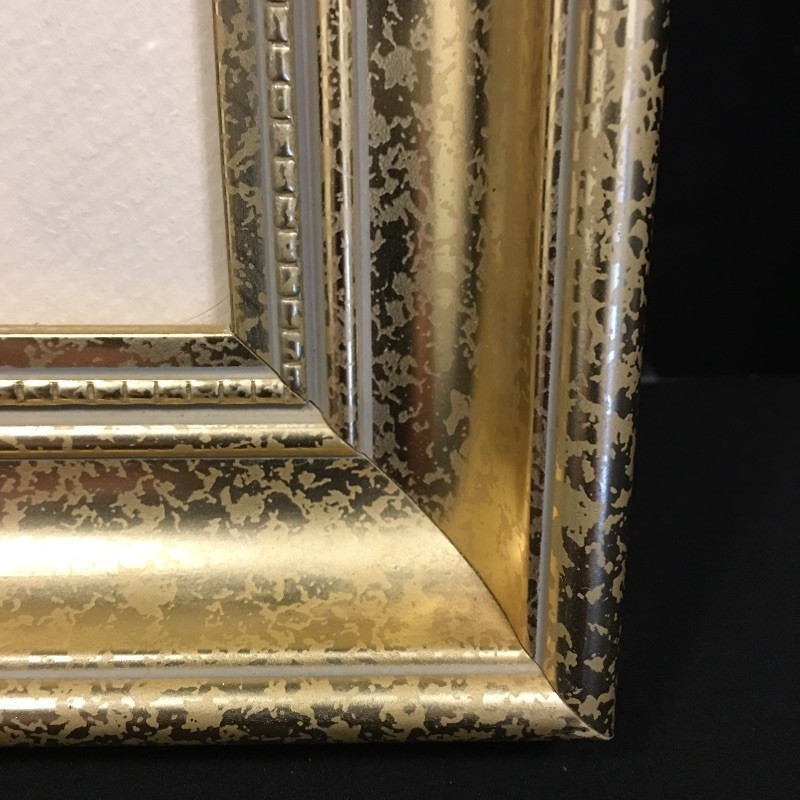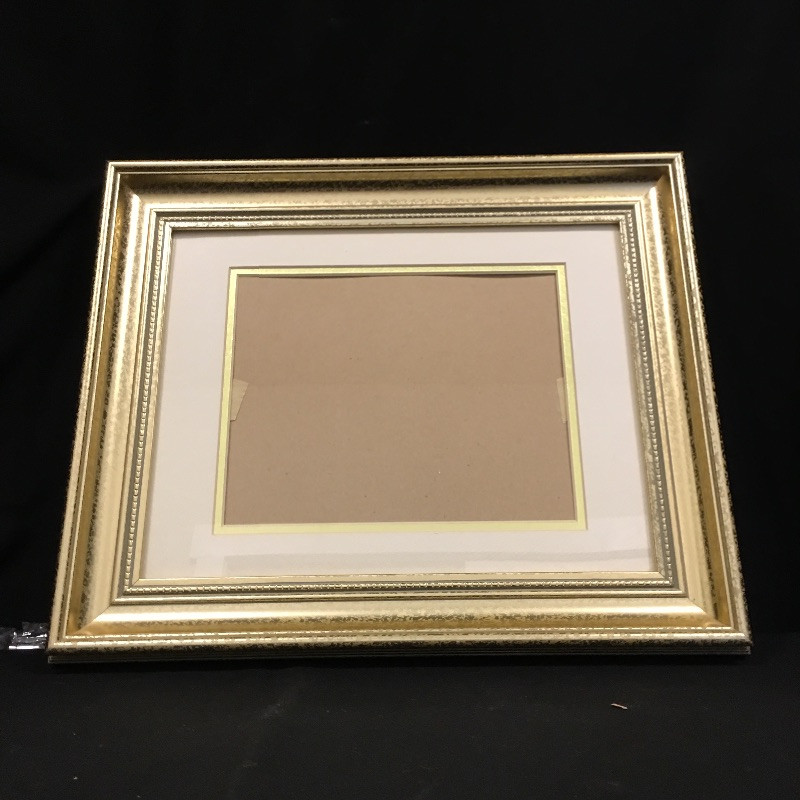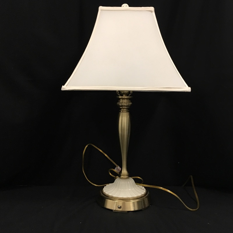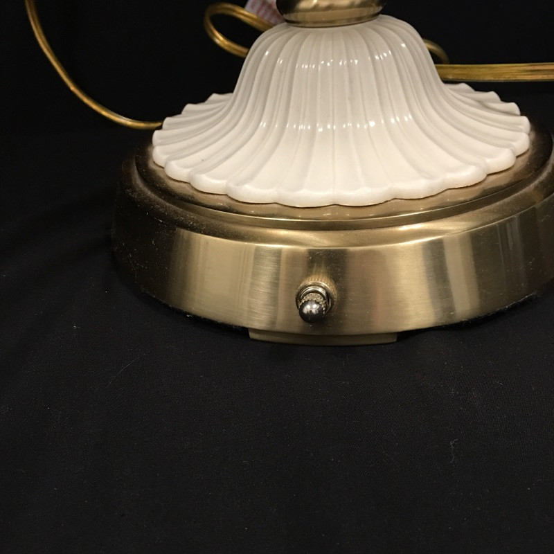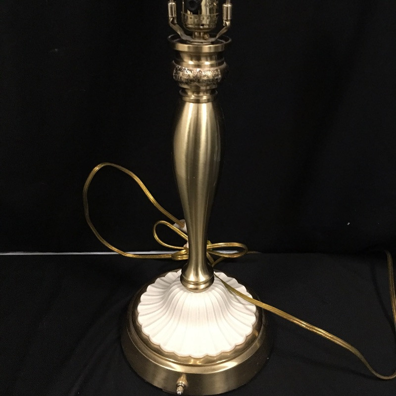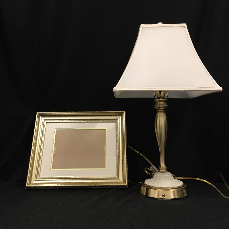 This gold colored lamp is lovely with added white porcelain-like additions and a white shade, see images. The picture frame is gold colored and is matted. Lamp measures 26.5” tall and 8”D base.