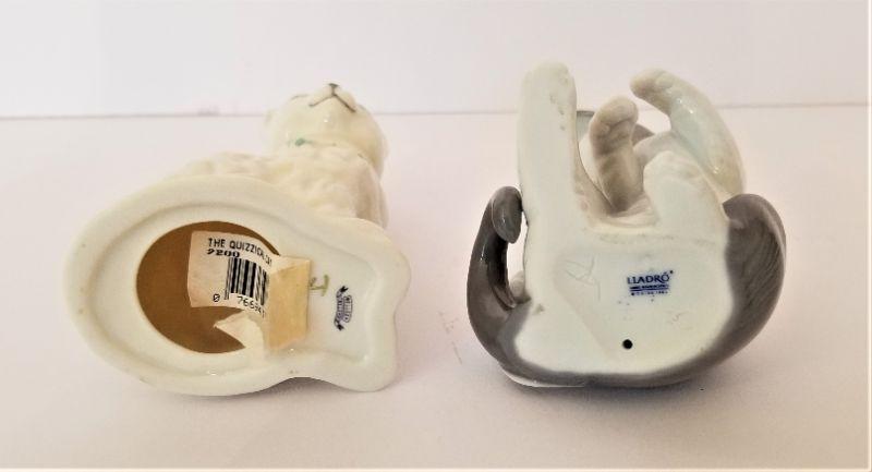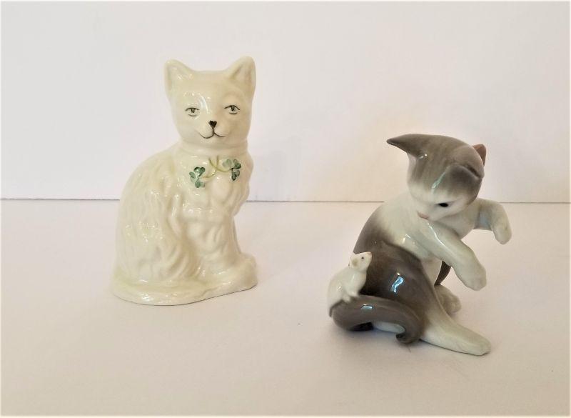 Two Cat figurines - one Beleek and one Lladro. No boxes. Beleek stands 4" tall - Lladro is 3.5" tall. Good condition.