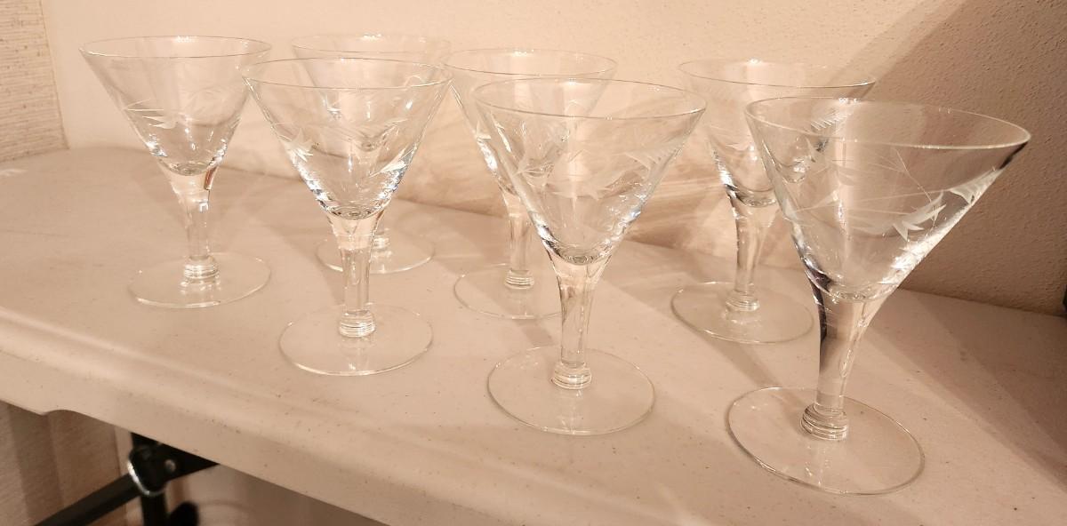 Nice lot of 7 vintage crystal martini glasses - each about 5" tall - acid etched foliate design. All in good condition.