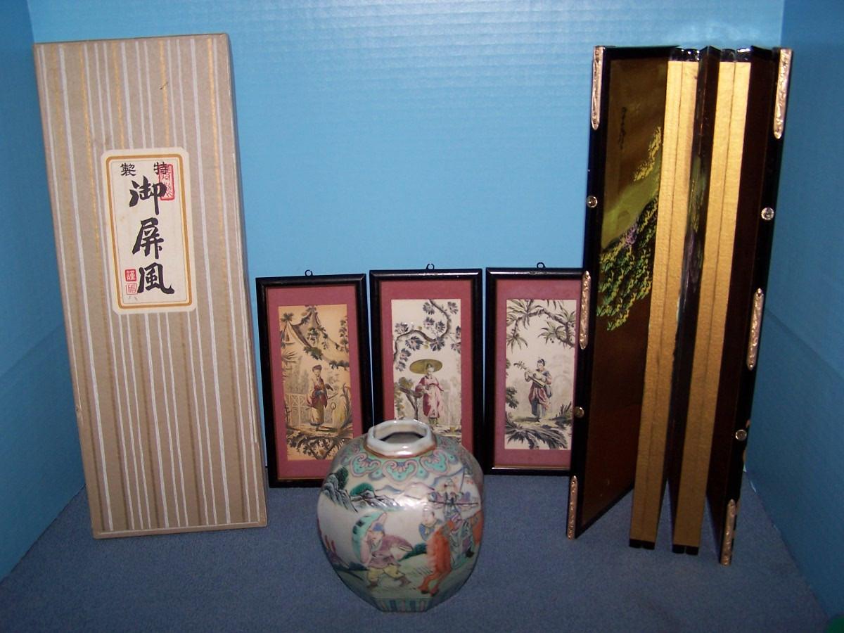 THESE ARE LOVELY VINTAGE ASIAN ITEMS! SMALL SCREEN HAS A BOX. VASE-4 3/4'' TALL, IS MARKED, HAS SOME DAMAGE.