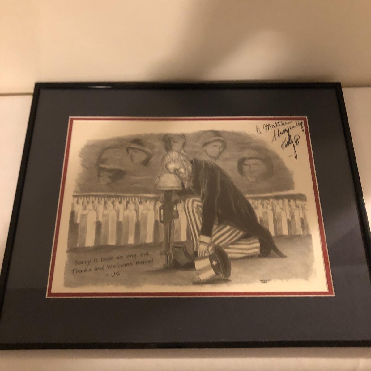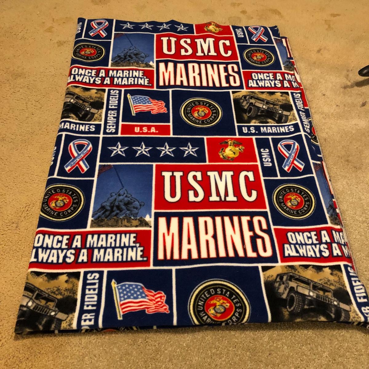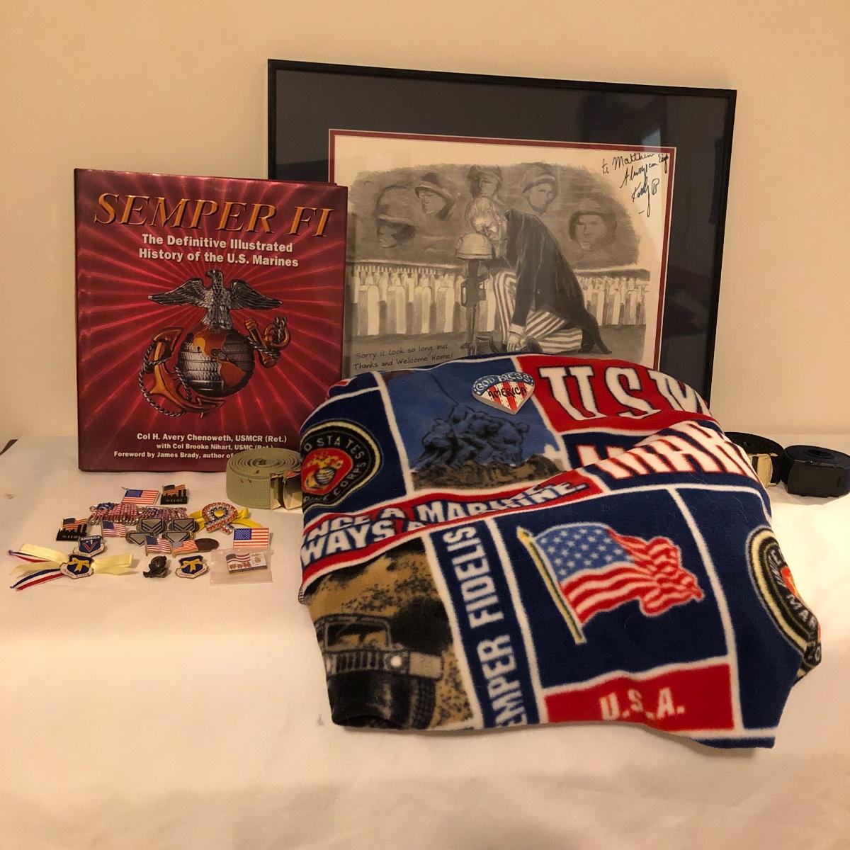 Once a Marine always a Marine. Your Marine will thank you for getting them this collection. Lot includes throw, Semper Fi book, three belts with buckles, framed and matted artwork and a collection of pins. Throw measures 60” x 90”.
