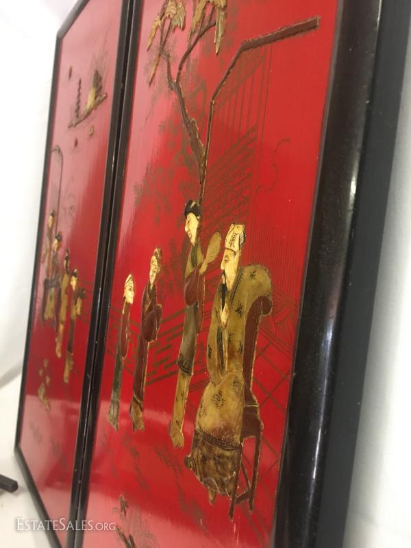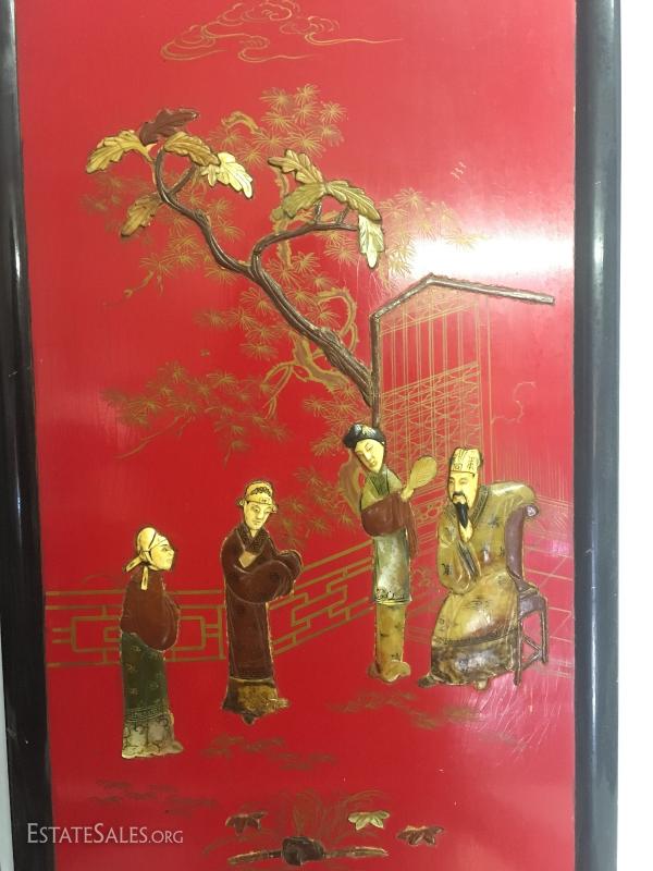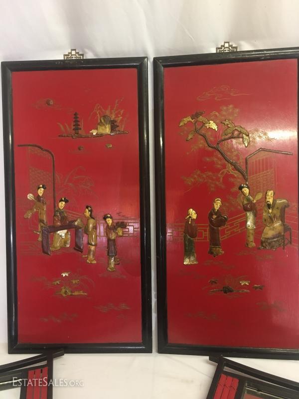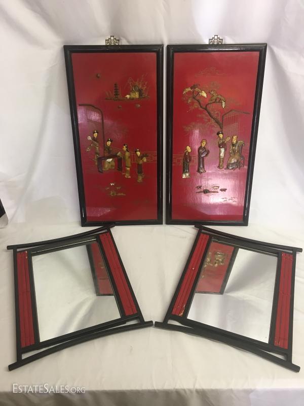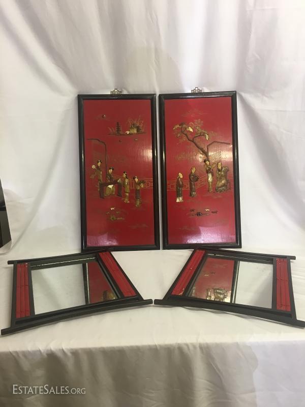 Two black framed red panels with mixed media overlays. One small piece missing, please review photos. Each measures, 28"x 14". Two mirrors on black metal framing and red detail work. Each measures 20" x 17", vertical hang only. Items in lot match nicely. This lot is available for shipping or local pick up in Waynesville, NC.