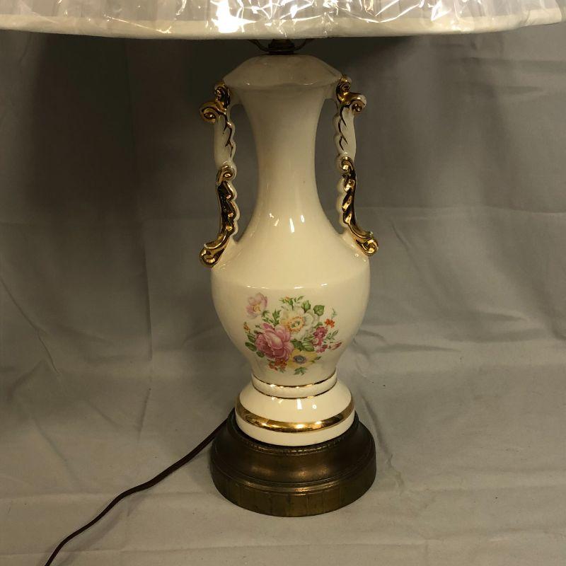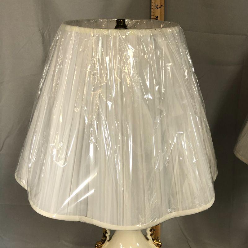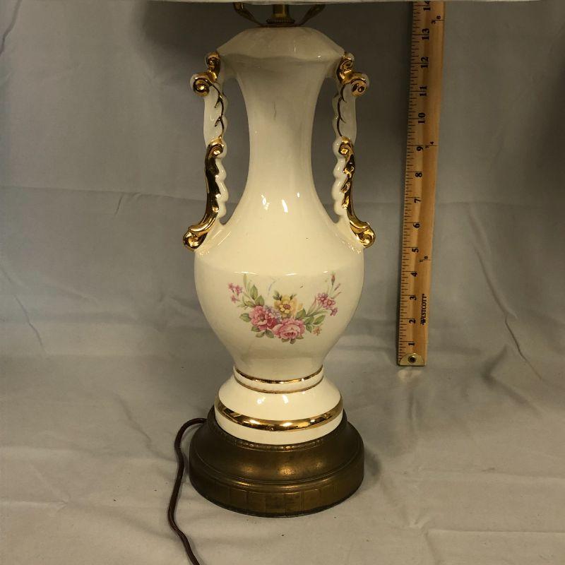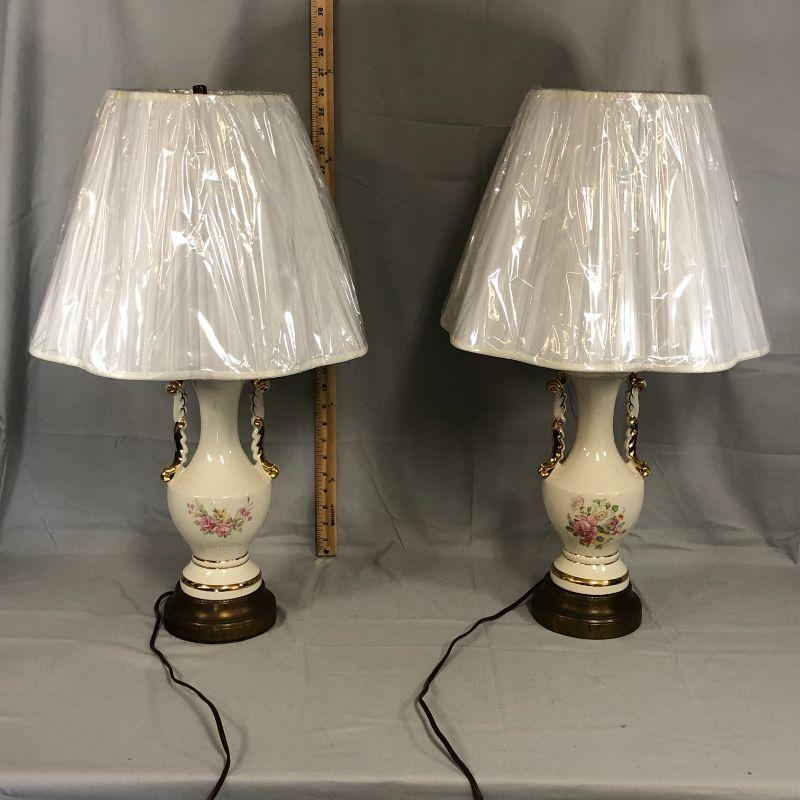 The shades appear new and are in excellent condition. The lamps stand about 27" tall. The bases are off white ceramic with gold paint trim on the handles and around the base. There is a floral display on each on just one side. Consignor states that they work.