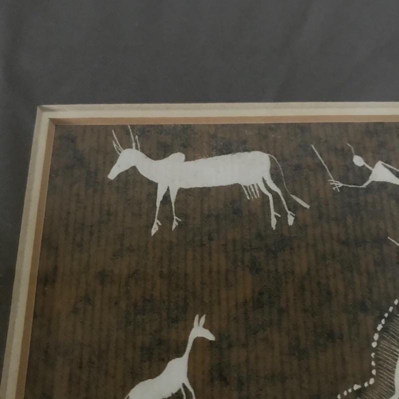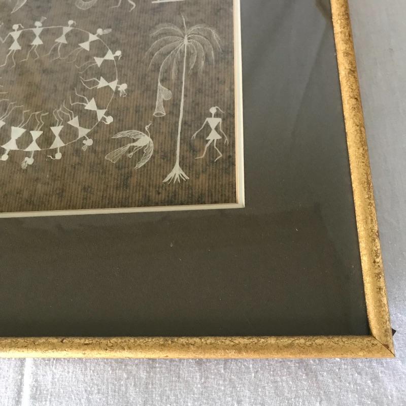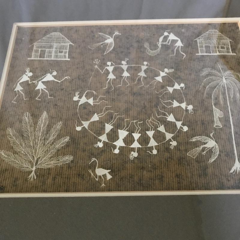 Two stunning primitive scenes of Warli art are behind glass in matching frames. Close up they appear to made from textured paper and depict fascinating primitive tribal scenes. Both frames measure approximately 16.75” x 14.25”. See photos. Shipping available. Please call UPS with dimensions at 828-252-6930 for a shipping quote prior to bidding.