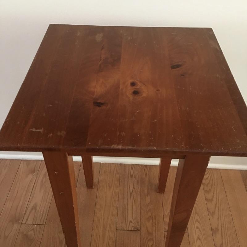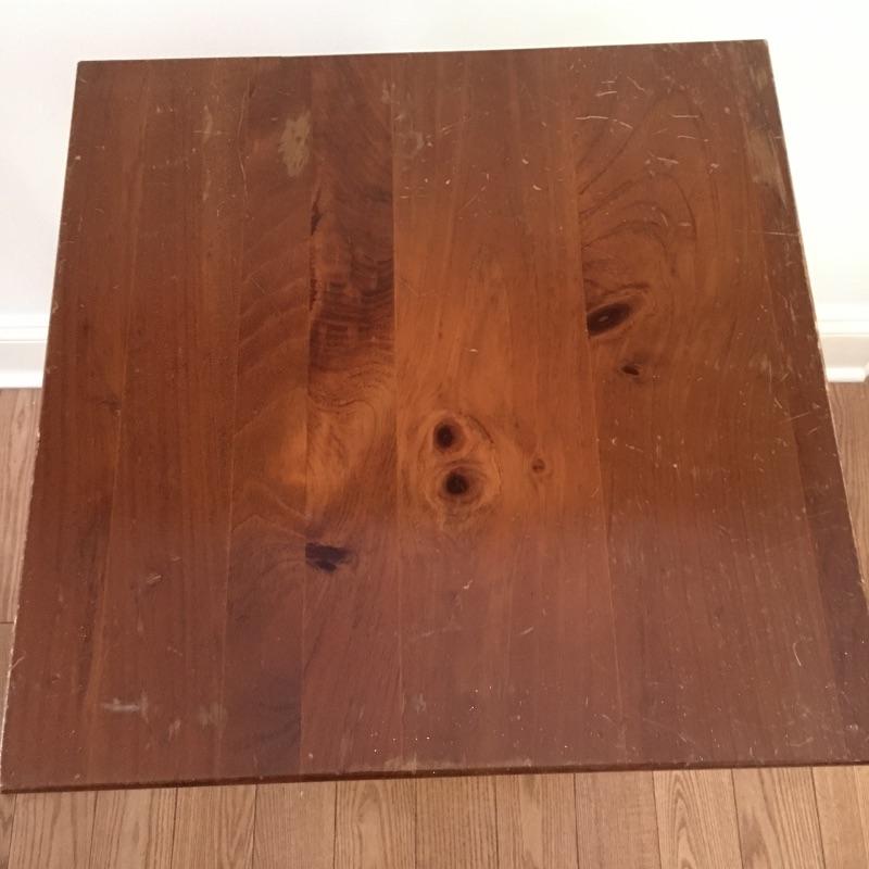 Coffee table measures 24” x 27” x 15.5”. Both tables have some scratches and blemishes on top. A little bit of elbow grease and this pair could look great.
