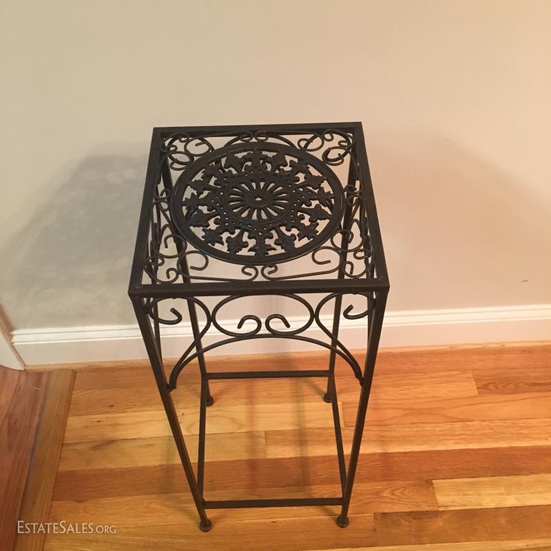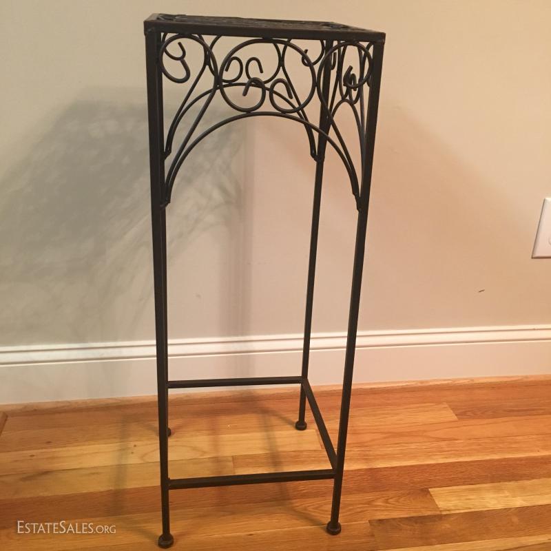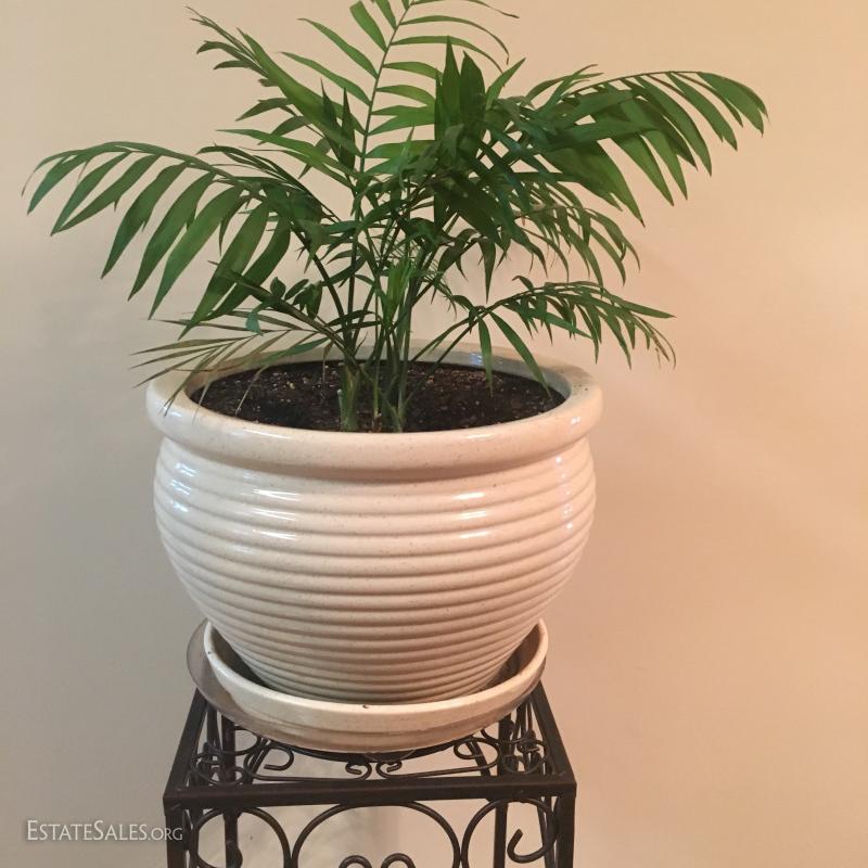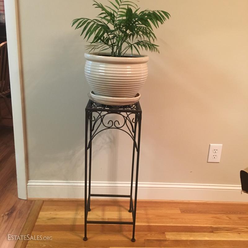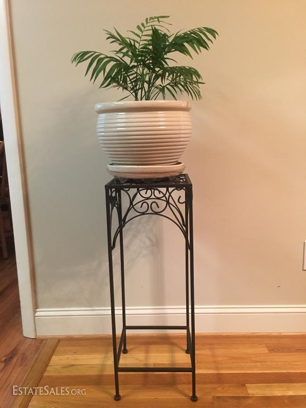 Plant in ceramic pot and dish combo. Metal stand 10" x 11" x 28". Planter is 13" diameter. This lot is available for local pick up in Asheville, NC only.